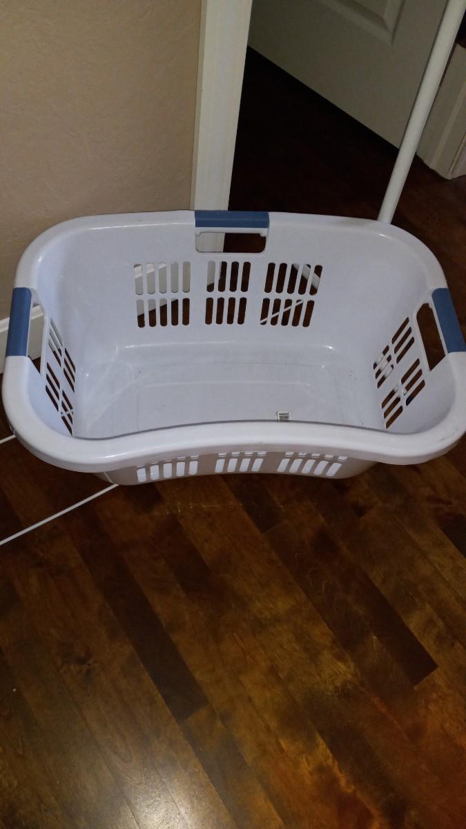 LOT 312 GARMENT RACK ON WHEELS AND A LAUNDRY BASKET
