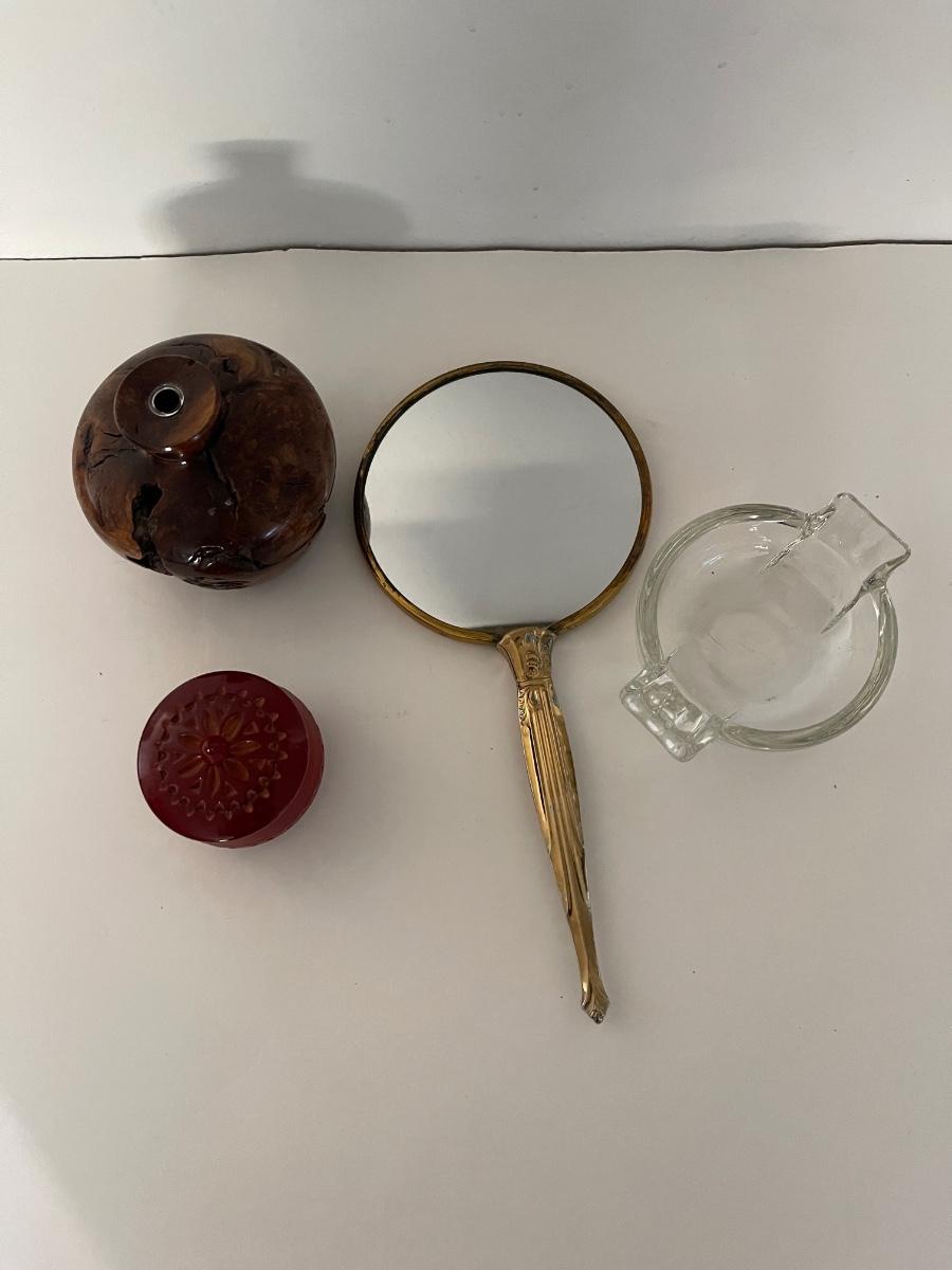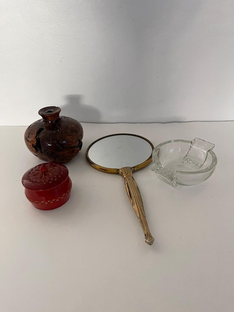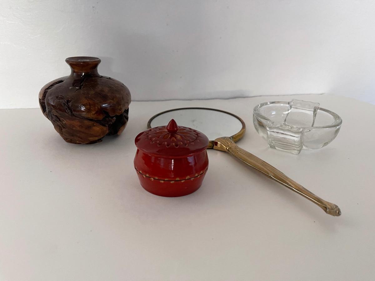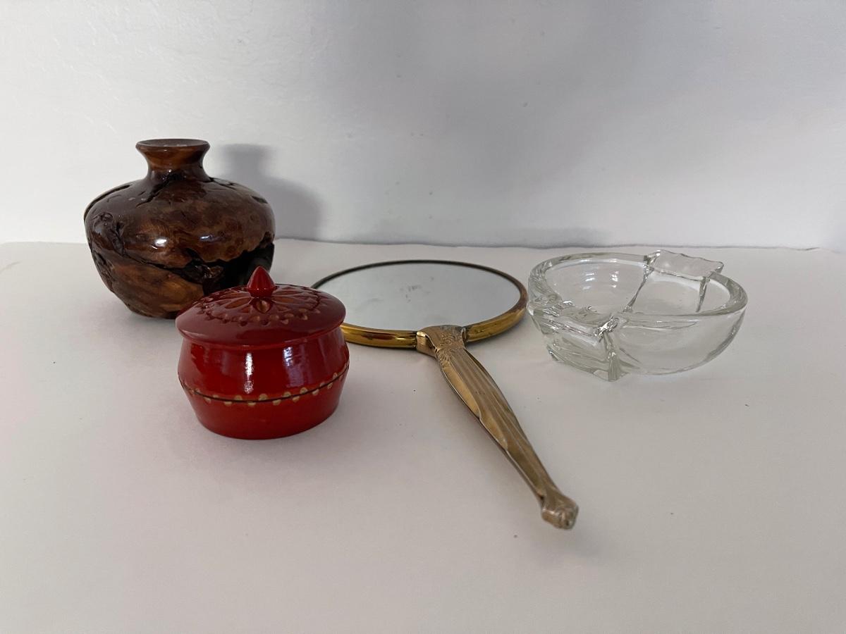 Small Wooden bud vase, vintage mirror, ashtray, and trinket box
