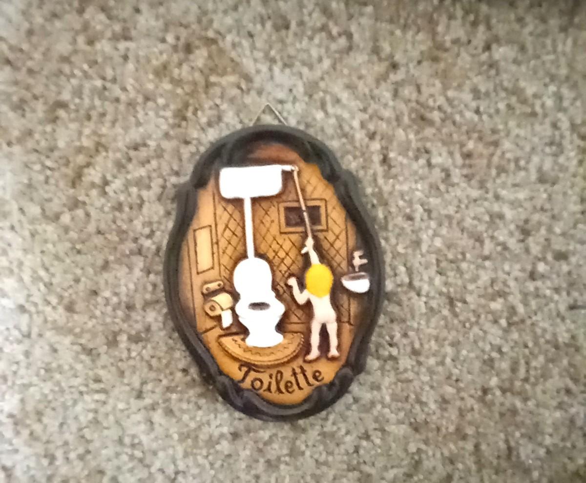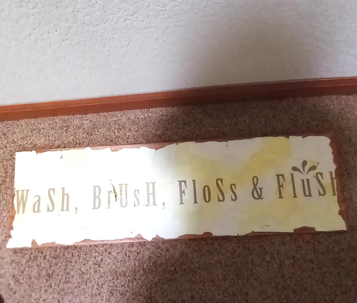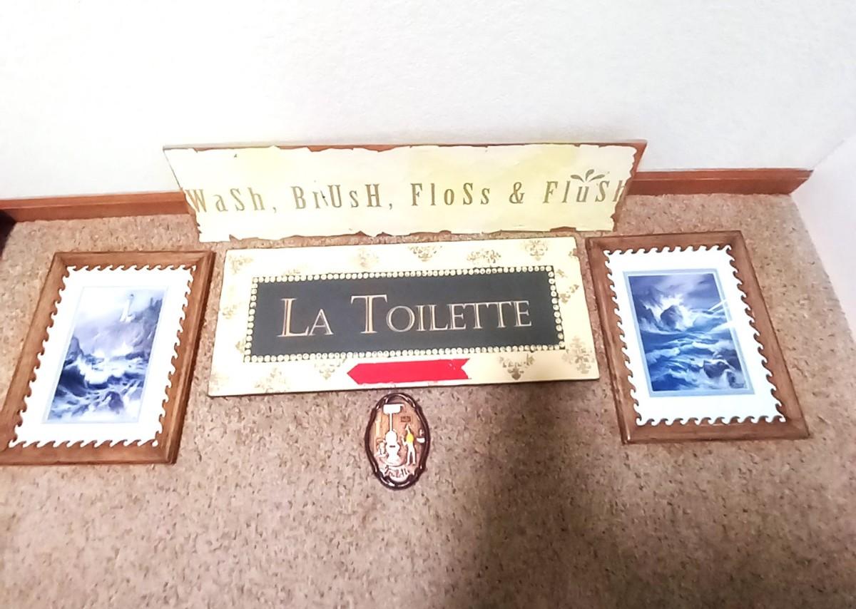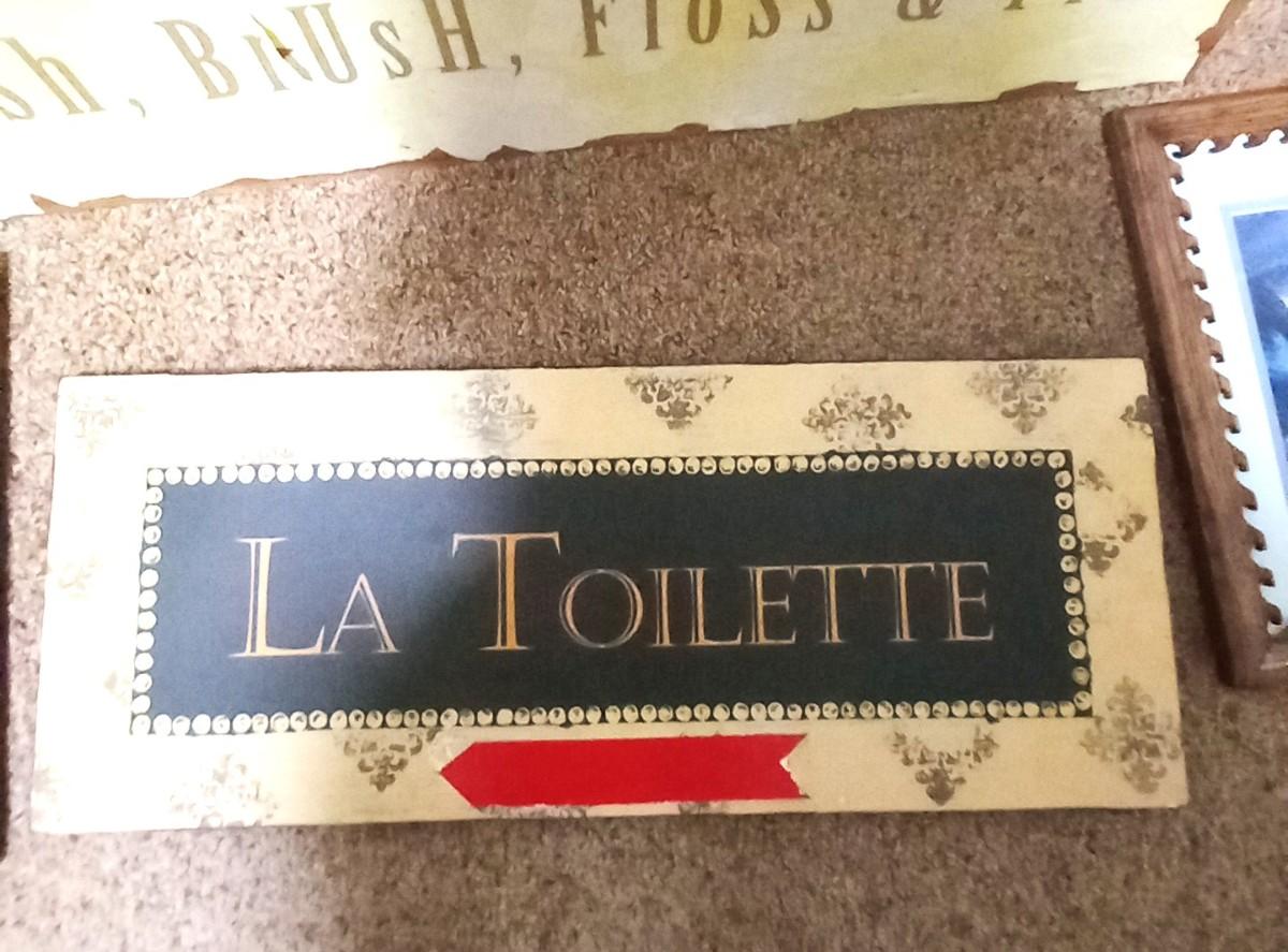 BATHROOM SIGNAGE "LA TOILETTE" 20X8 "WASH BRUSH FLOSS AND FLUSH" 24X8, 2 FRAMED PHOTOS,9X11 AND SMALL PLAQUE