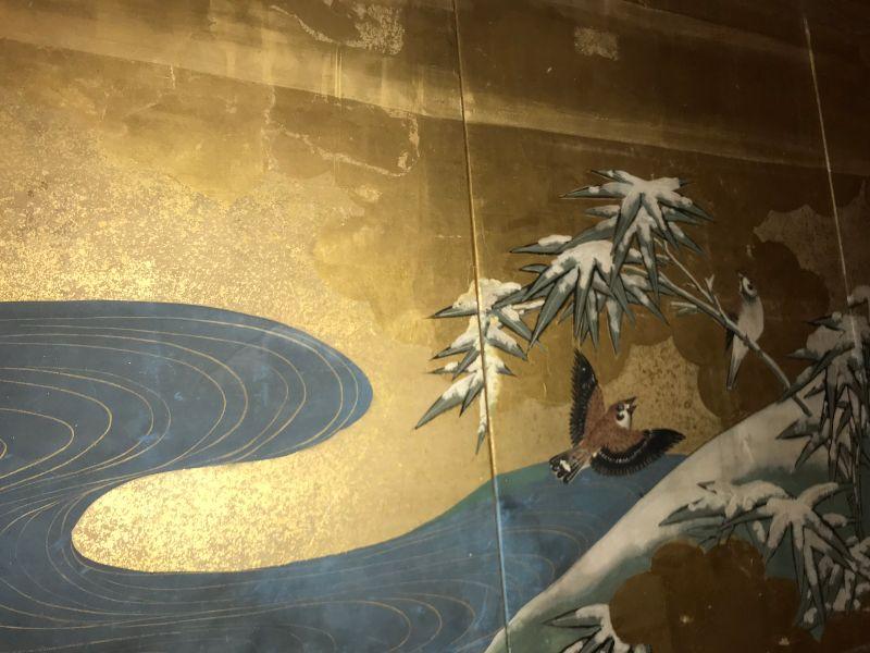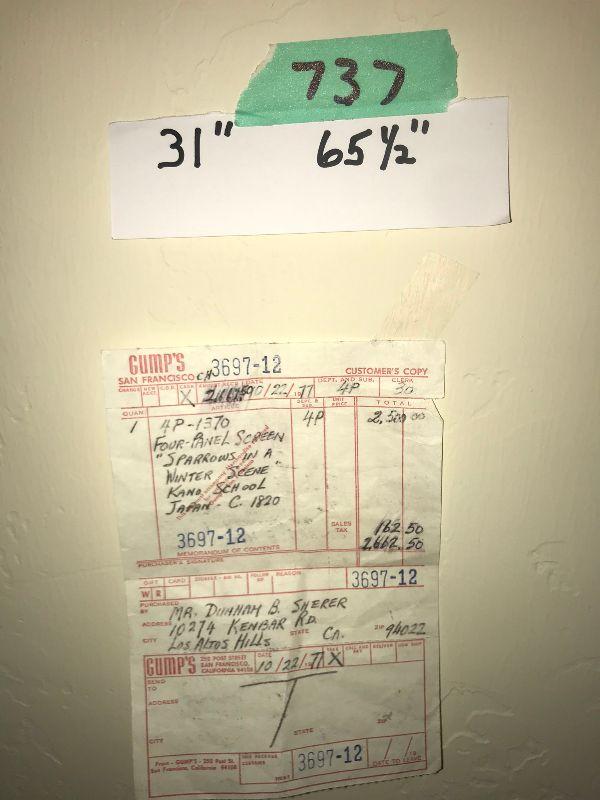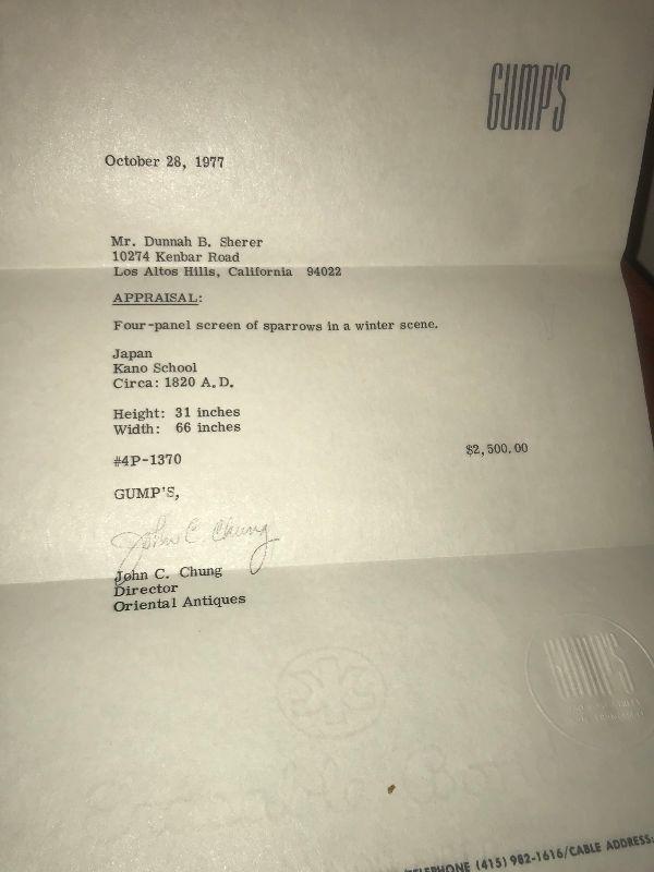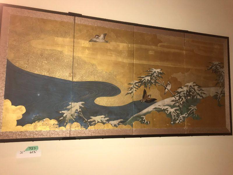 4 panel screen "Sparrows in Winter Scene" Kano School Japan c 1820 $2,500.00