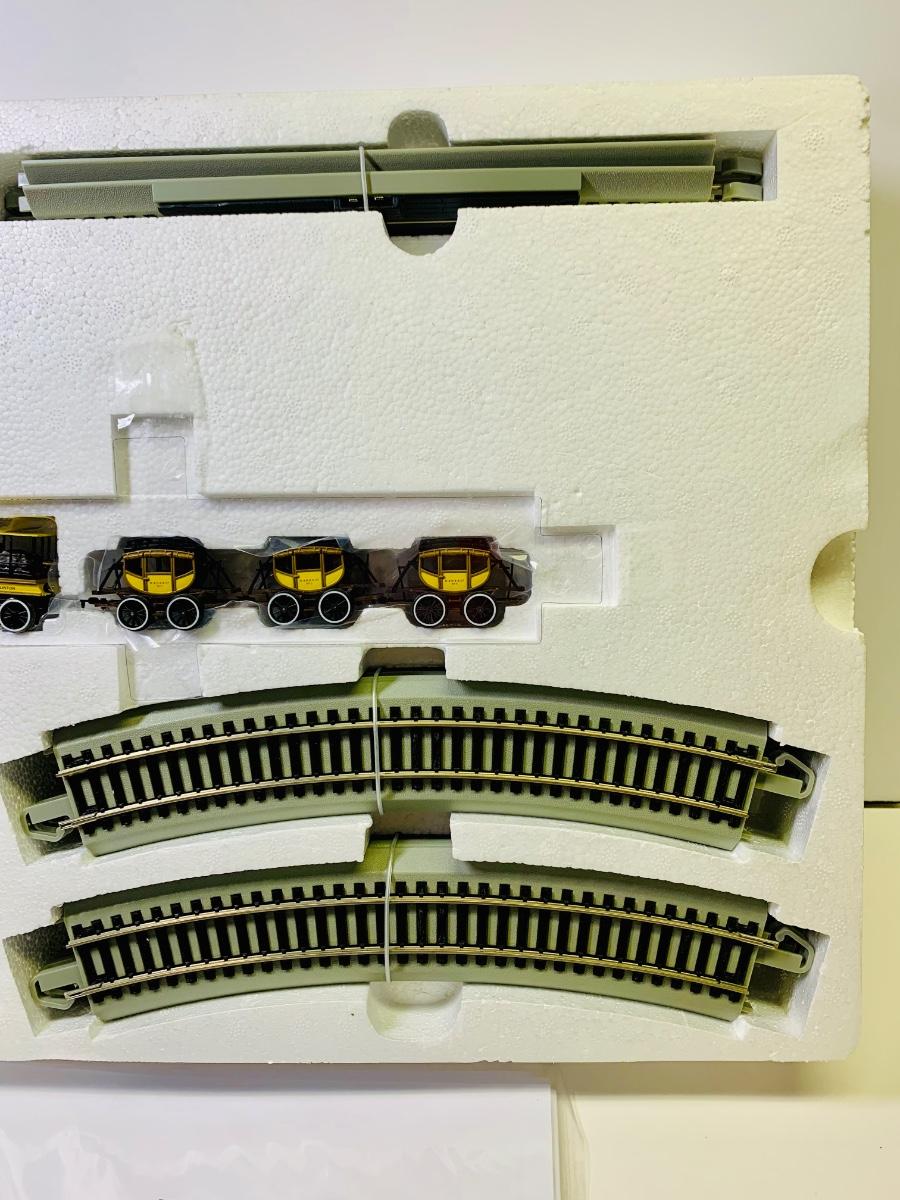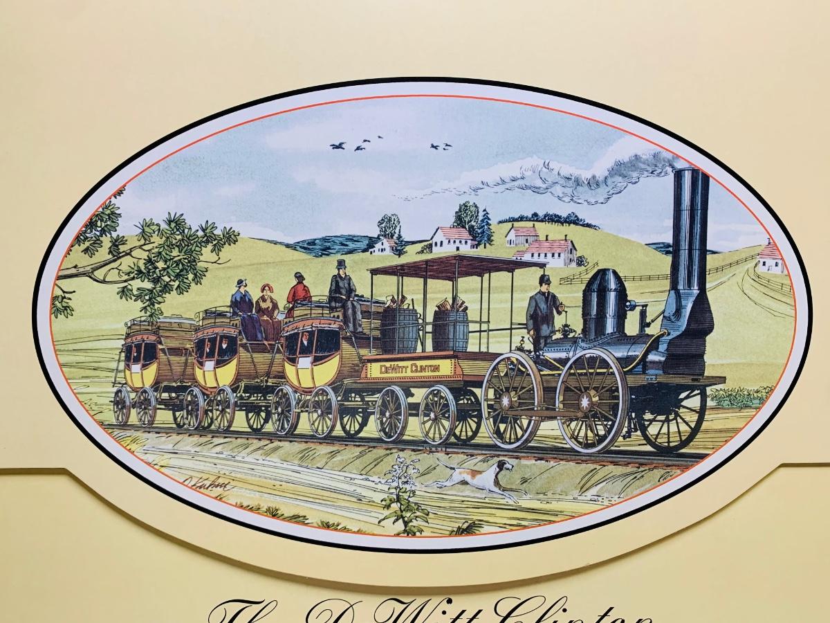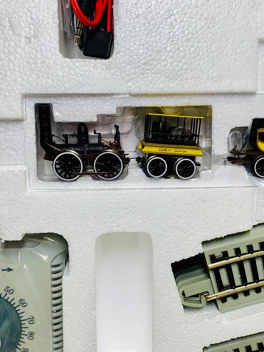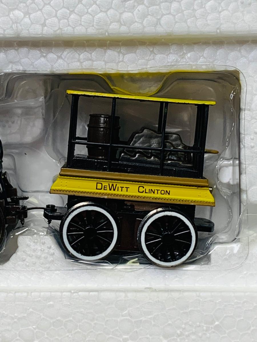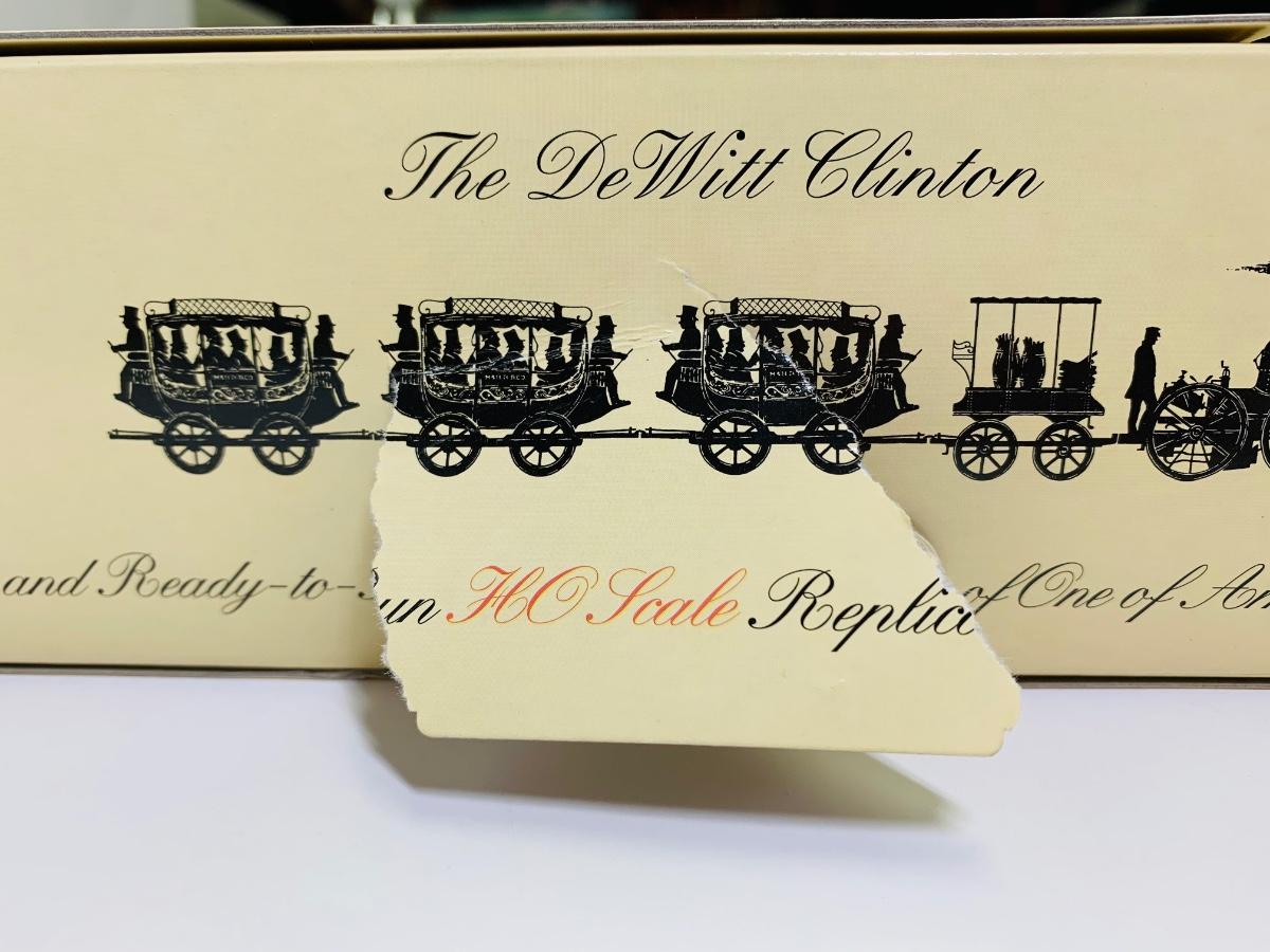 Reproduction of the train named for the Father of the Erie Canal.. The set includes engine, tender, and 3 cars plus track and transformer. This is a really unique train set. The box is the original box and has a tear on the end.