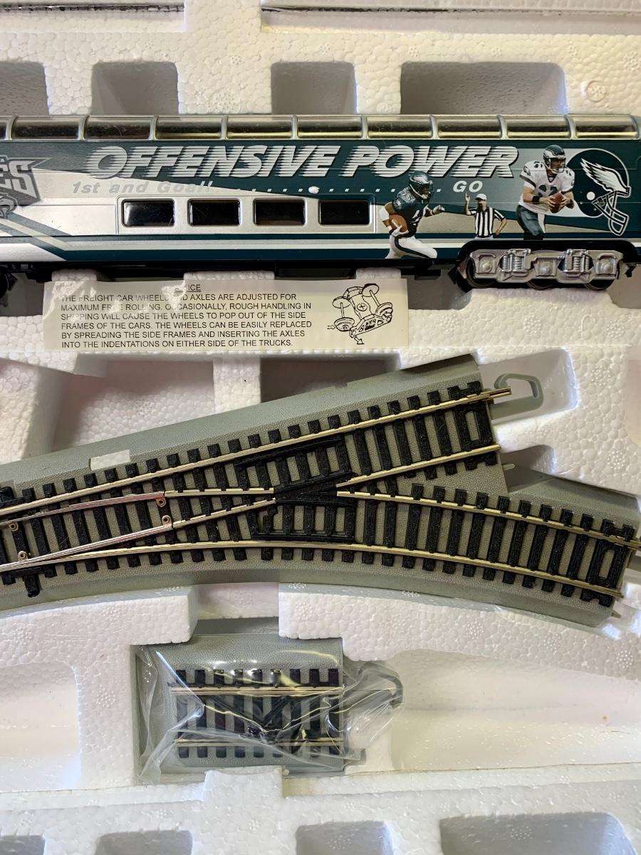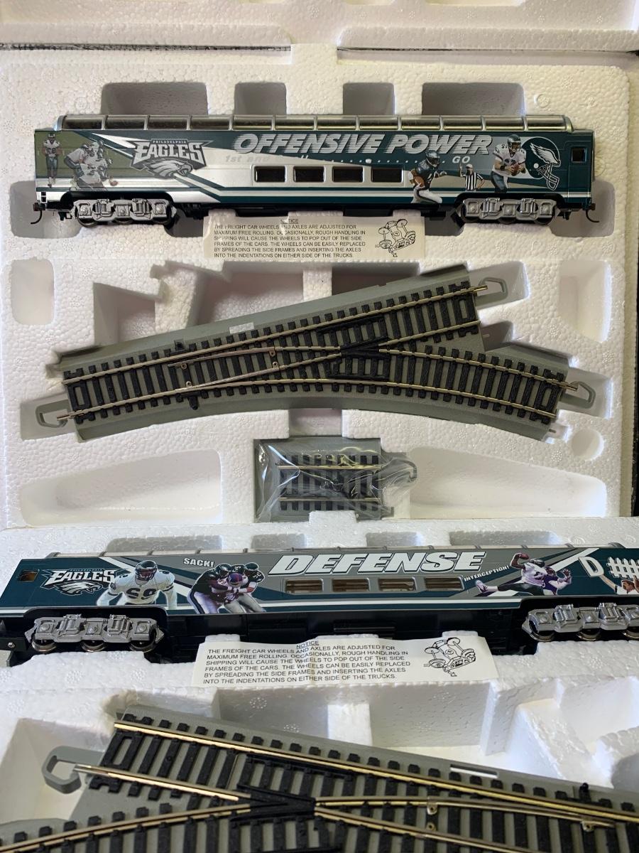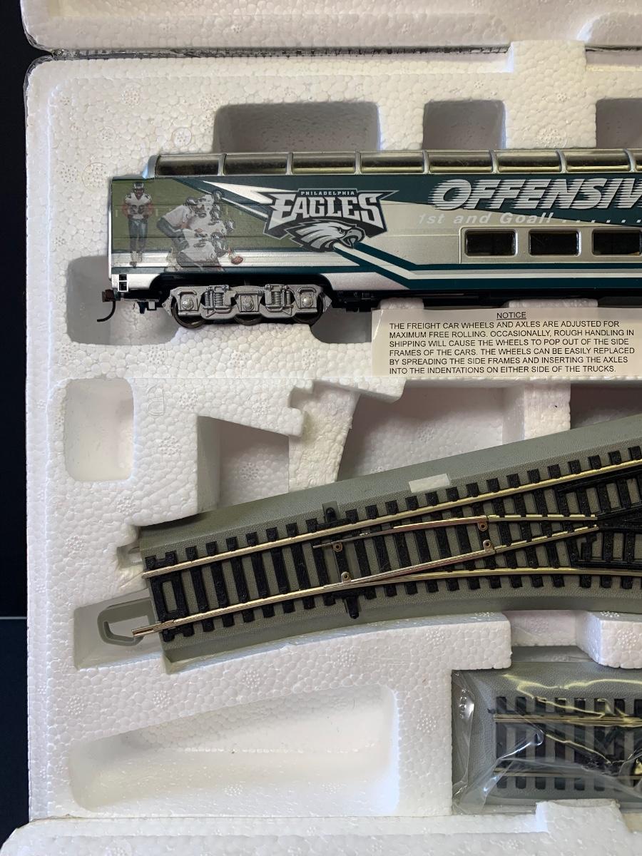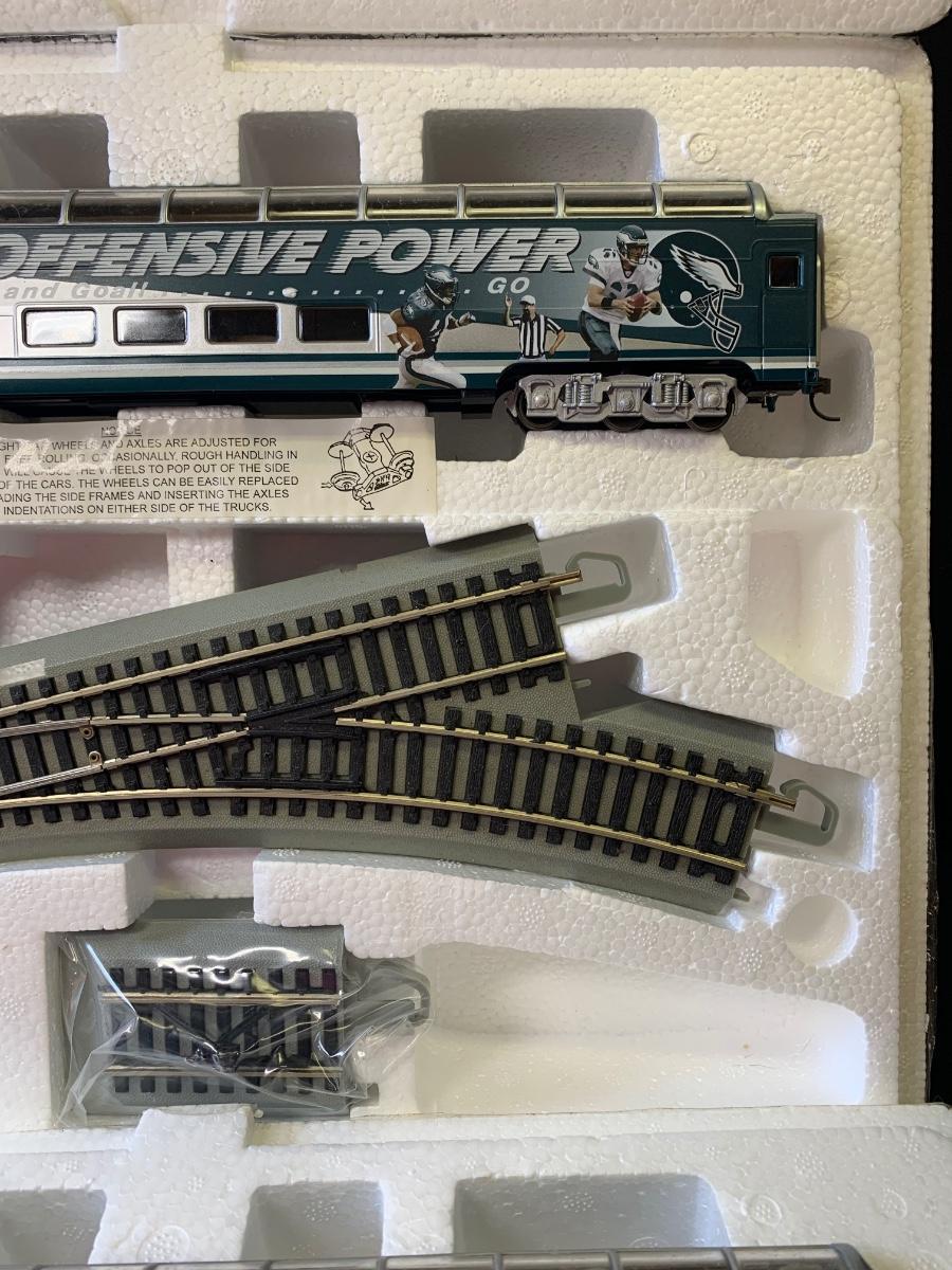 Includes 4 pieces of track. Authentic Philadelphia Eagles Bachman E-Z Track H0 Train with the original Styrofoam/packing- no box, may or may not have the COA, if the packaging envelope was sealed it was not opened to verify the COA