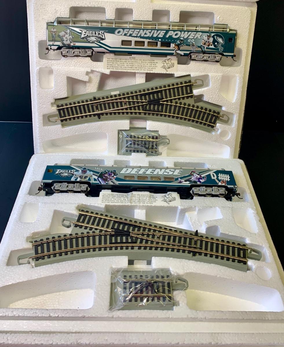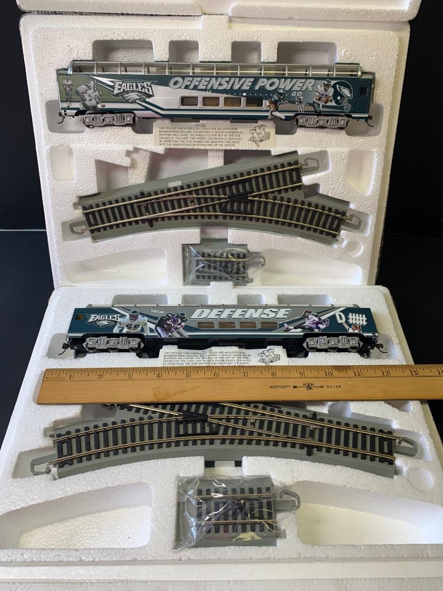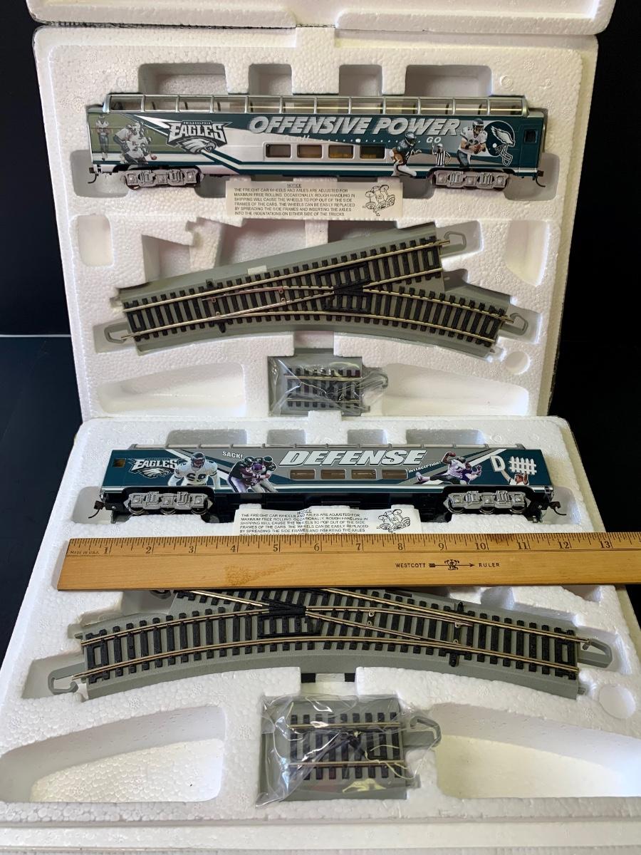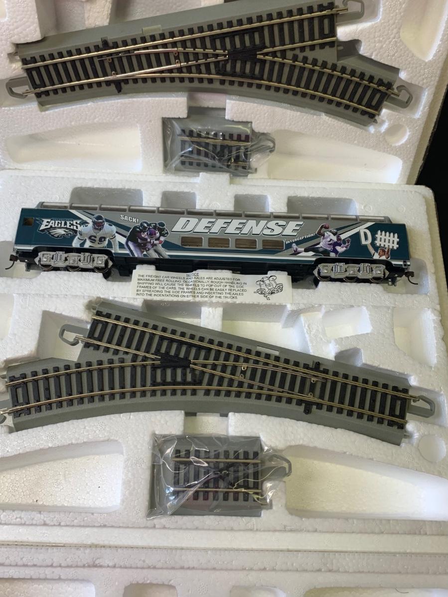 Includes 4 pieces of track. Authentic Philadelphia Eagles Bachman E-Z Track H0 Train with the original Styrofoam/packing- no box, may or may not have the COA, if the packaging envelope was sealed it was not opened to verify the COA