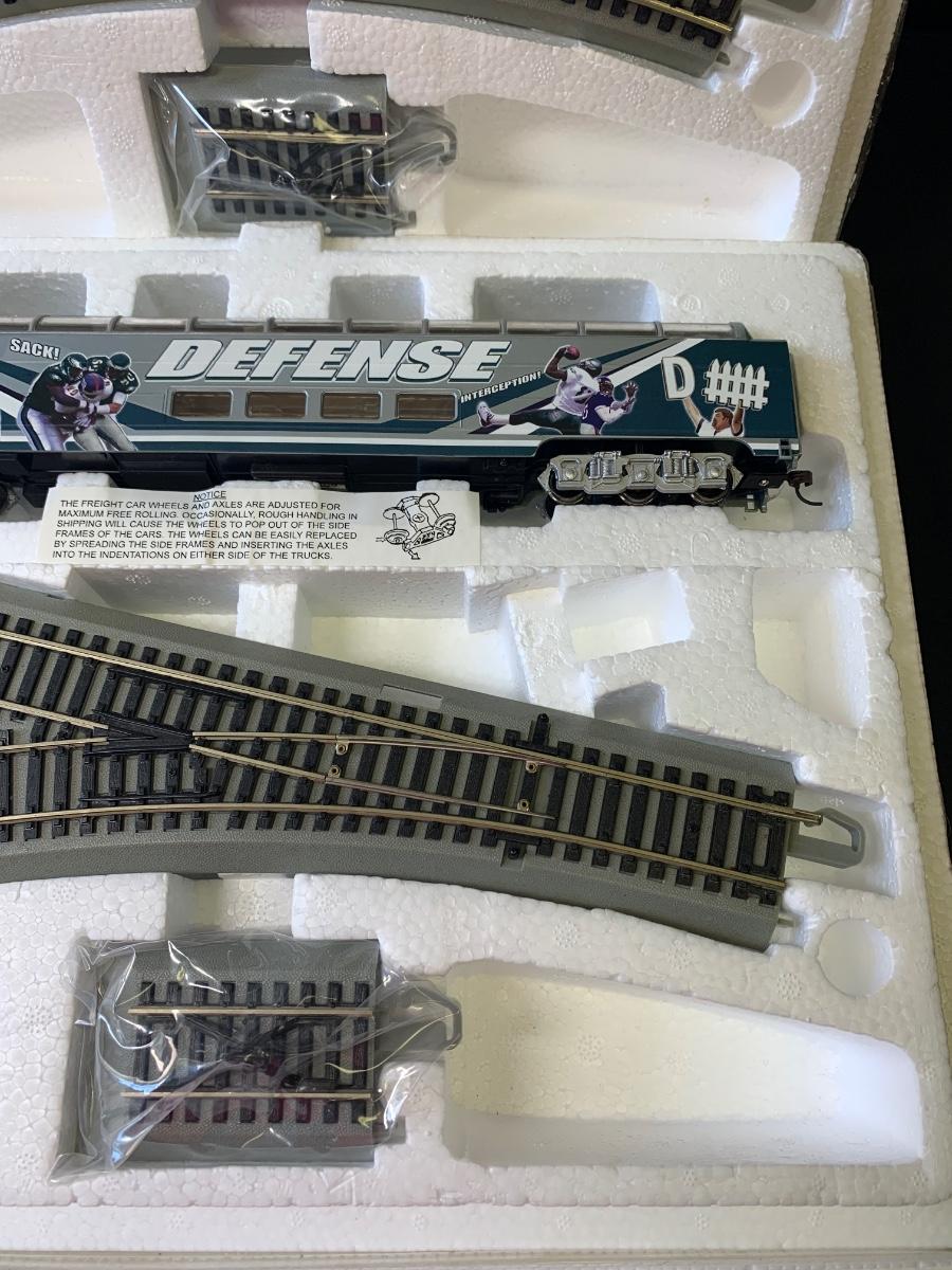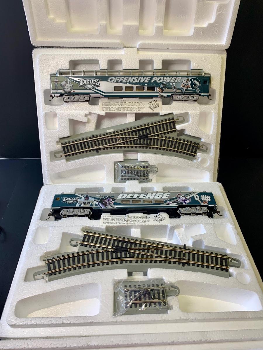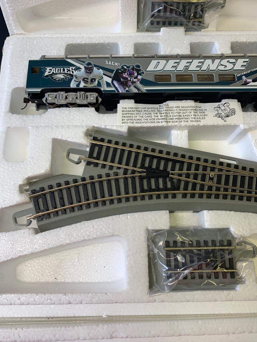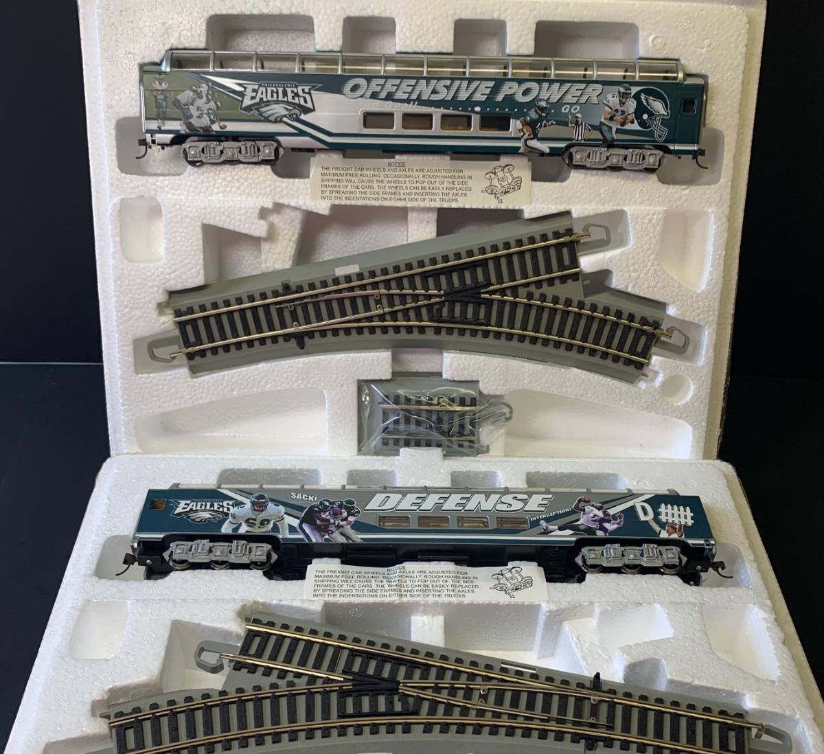 Includes 4 pieces of track. Authentic Philadelphia Eagles Bachman E-Z Track H0 Train with the original Styrofoam/packing- no box, may or may not have the COA, if the packaging envelope was sealed it was not opened to verify the COA