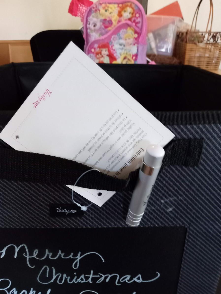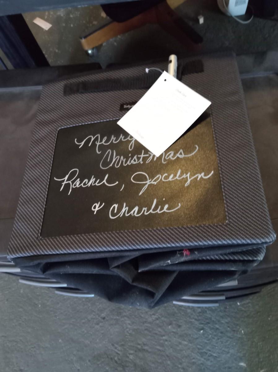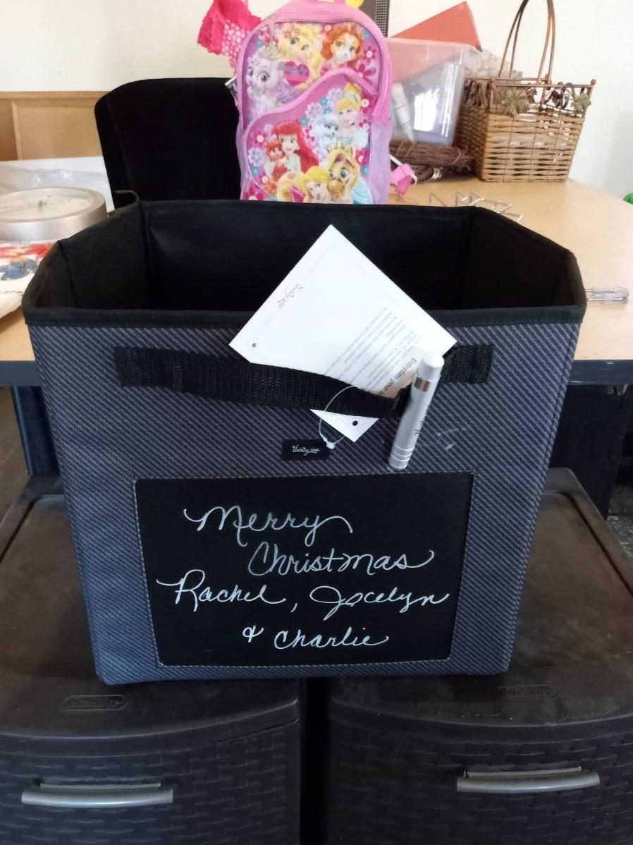 CLOTH BASKET WITH A CHALKBOARD AND CHALK ATTACHED
