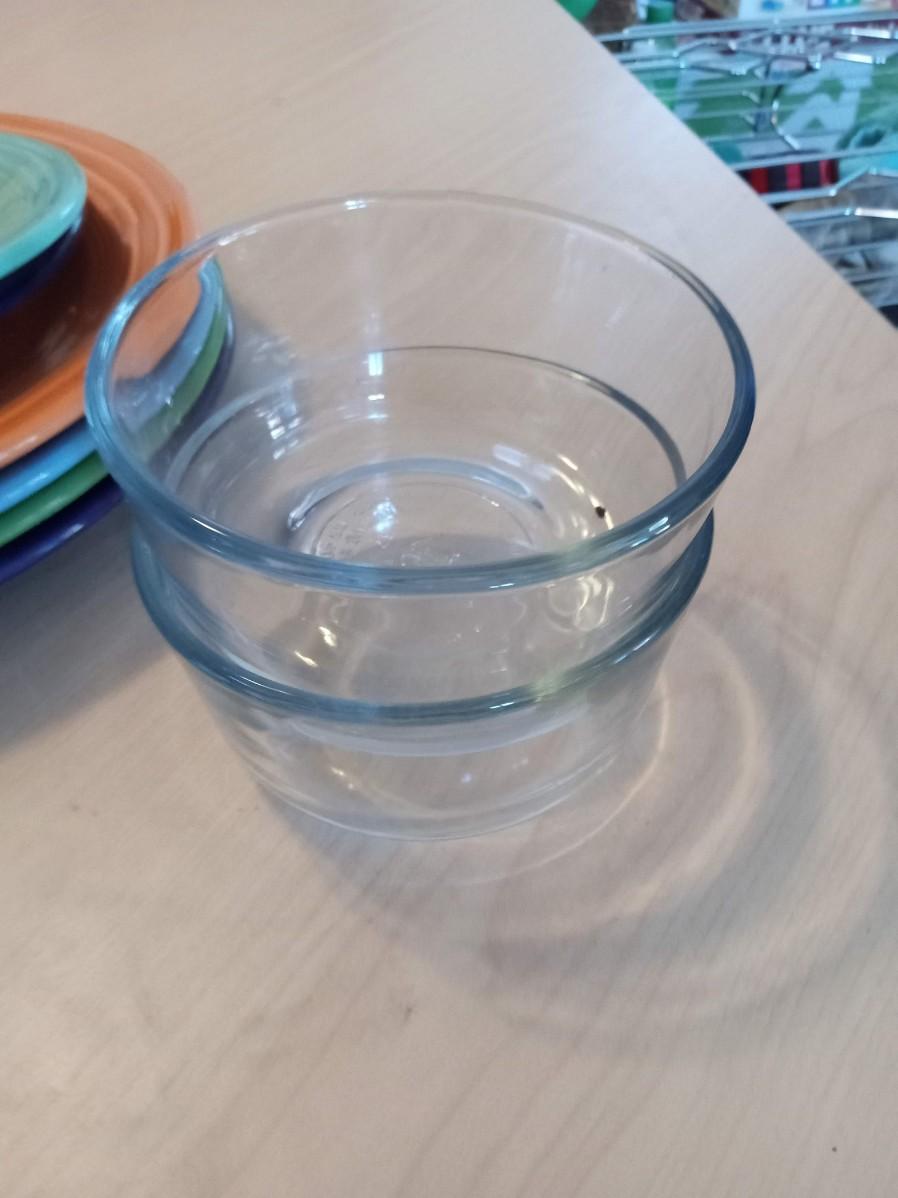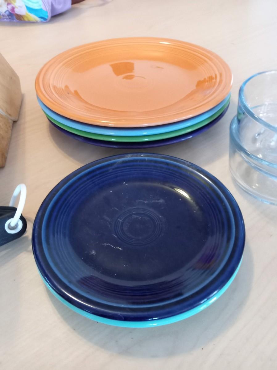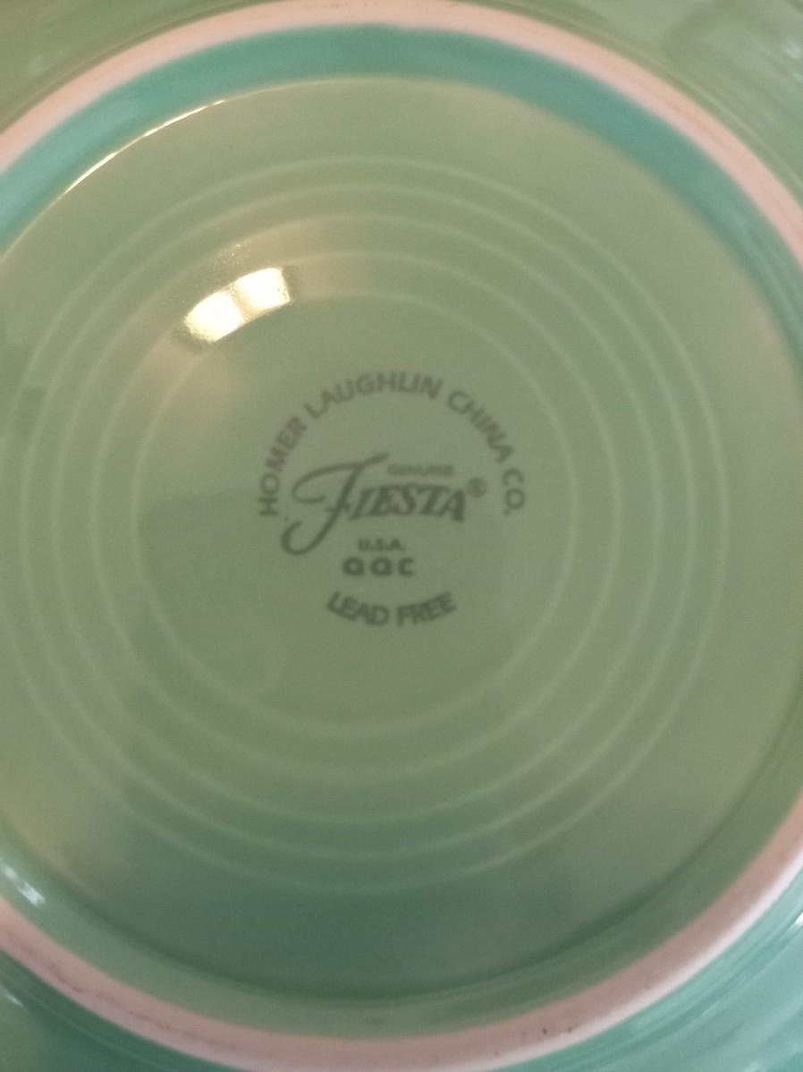 4 HOMER LAUGHLIN FIESTA DINNER PLATES AND 2 SALAD, 2 GLASS SERVING AND 2 CONDIMENT BOWLS