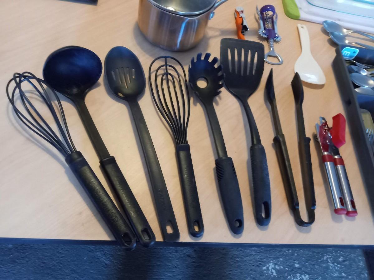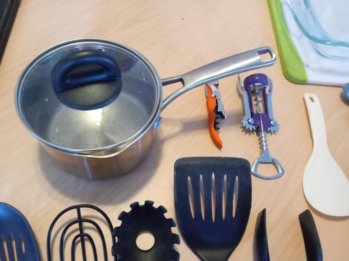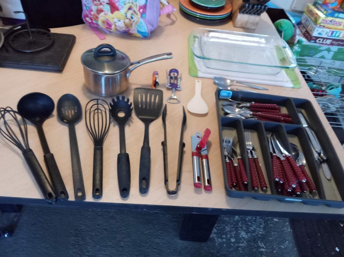 LOT 450  KITCHEN UTENSILS, FLATWARE, CUTTING BOARD, BAKING DISH AND SAUCEPAN (SE)