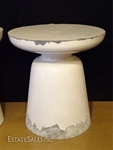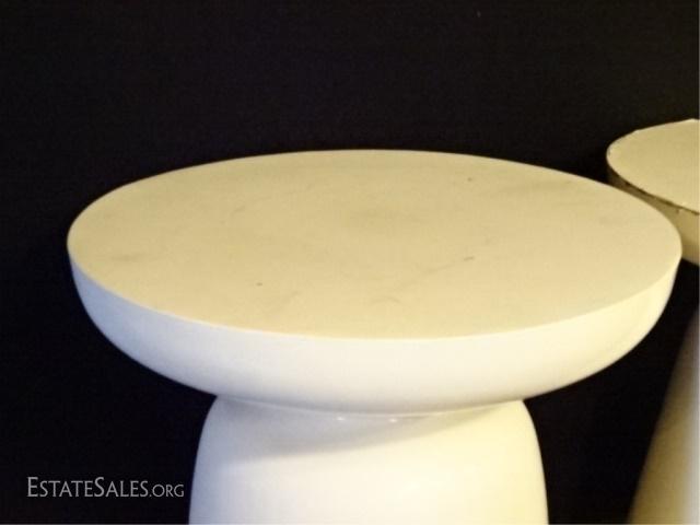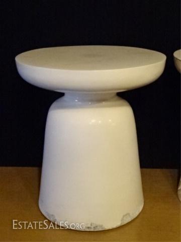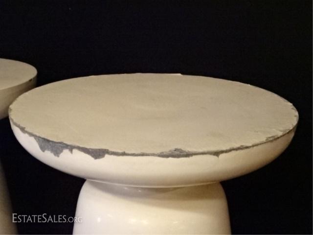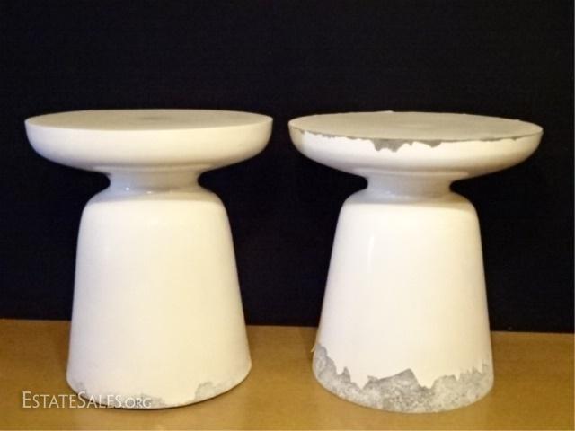 LOT 73A: PAIR MID CENTURY MODERN ITALIAN METAL TABLES OR STOOLS, WHITE ENAMEL OVER METAL, SOLID VINTAGE CONDITION WITH WEAR TO ENAMEL, 16"H X 15"W
