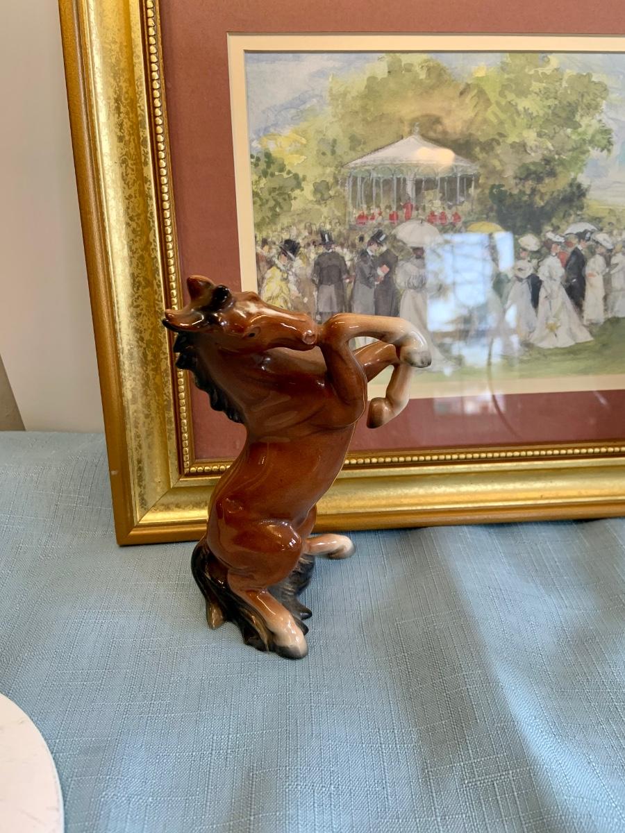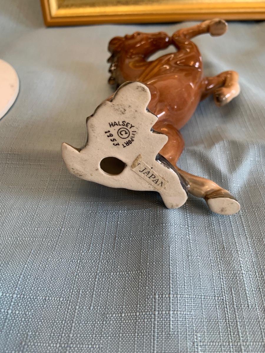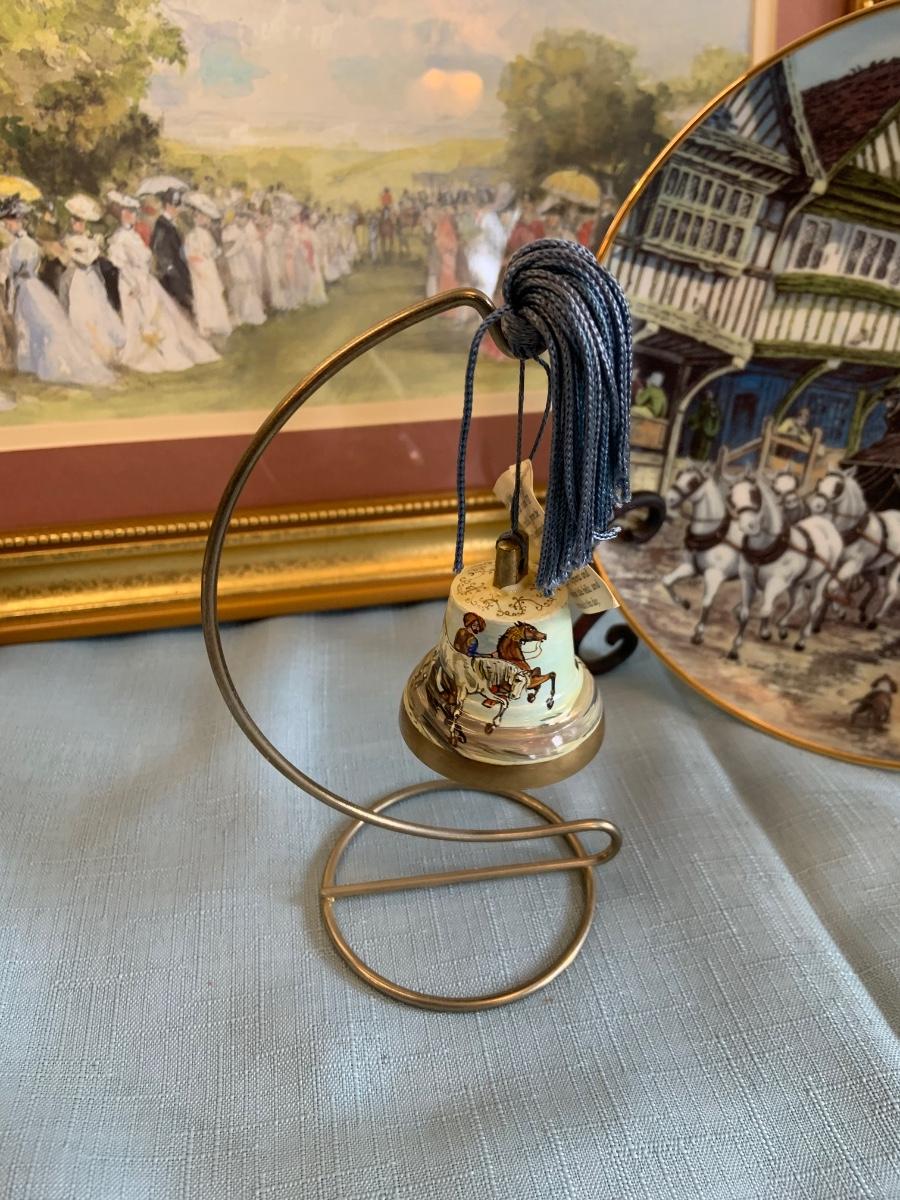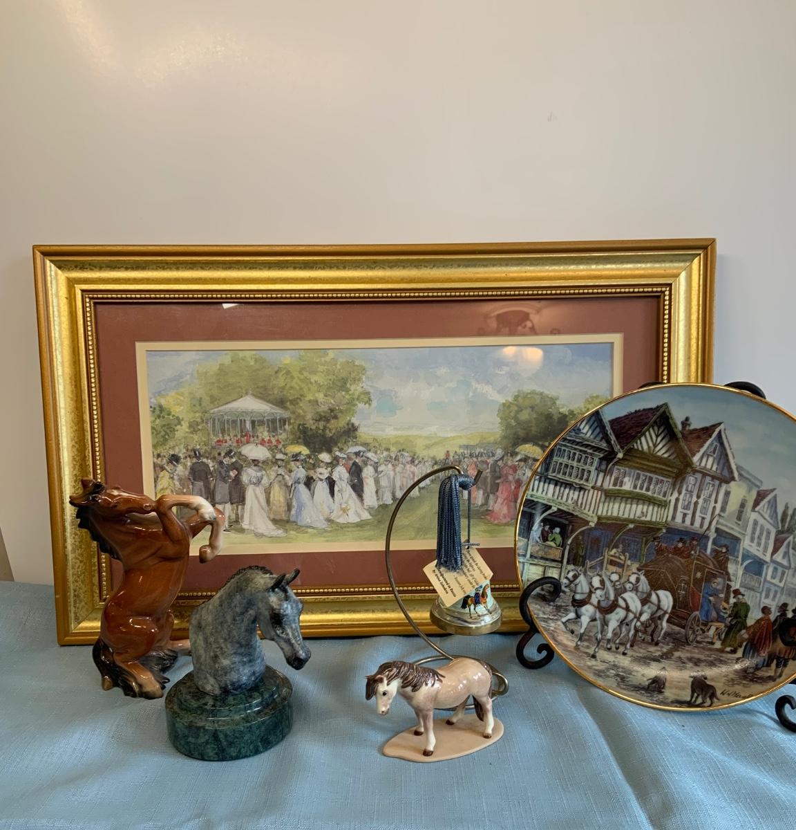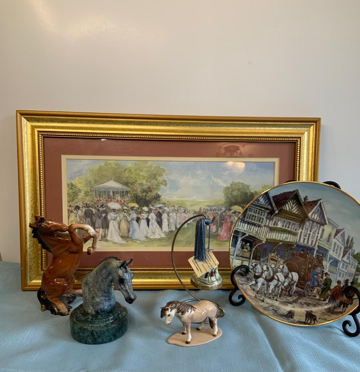 Lot 73G: Horse Themed Home Decor Featuring Hand Pained Bell, Signed Wall Art, Trinity Collection Plate , Halsey Japan Horse Figurine & More