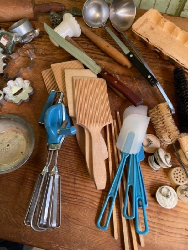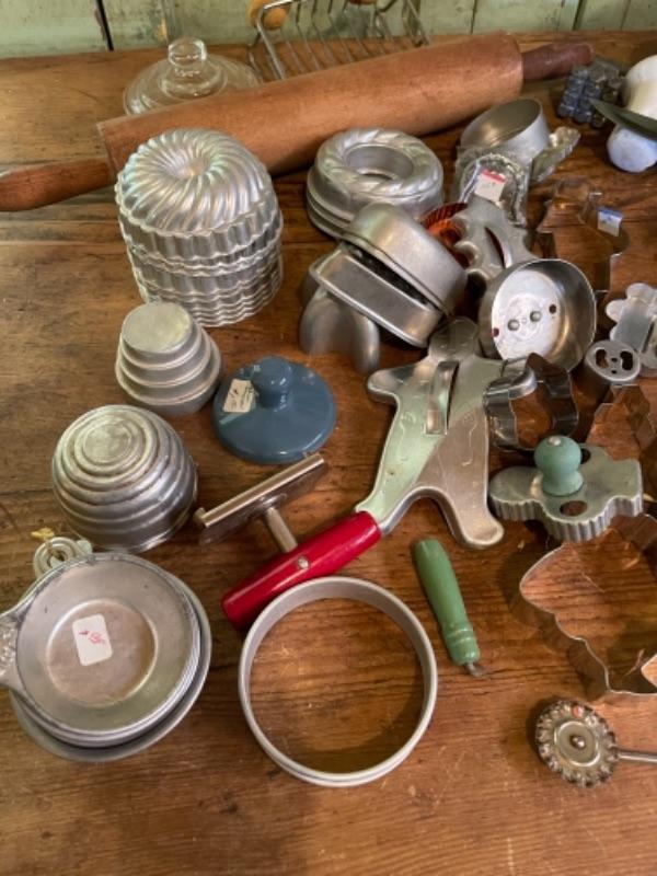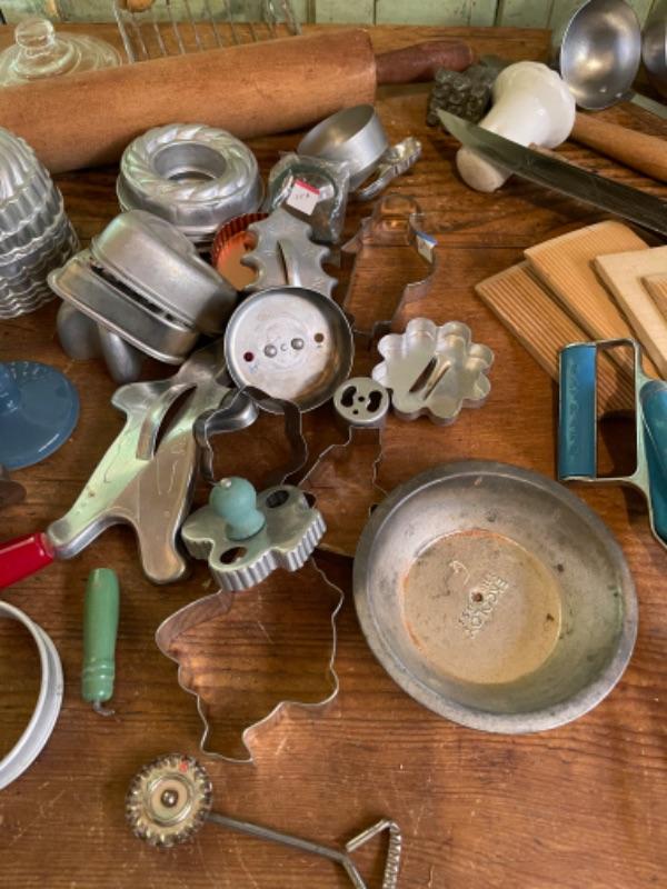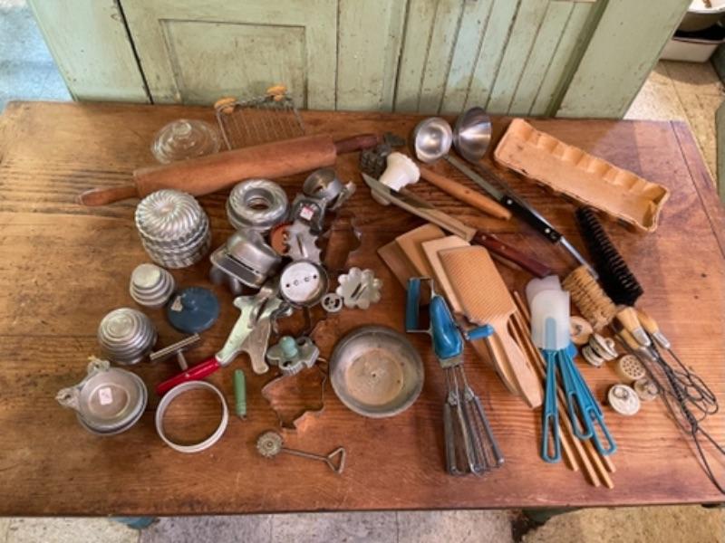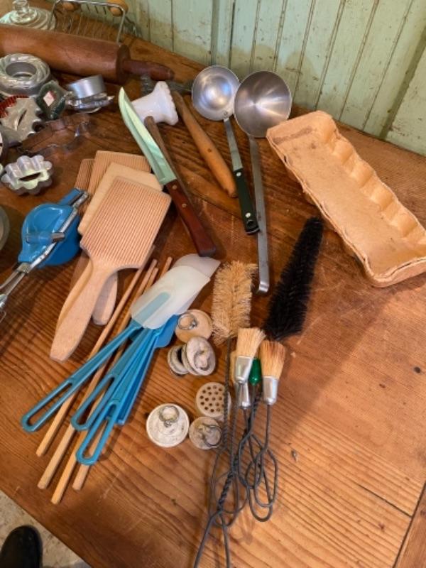 Lot 73K. Rolling pin, molds, ladles, can opener, hand mixer, cookie cutters, etc.--$85