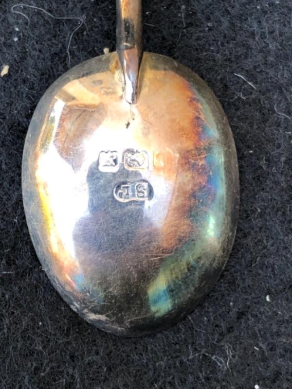Lot 73S.  Six English Antique Birmingham Sterling Silver Demitasse Spoons in case, made in England, black bean shape on end of spoon, branded S. L., Art Deco Style “” $45