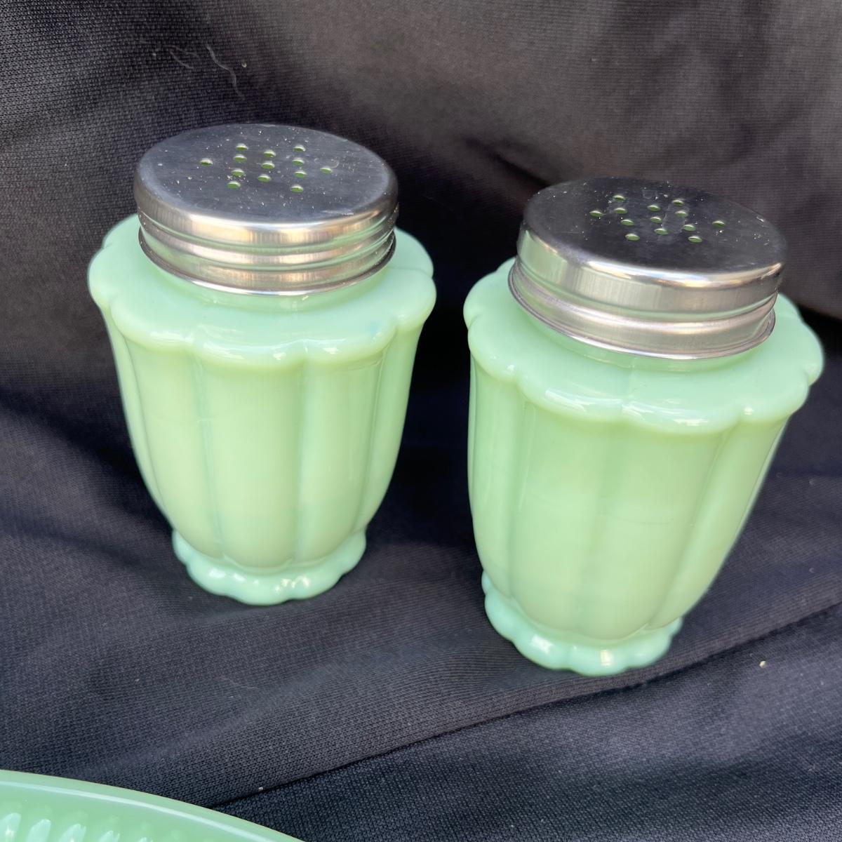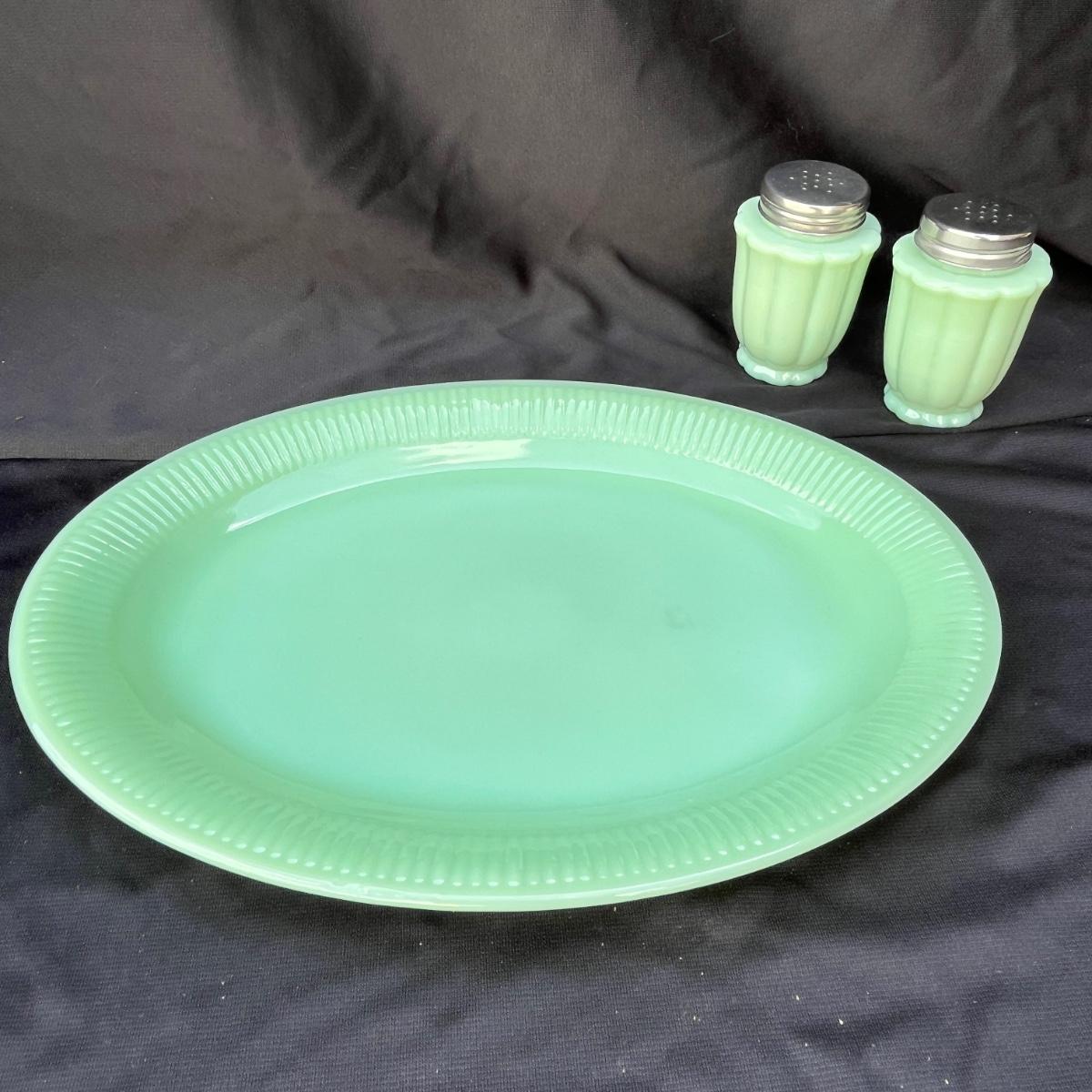 Pioneer woman shakers & Fire King Jane Rae Platter.