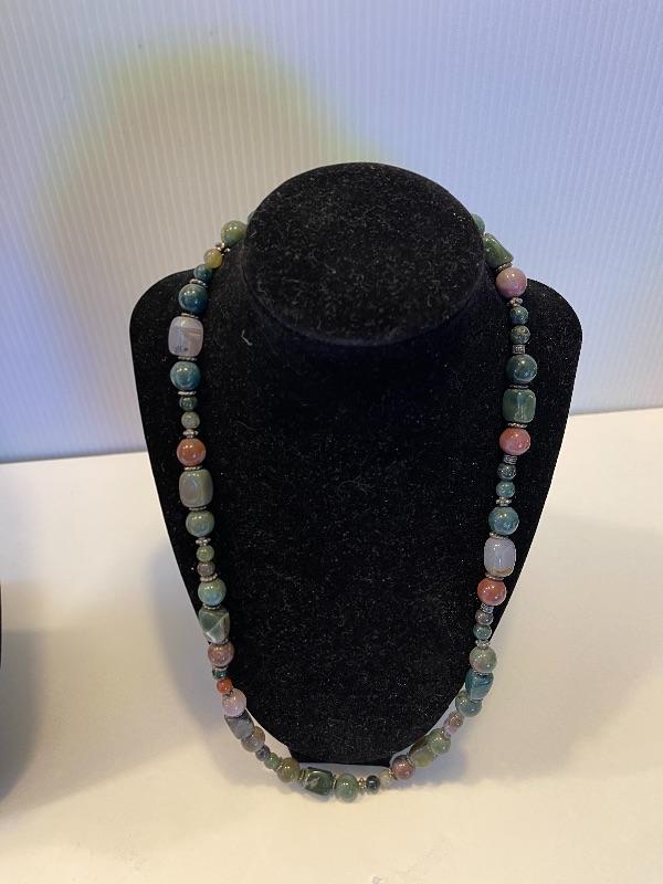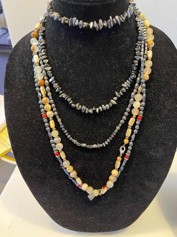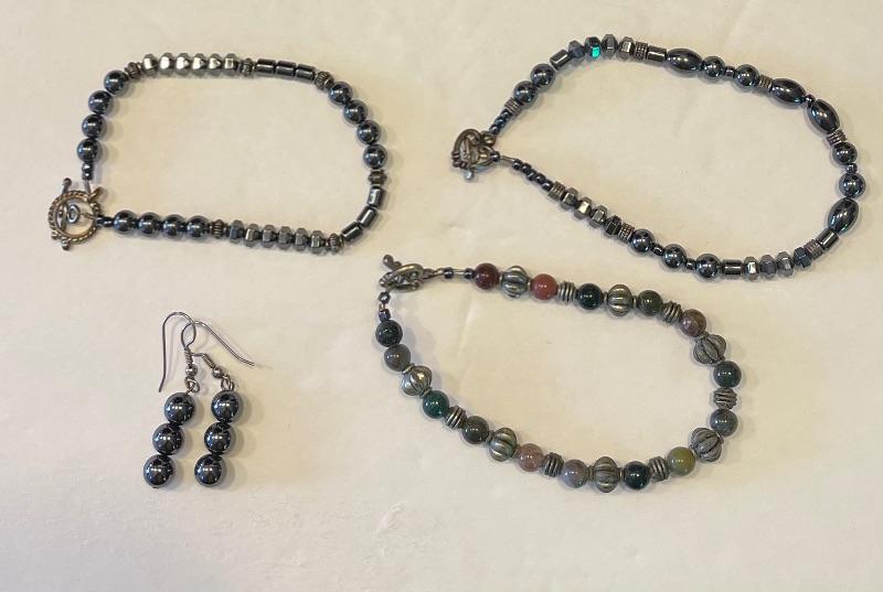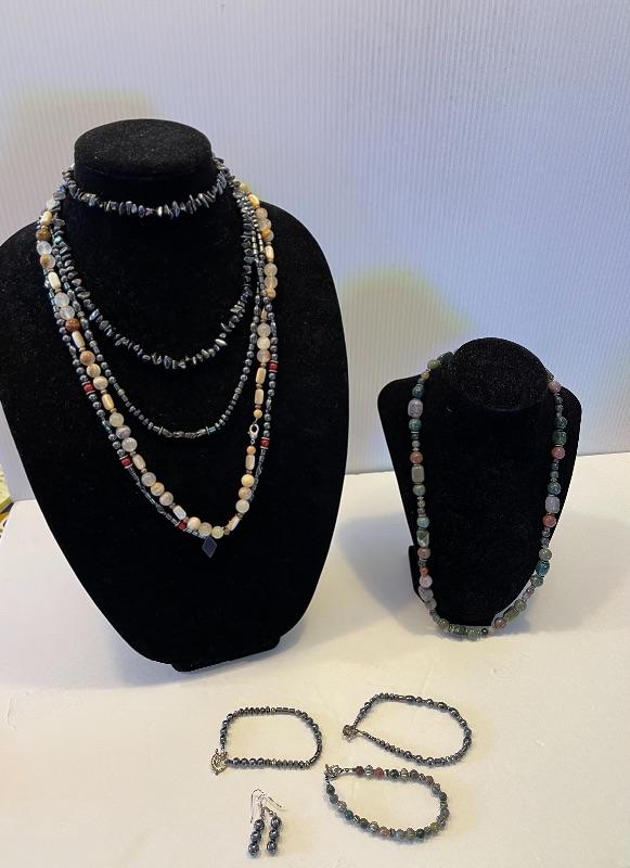 (3) hematite necklaces, one pair of hematite earrings, (2) hematite bracelets, (2) natural stone necklaces, one natural stone bracelet.