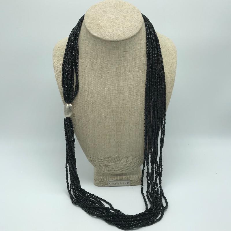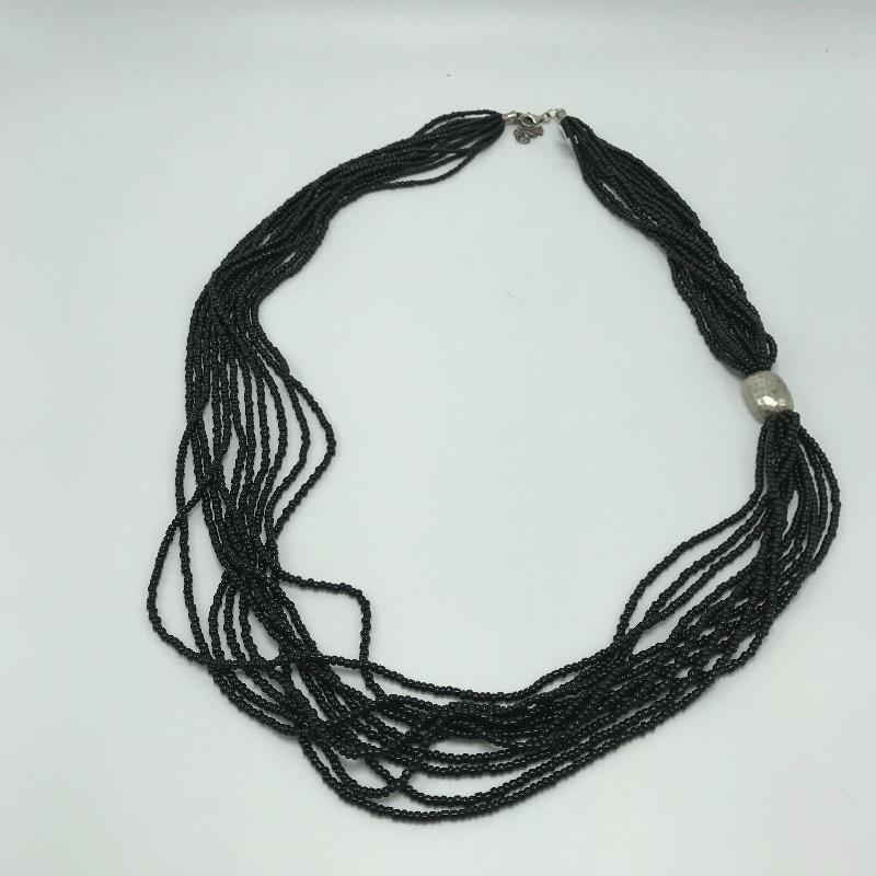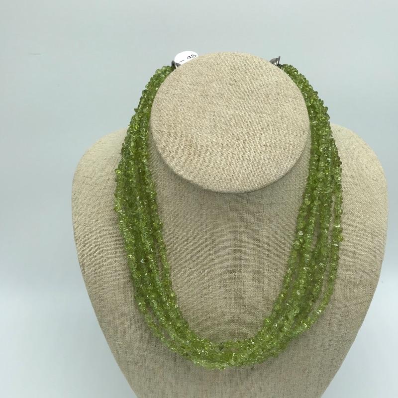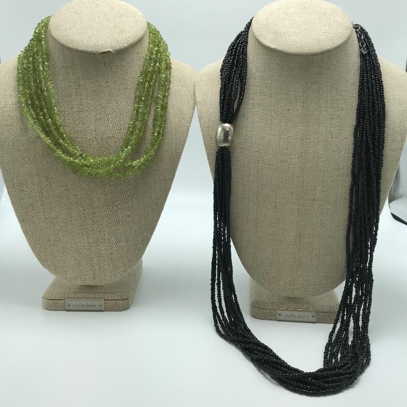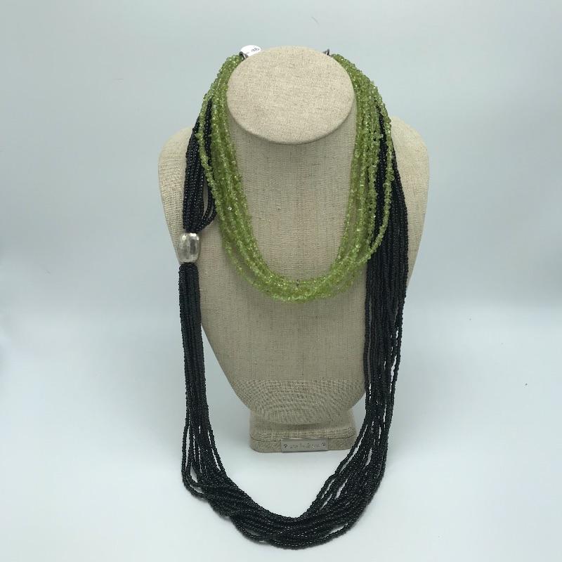 Six strand peridot necklace with sterling anchors and a lobster clasp. The peridot necklace is 17.5” with 2” extender. Lot also includes an eleven strand black seed bead 34” necklace with a large sterling accent bead and lobster clasp with a 2” extender. See photos.