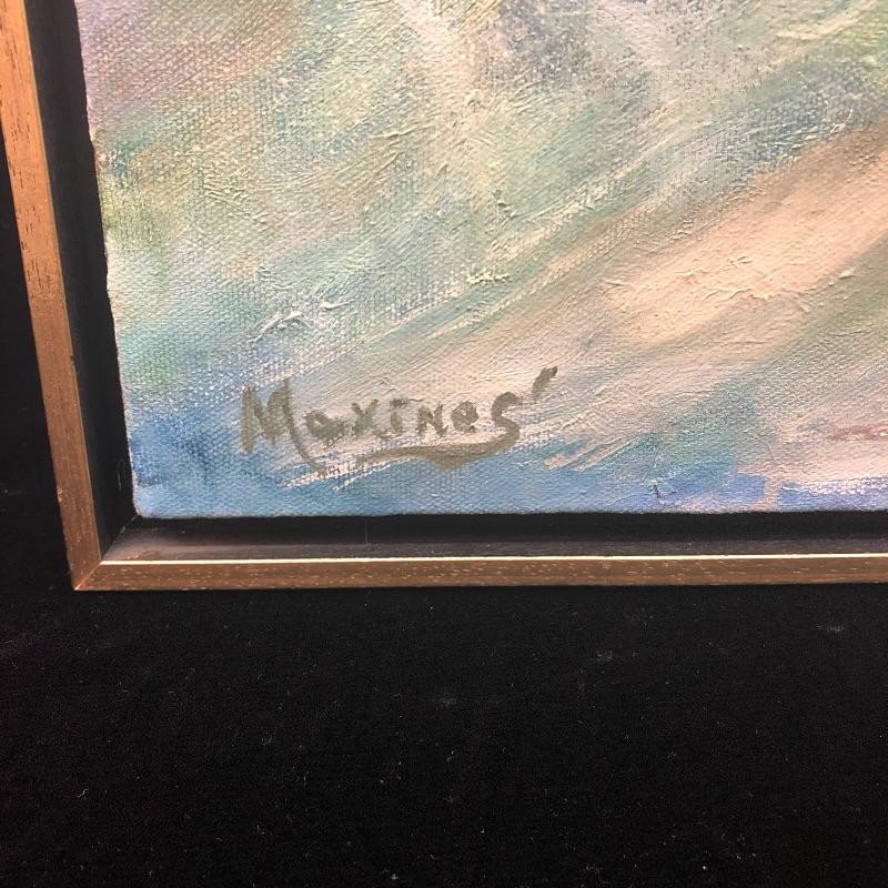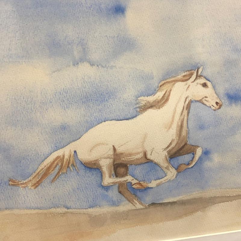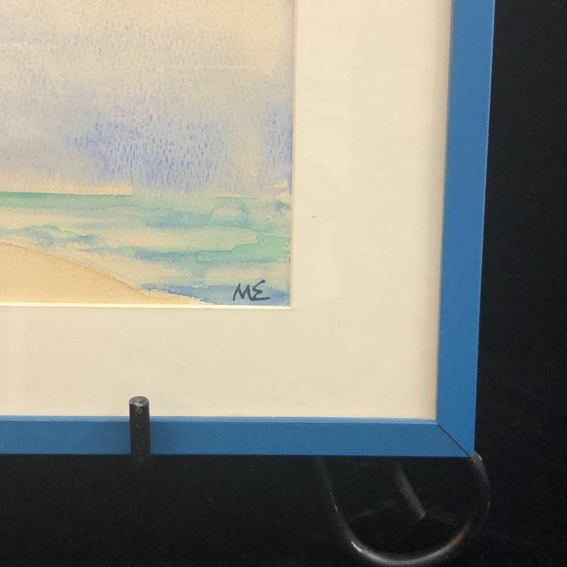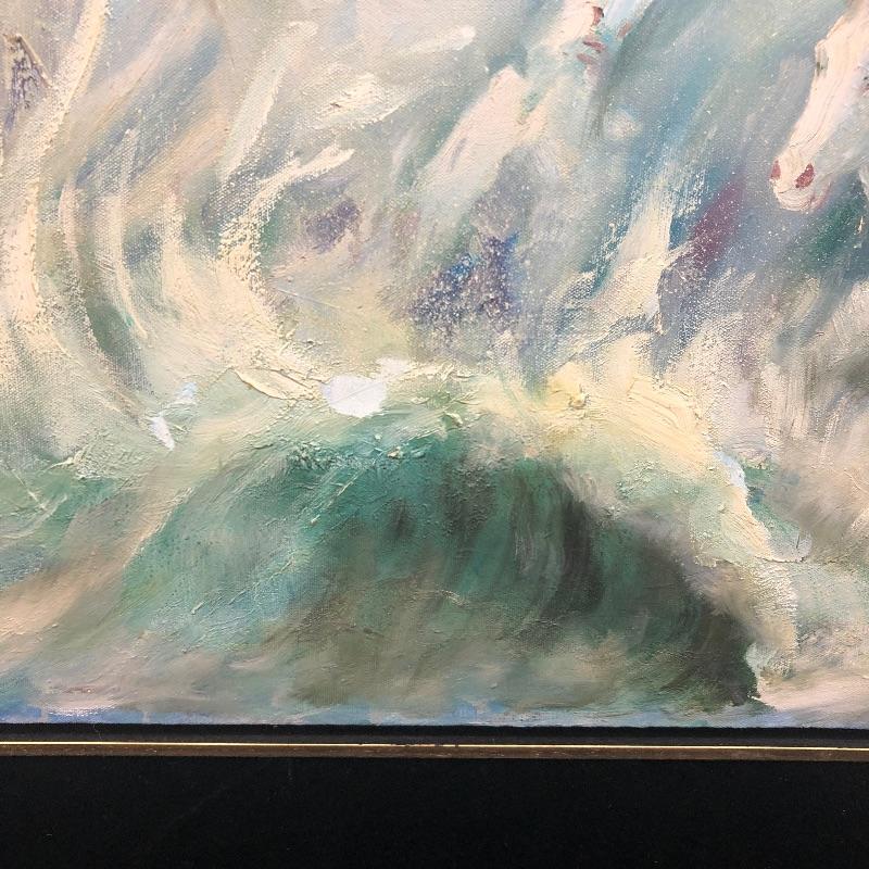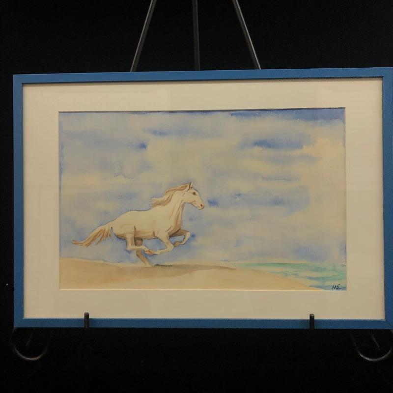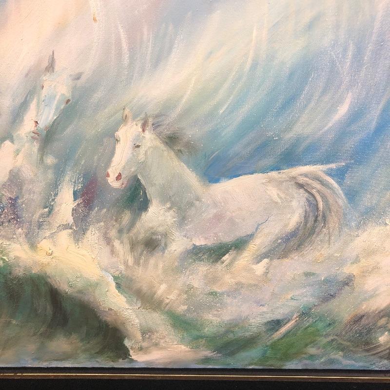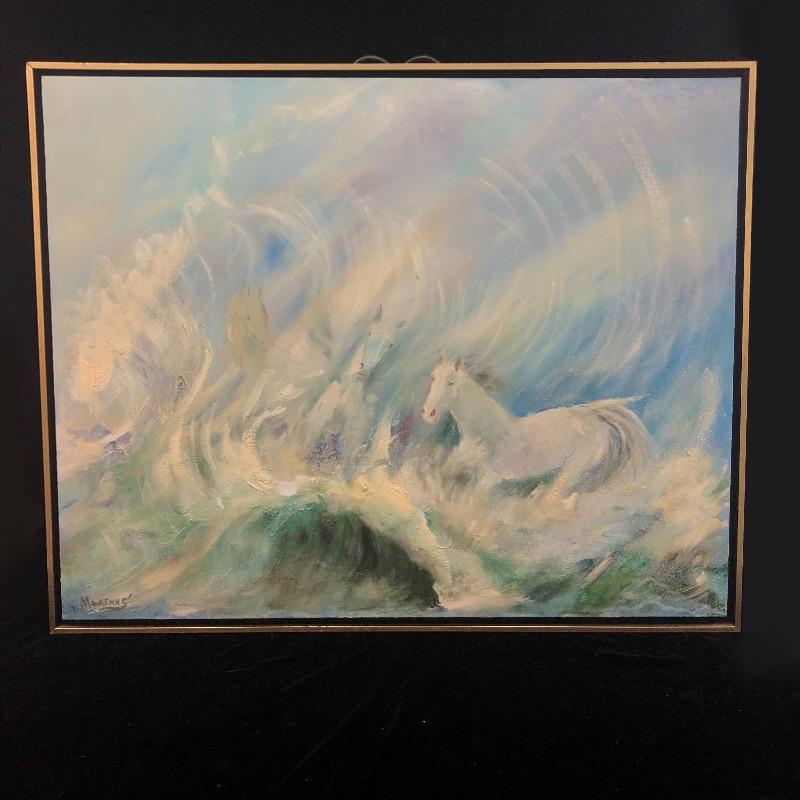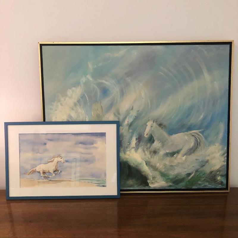 Two majestic framed paintings of horses, one watercolor and one oil painting. The oil painting is on canvas and framed. It depicts three horses intertwined in the waves. It is very expressive and has impressive brushstrokes. Paint is flaking off in one area of the waves (see detail image). It is signed: Maxines'. The watercolor is also framed and depicts a white horse running along the beach. The blue sky is beautifully painted. Signed with the initials: ME. Approximate measurements are 31.5" x 25" For the oil painting and the Watercolor is 18.75" x 12.75" Shipping available. Please call UPS with dimensions at 828-252-6930 for a shipping quote prior to bidding.