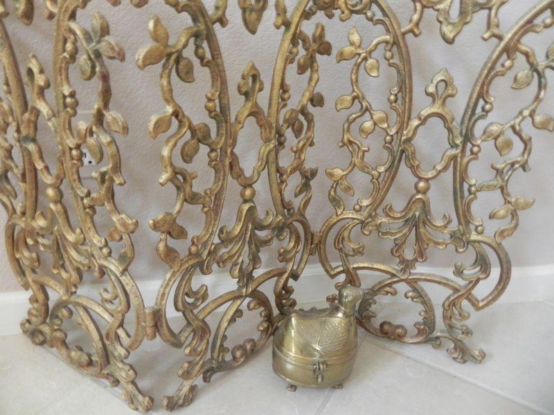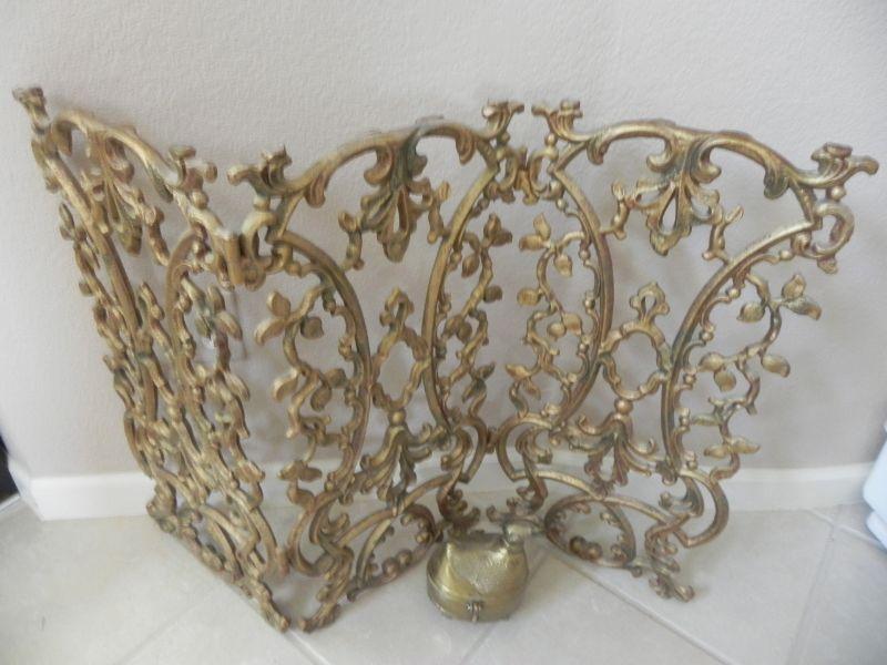 BRASS COLORED IRON FIREPLACE SCREEN THAT IS HINGED IN 1/3rd's TO ALLOW THE 2 OUTER PANELS TO PIVOT FORWARD OR BACKWARD.