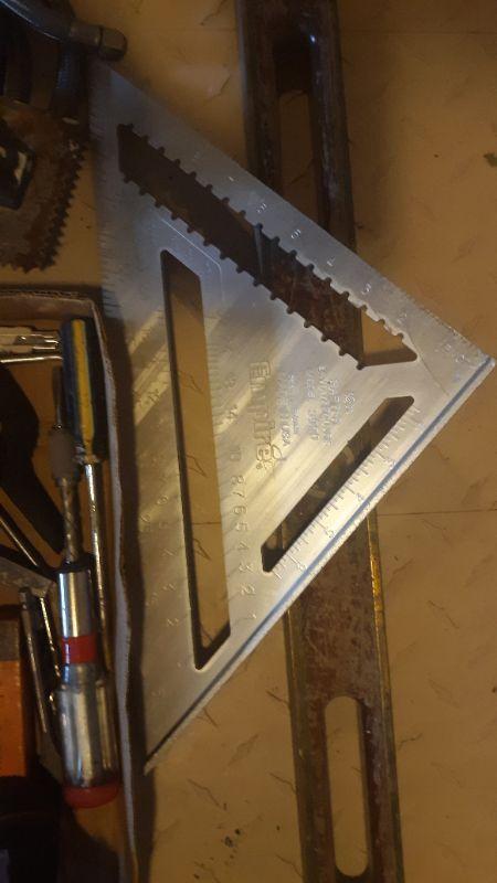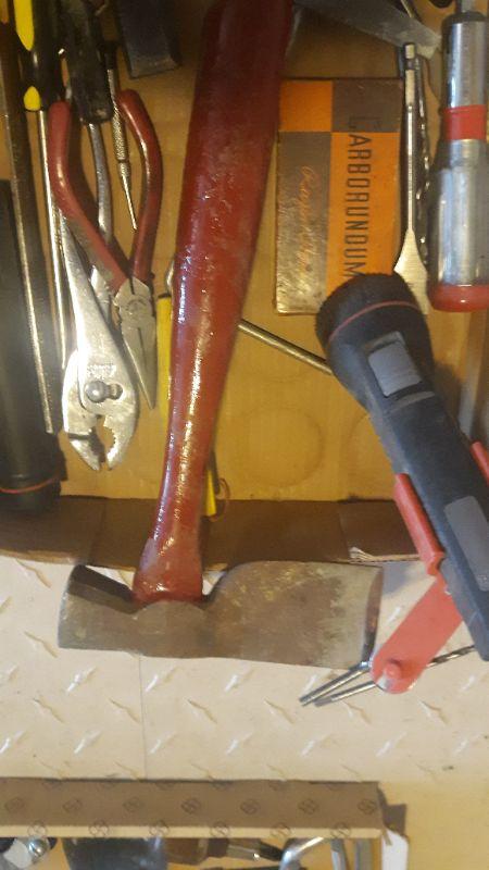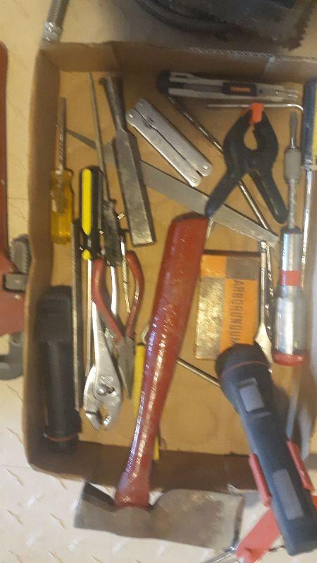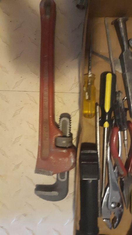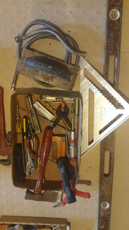 LEVEL, PIPE WRENCH, HATCHET , SCREWDRIVERS, PLYERS, AND OTHER