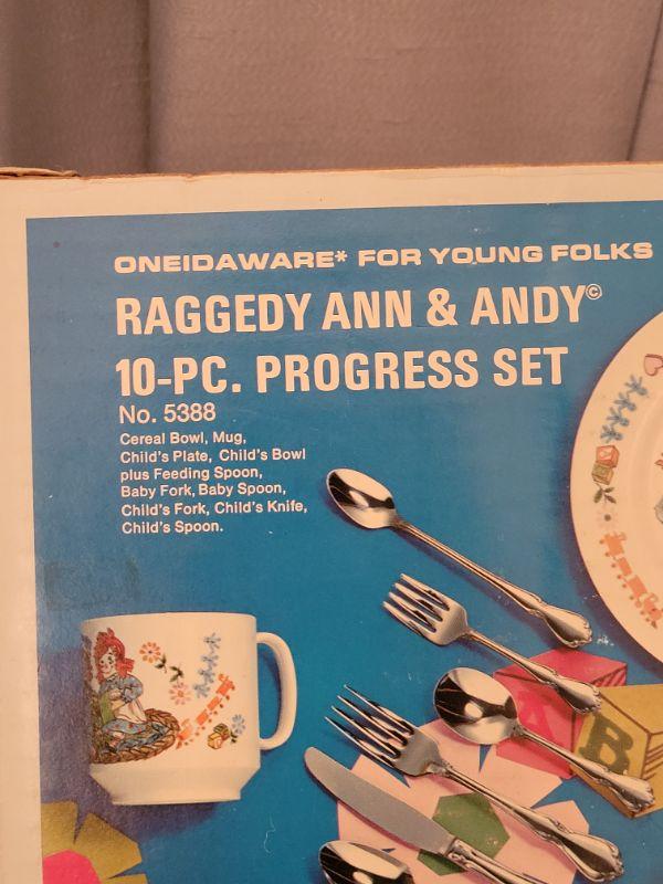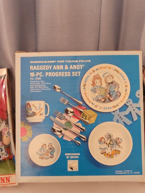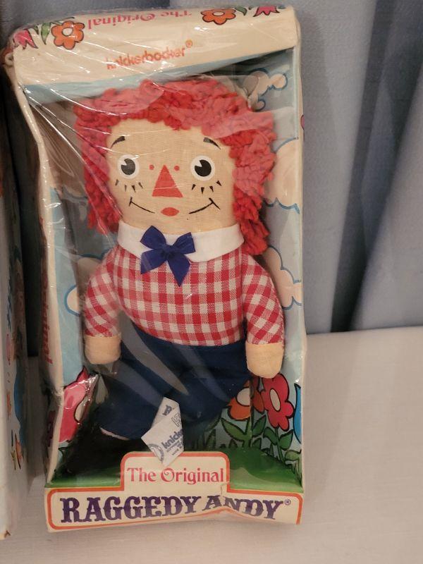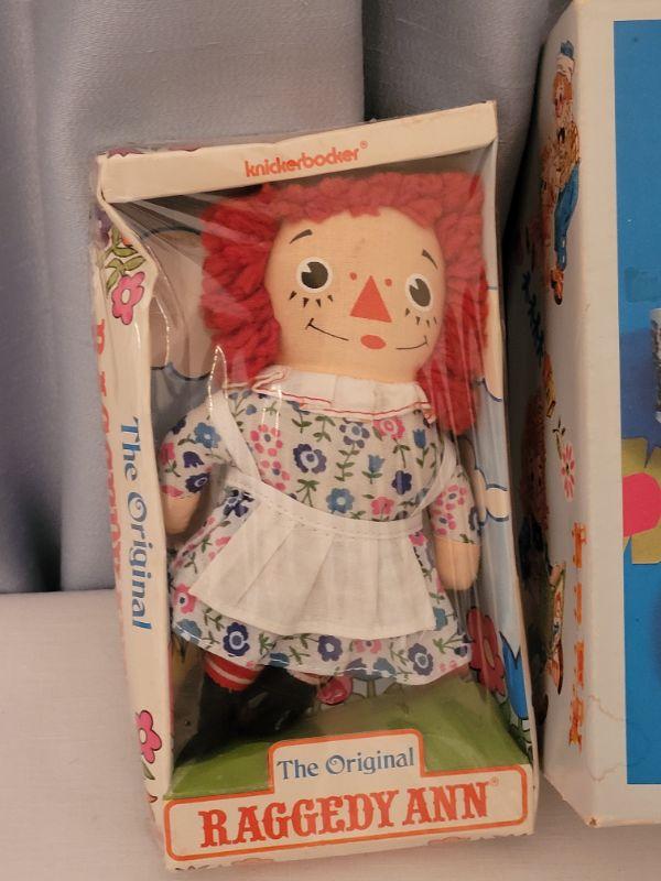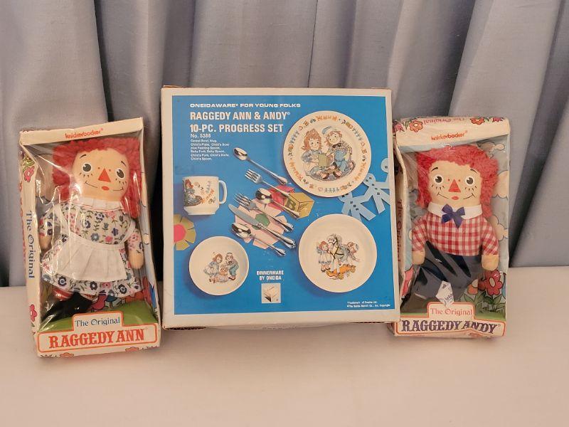Lot 74: NEW Old Stock Raggedy Ann & Andy Dolls and Dish Set