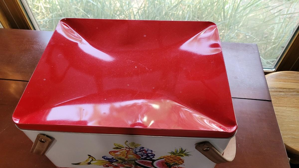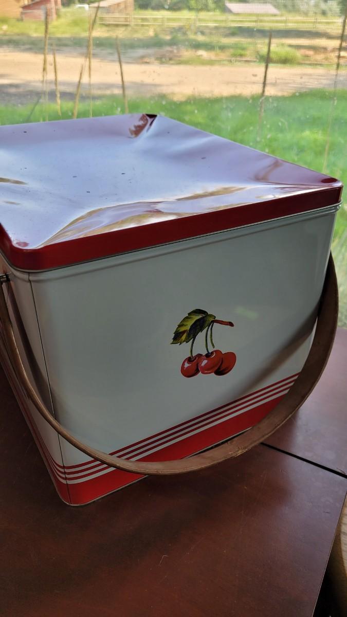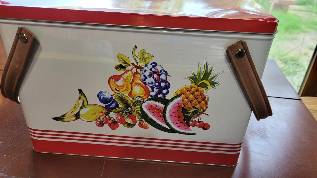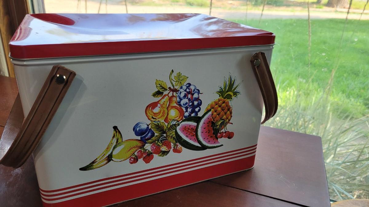 Lot 74: Vintage Metal Picnic Basket with Wood Handles