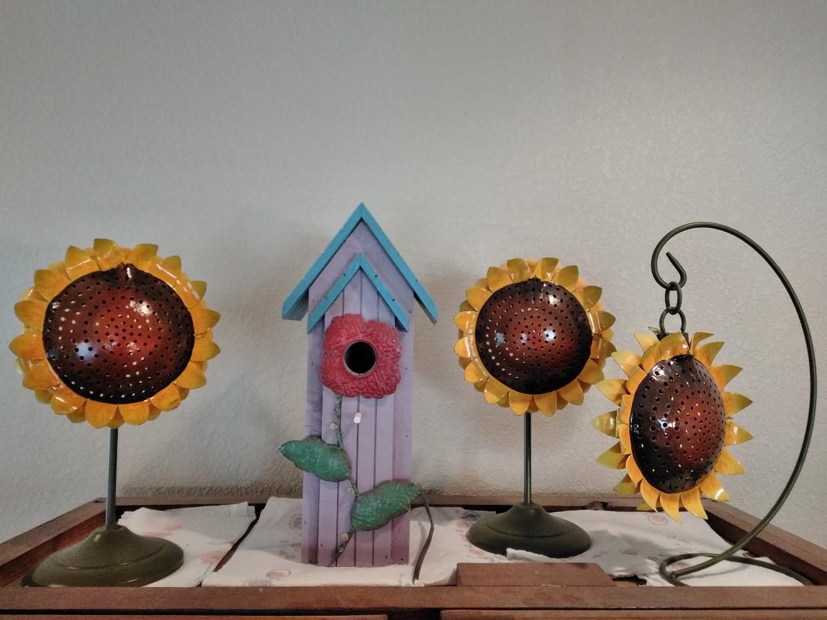 THREE METAL SUNFLOWER HOME DECOR ITEMS, AND A COLORFUL BIRD HOUSE.