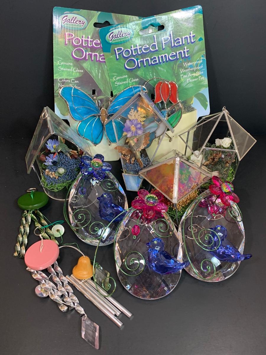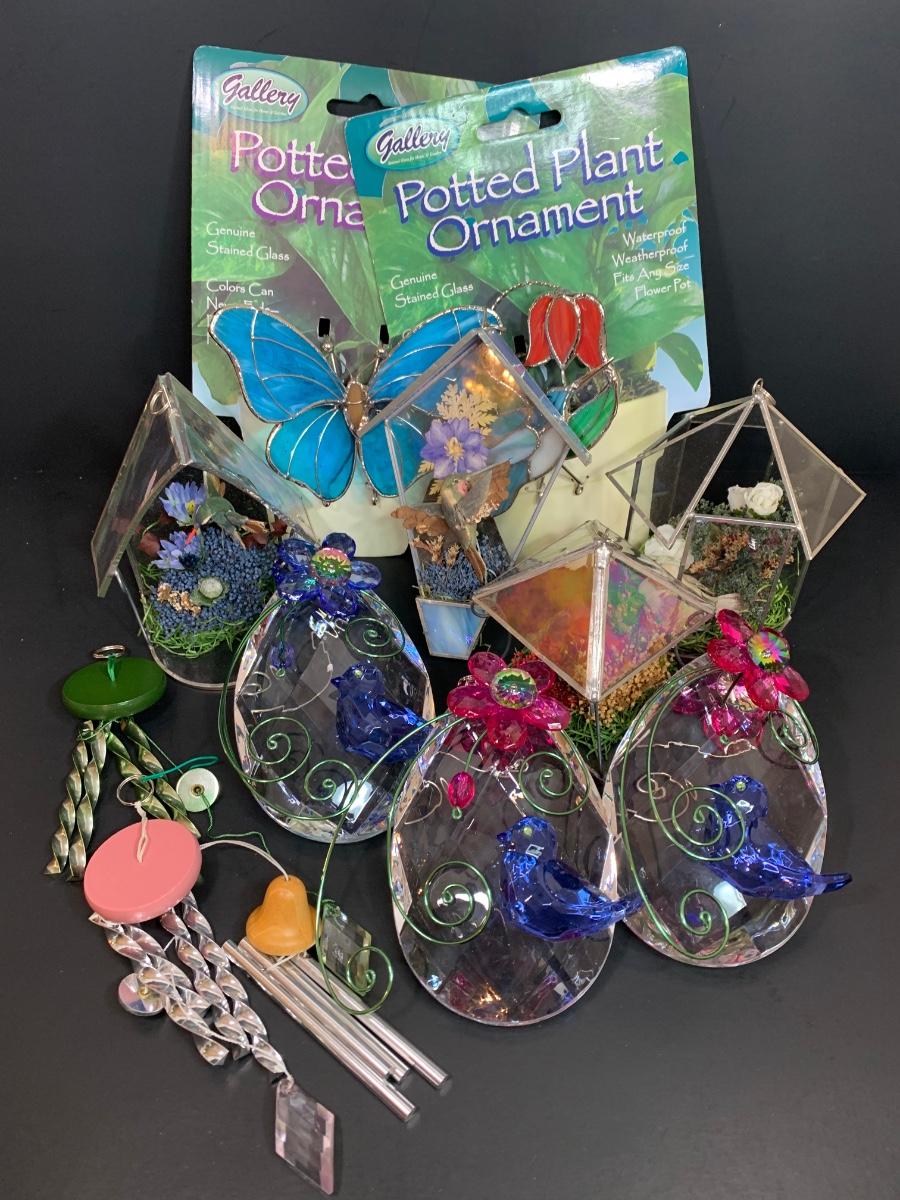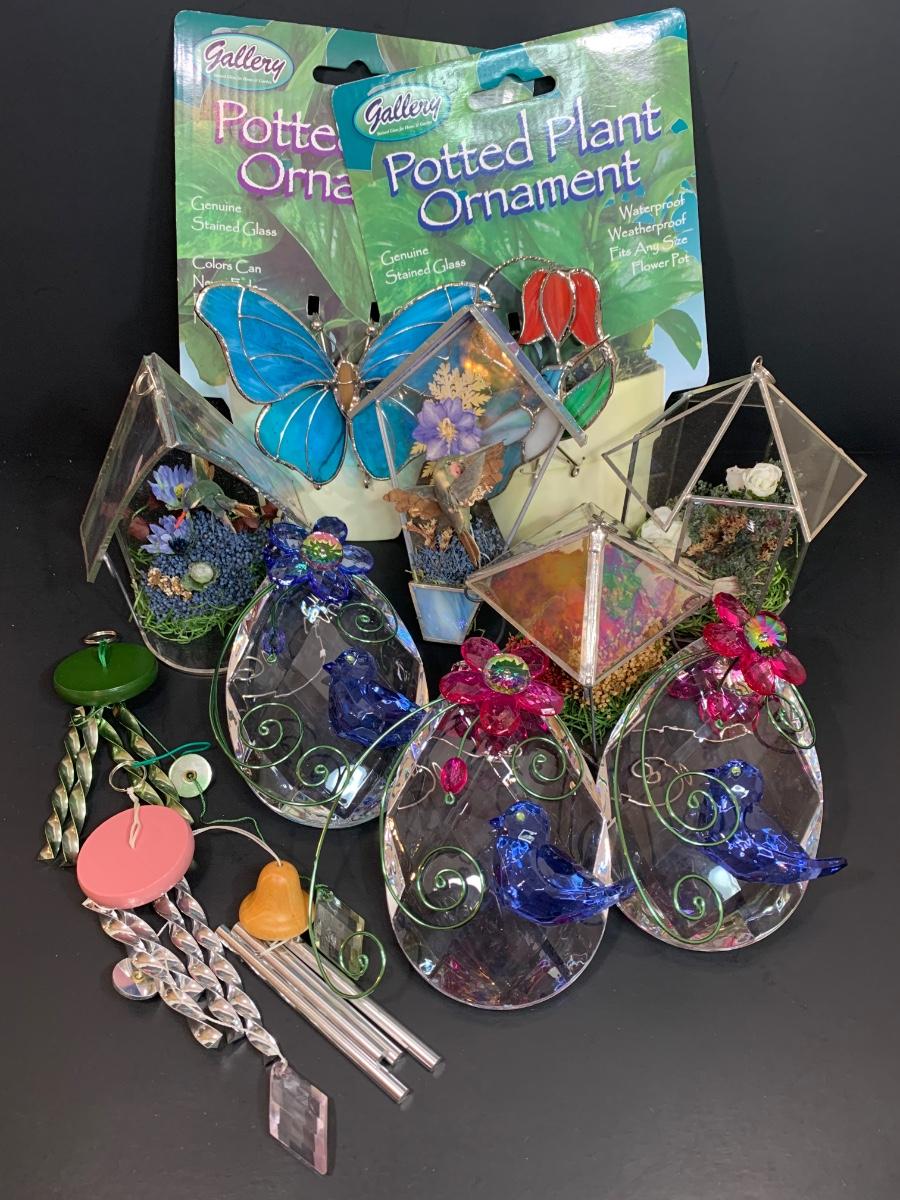Outdoor Decor and more including wind chimes, planter ornaments, sun catchers and glass terrariums.