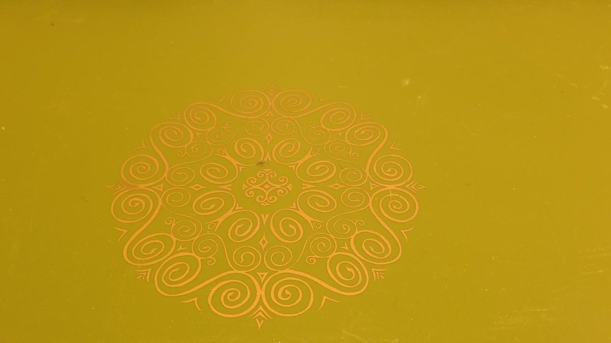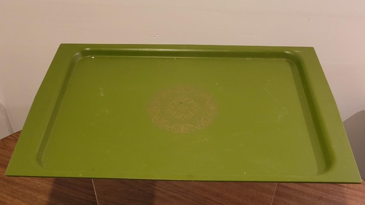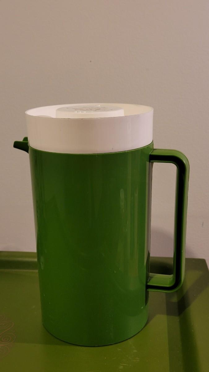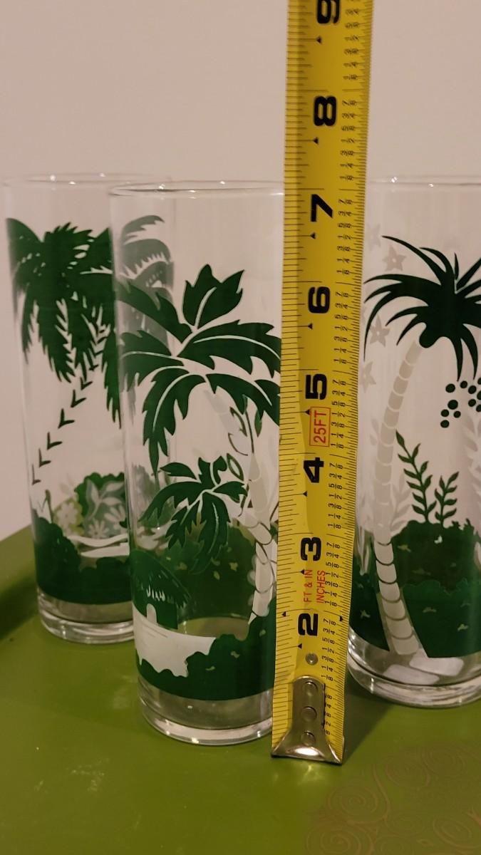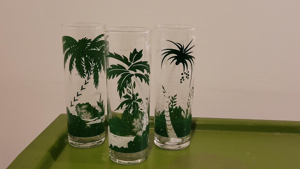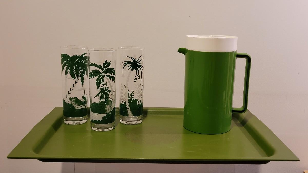 Lot 74: Mid Century Avocado Green & Gold Serving Tray, (3) Collins Glasses and Green Pitcher