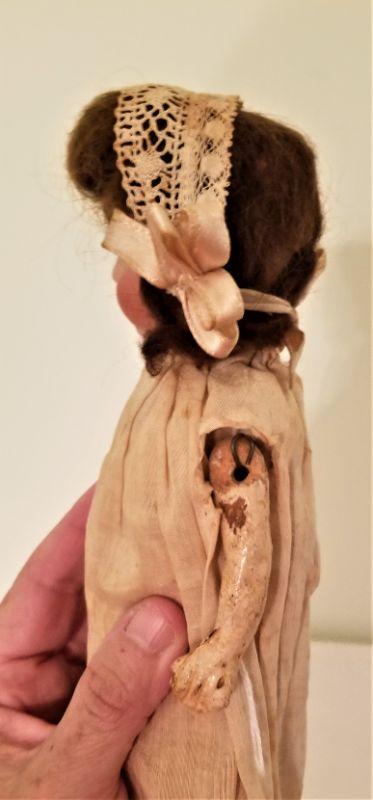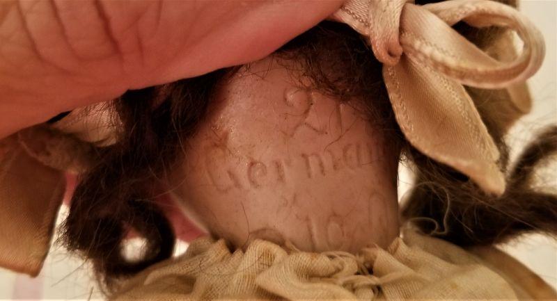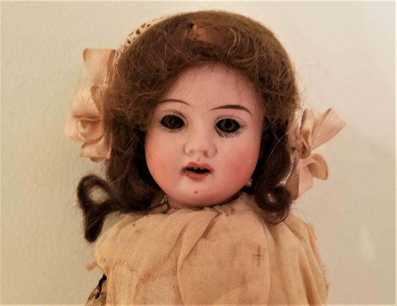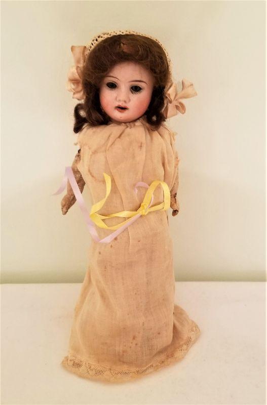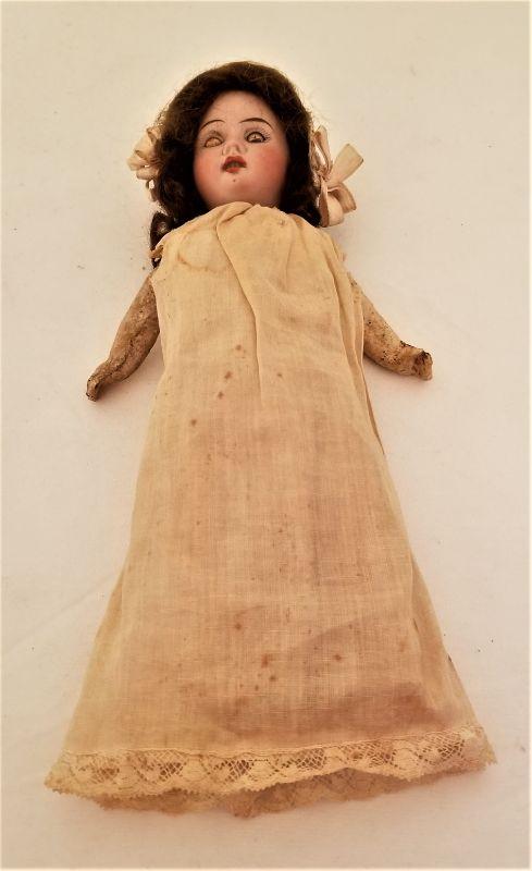 This baby is from the late 19th century - made in Germany - open mouthed with little pearly teeth. Original mohair wig. I don't know if her clothes are original, but they are old. Body is sawdust stuff - arms are composition - one has issues. Still - she has a "look." 10" tall. She just needs some love.