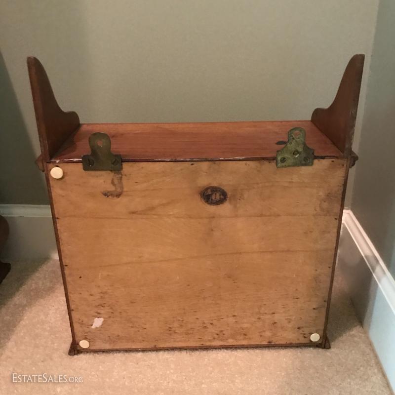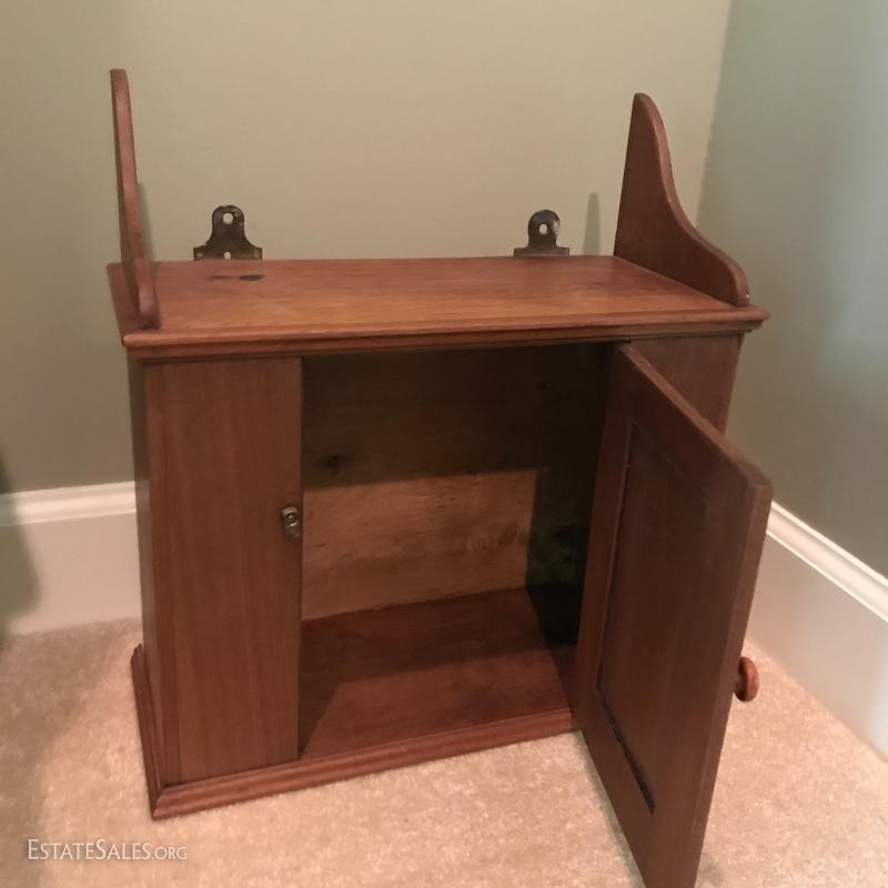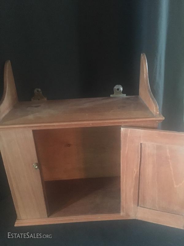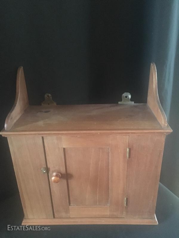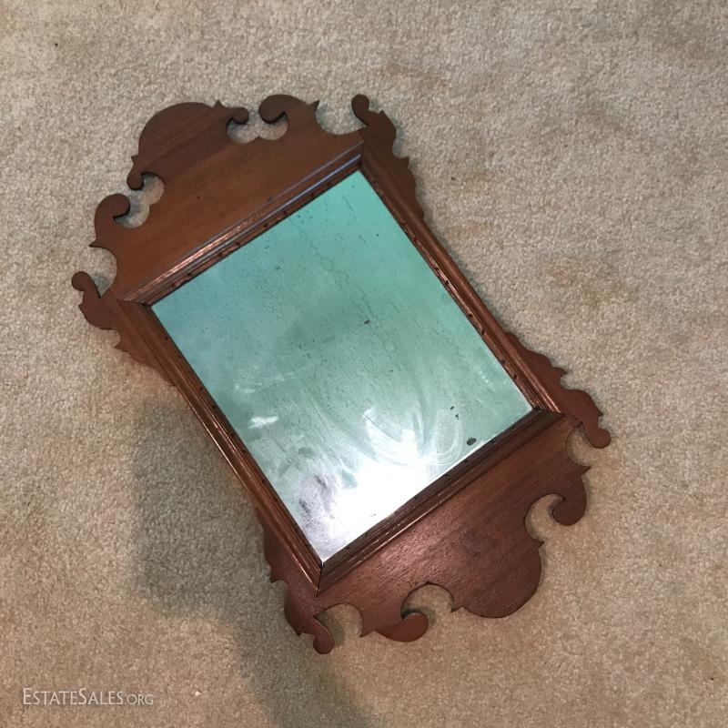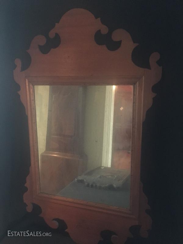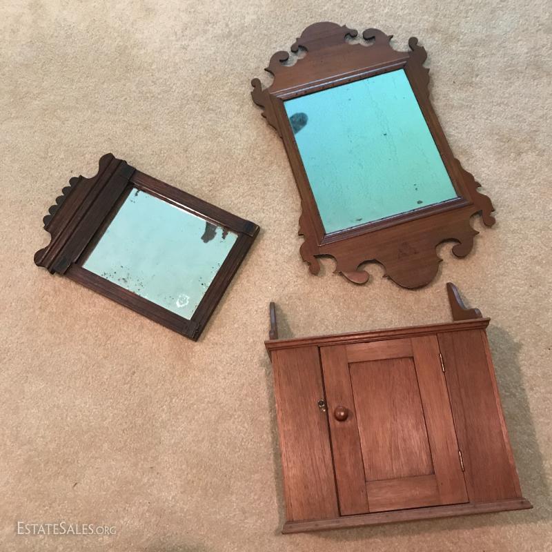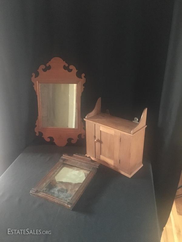 Antique hanging cabinet, Chippendale mirror and antique Hired Man's Mirror.