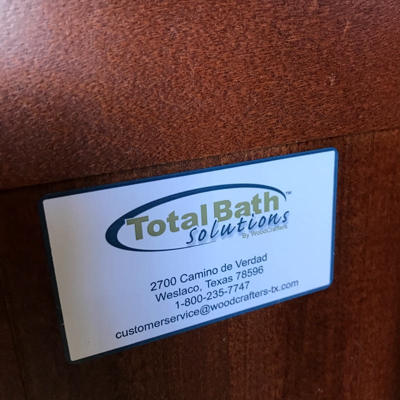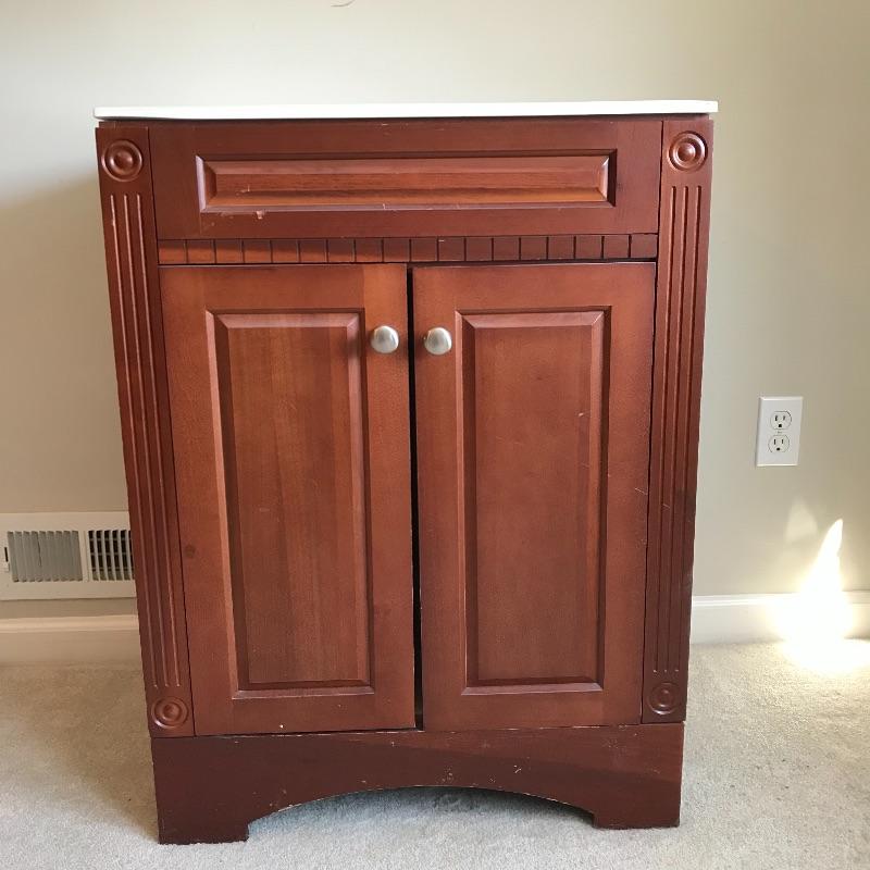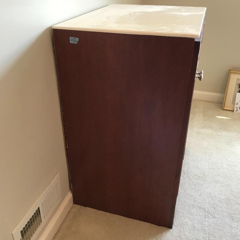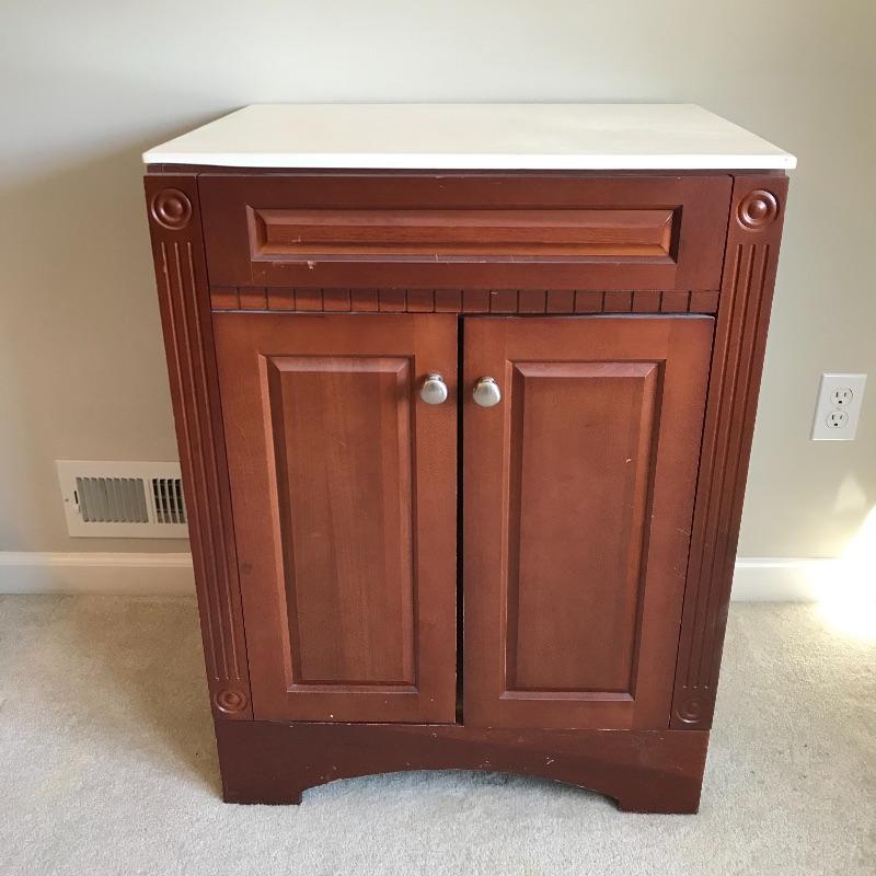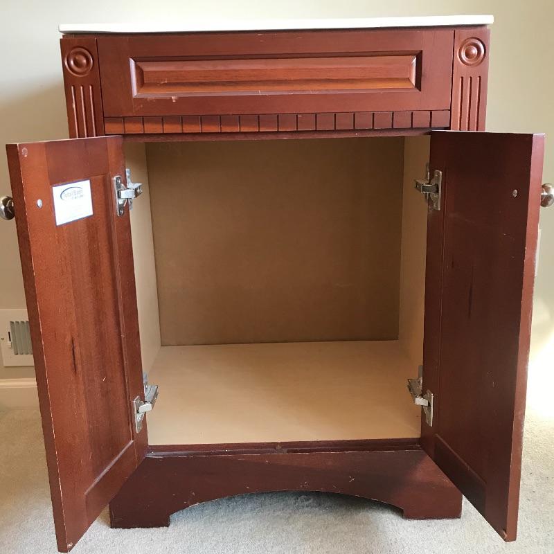 Many possibilities with this versatile cabinet. This cabinet could be the perfect storage solution in your kitchen or office! Total Bath Solutions bathroom vanity cabinet. Piece has a nice design on a beautiful medium brown stained wood. This cabinet appears to be a mix of pressed and solid wood with a cardboard backing, ready for you to add a sink! Piece has metal pulls, a faux drawer front, and a removable cultured ivory marble top. Cabinet measures approximately 24” x 18.5” x 32” as pictured with marble top. See photos, some wear is present. Local pick up only.