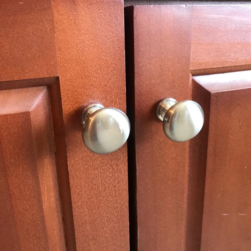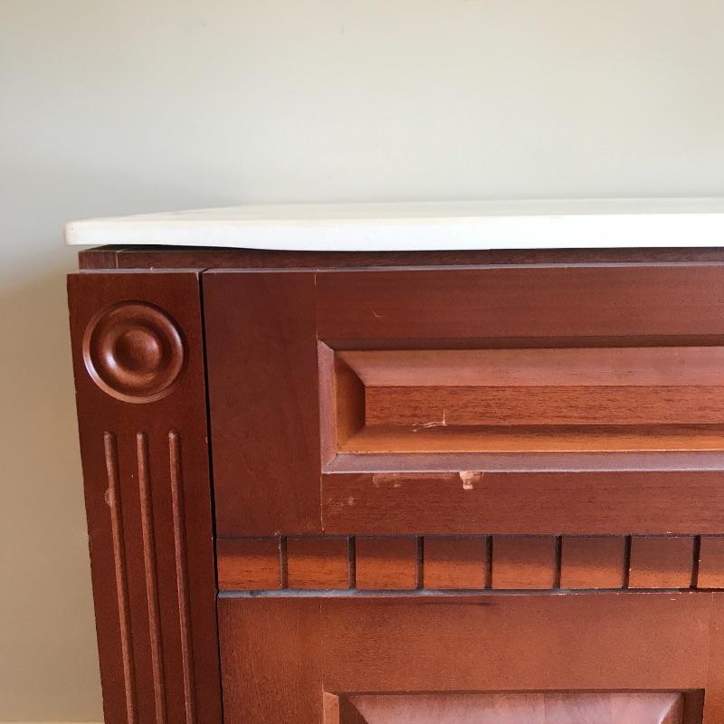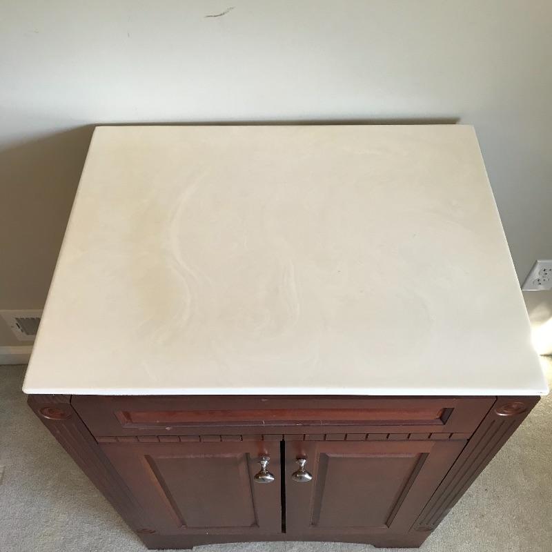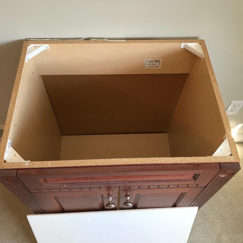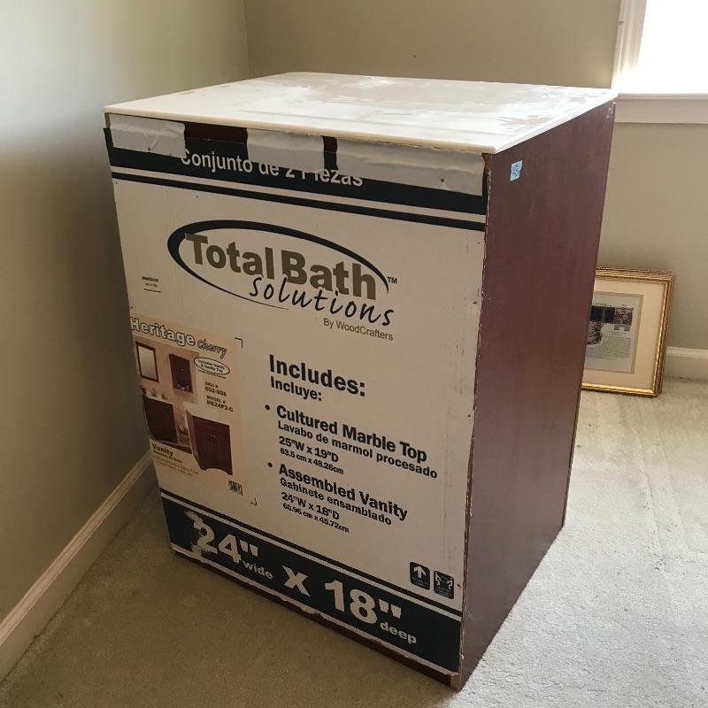 Many possibilities with this versatile cabinet. This cabinet could be the perfect storage solution in your kitchen or office! Total Bath Solutions bathroom vanity cabinet. Piece has a nice design on a beautiful medium brown stained wood. This cabinet appears to be a mix of pressed and solid wood with a cardboard backing, ready for you to add a sink! Piece has metal pulls, a faux drawer front, and a removable cultured ivory marble top. Cabinet measures approximately 24” x 18.5” x 32” as pictured with marble top. See photos, some wear is present. Local pick up only.