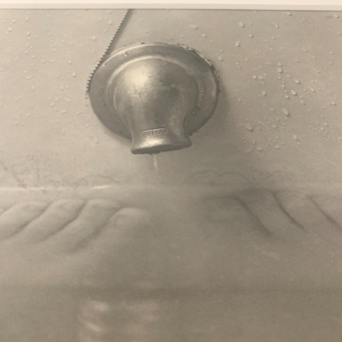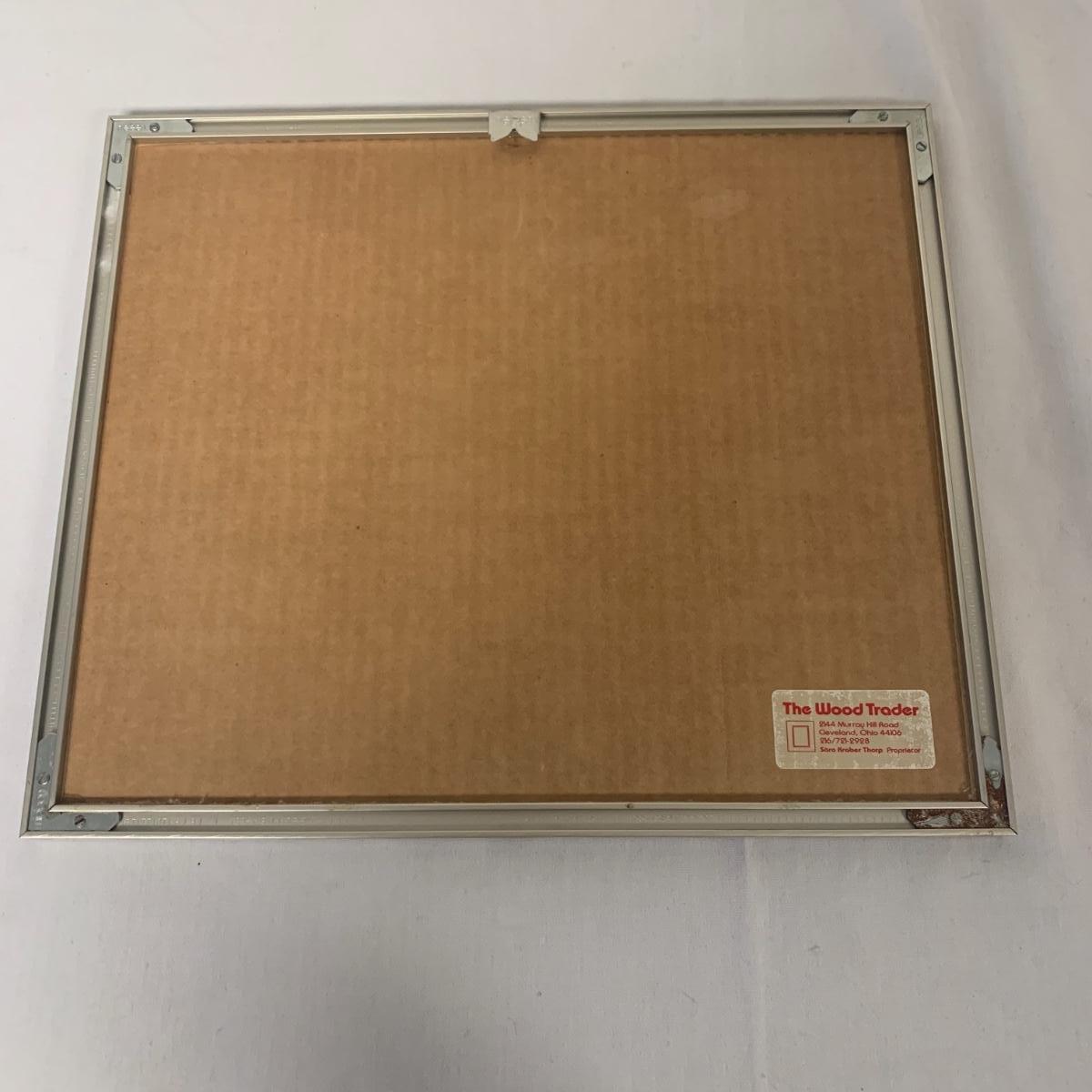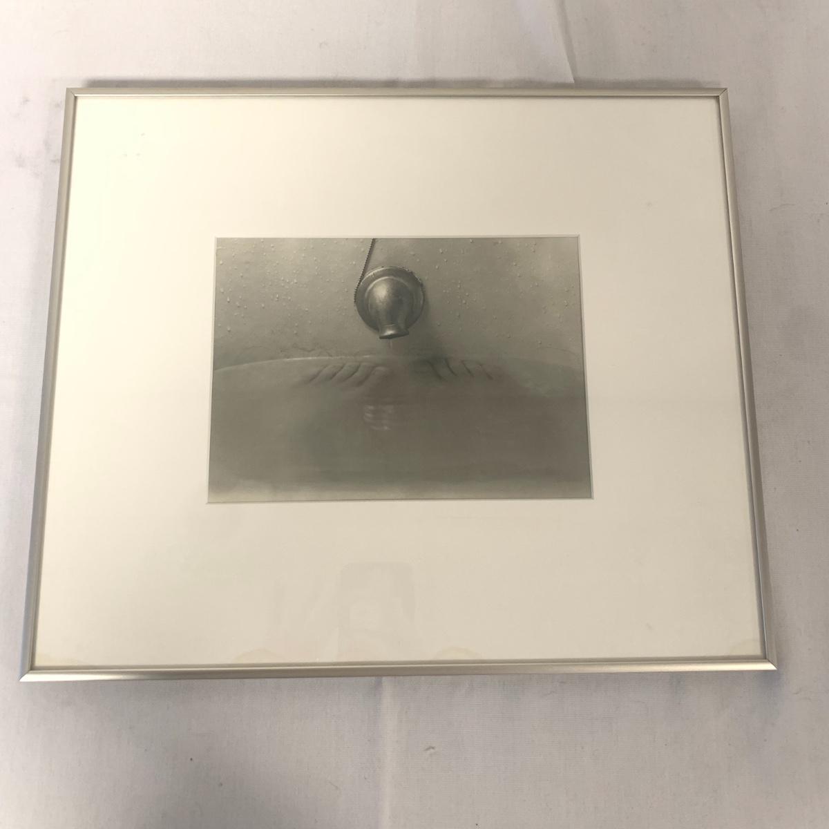 This lot includes one black and white bathtub art. The art is in a metal frame and is matted. The art itself is a little over 8” x 6” There appears to be no signature or name on the art piece. There is some light yellowing on the mating (see photos). There also appears to be some black fuzzy swirls on the art, it is unclear if this is part of the art or has some other cause (see photos). The metal frame measures about 15.5" x 13". Shipping available.