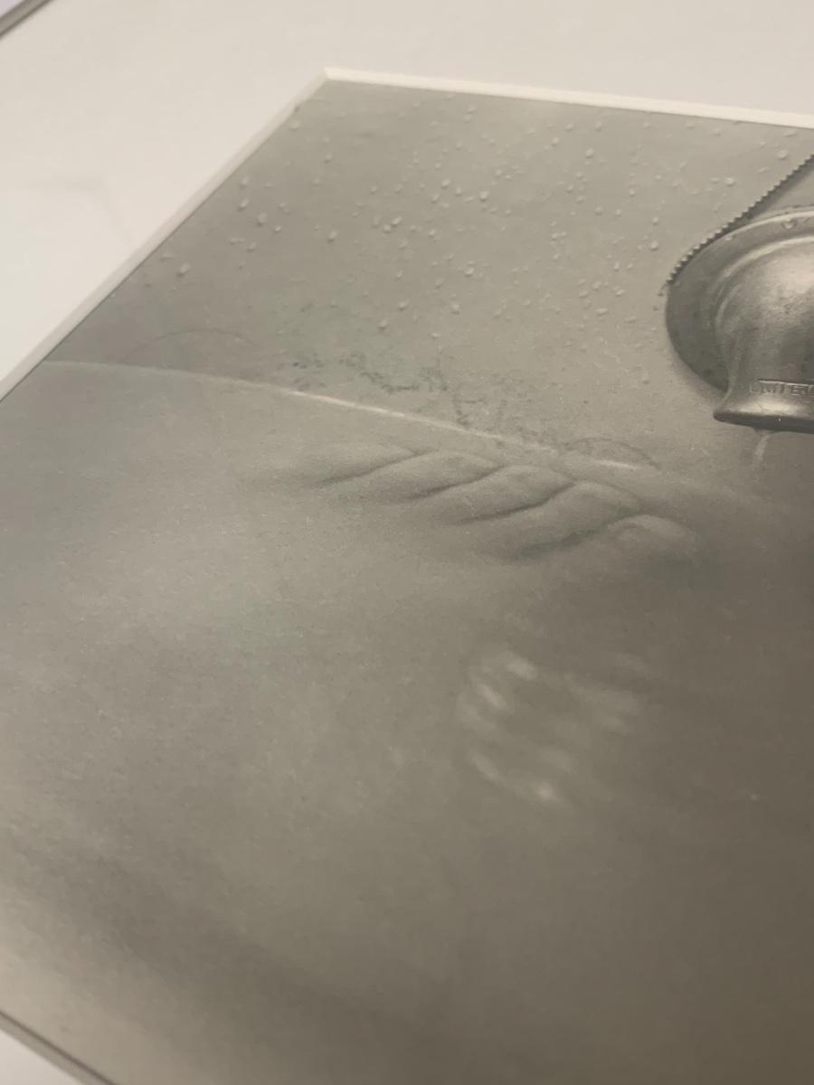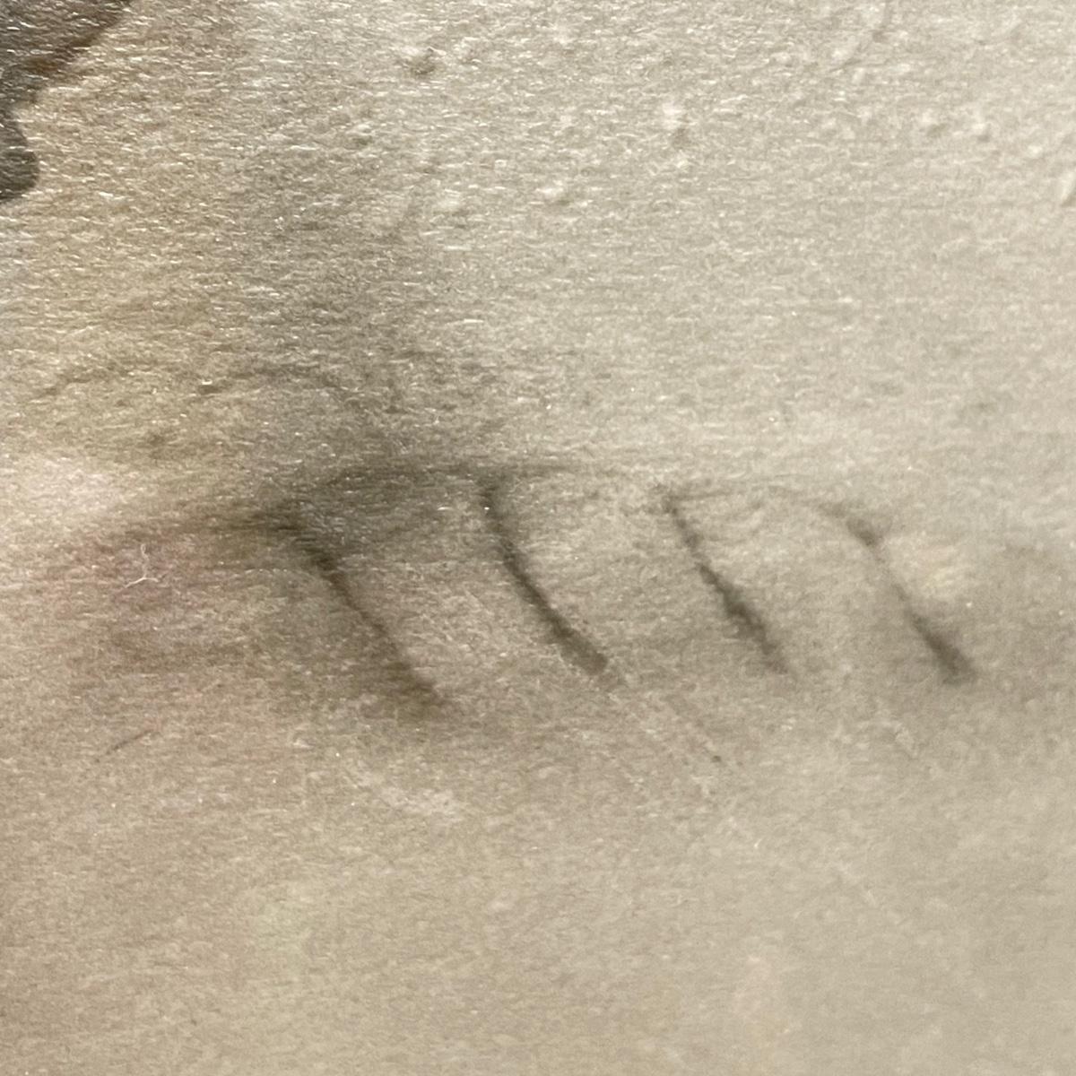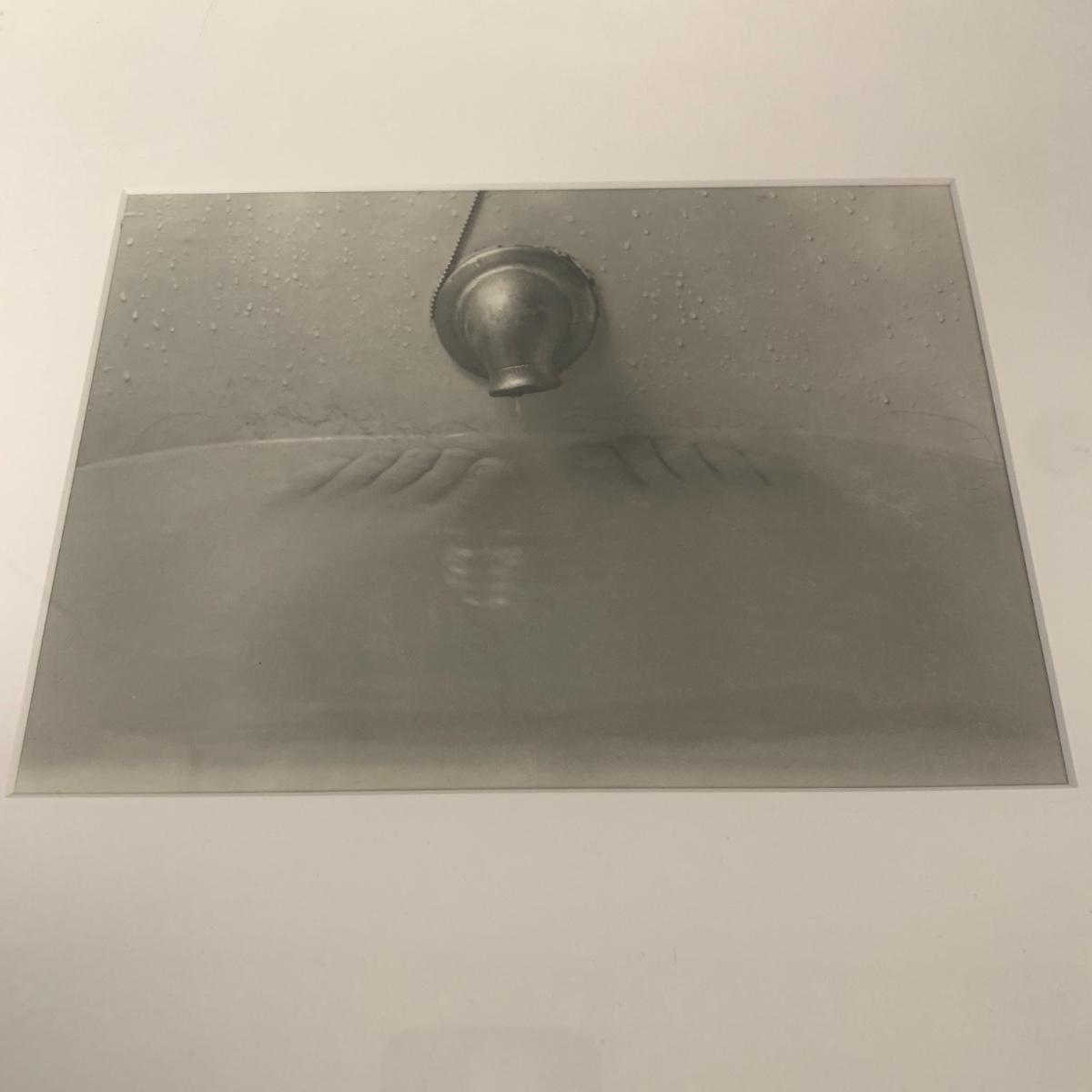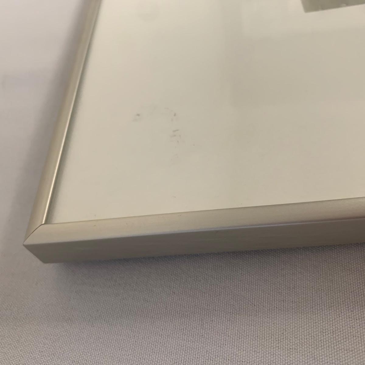 This lot includes one black and white bathtub art. The art is in a metal frame and is matted. The art itself is a little over 8” x 6” There appears to be no signature or name on the art piece. There is some light yellowing on the mating (see photos). There also appears to be some black fuzzy swirls on the art, it is unclear if this is part of the art or has some other cause (see photos). The metal frame measures about 15.5" x 13". Shipping available.