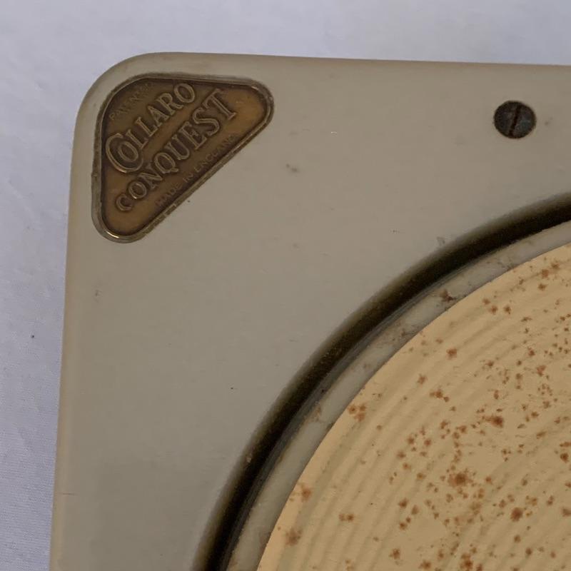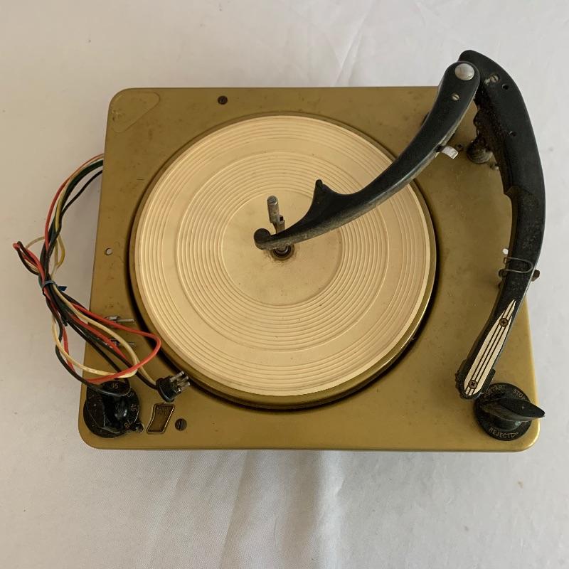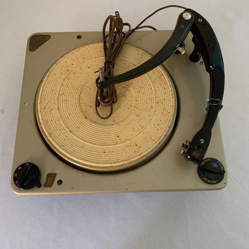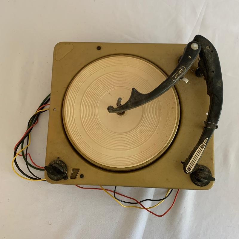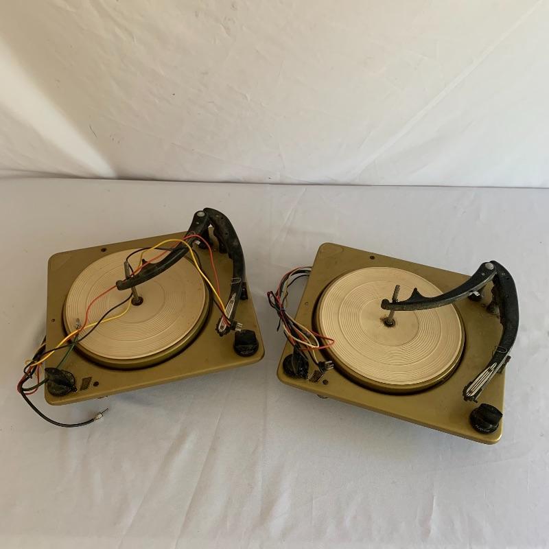 Lot of three Collaro Conquest four-speed turntables. None have a base or lid. Two don’t have electrical plugs. The third does have an electrical plug but does not seem to turn on when plugged in.