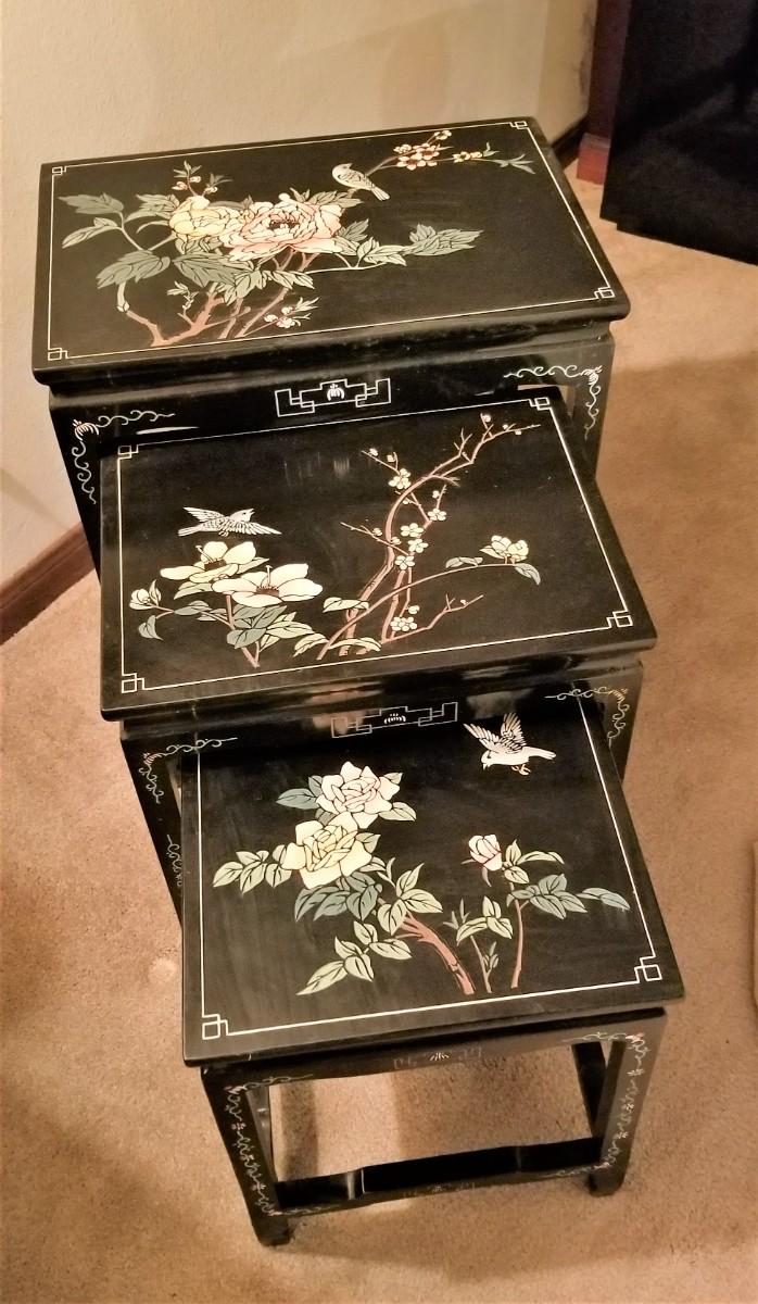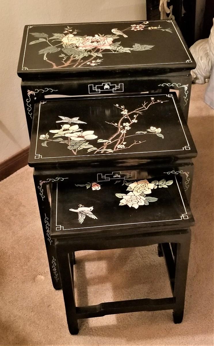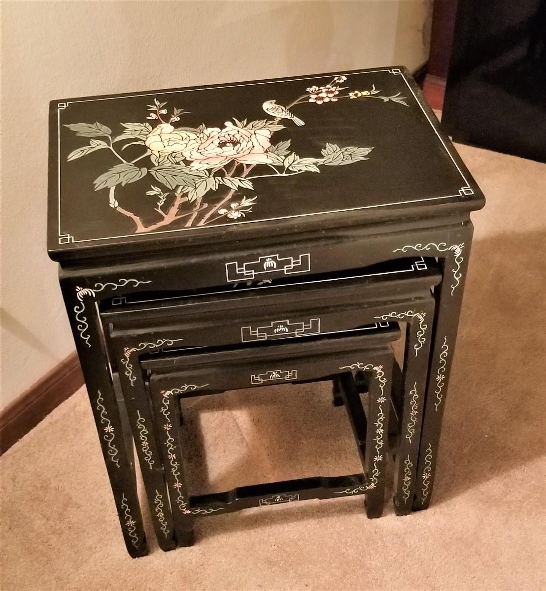 Set of three contemporary Asian-style nesting tables. Gently used. Largest is 14.5" x 21", 25" tall.