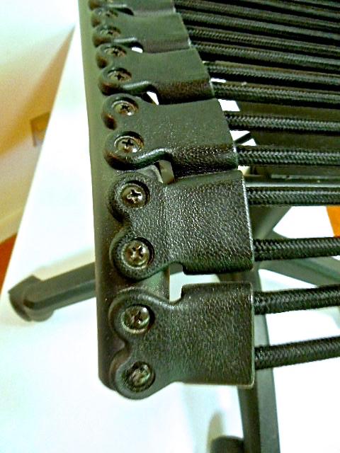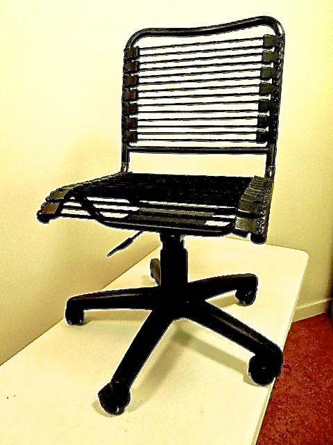 Modern Eurodesign rolling office chair. Features black elastic band flexible seat and with metal frame. This comfortable office chair features a bungie cord seat and backrest. A pneumatic height adjustment lifts the seat from 17 inches to 20 inches high, while a low back design and five caster wheels complete this stylish office chair.