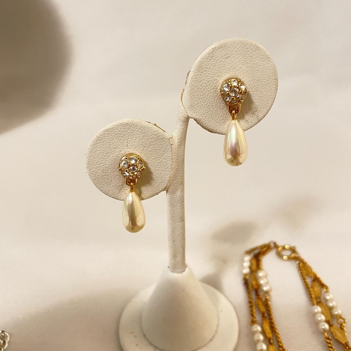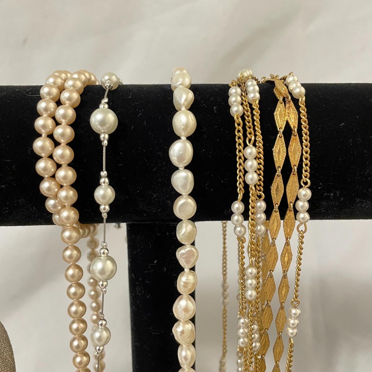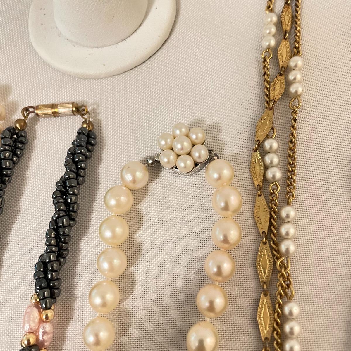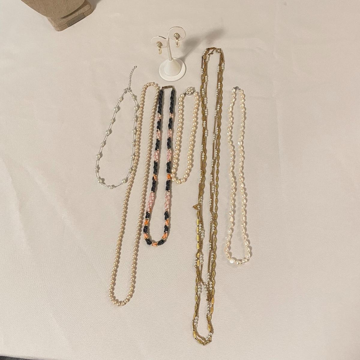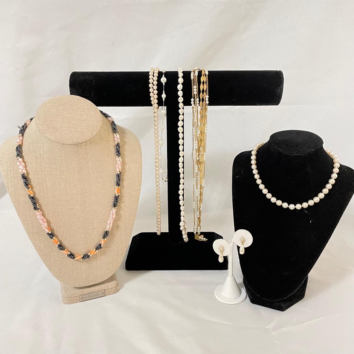 A beautiful variety of pearly jewelry perfect for casual and elegant attire. Lot features six necklaces with many colors and styles including Mother of Pearls and silver/golden metal accents. Necklaces range from smallest at 12” and the longest at 36”. One pair of post earrings will dazzle your look. See images. Shipping available.
