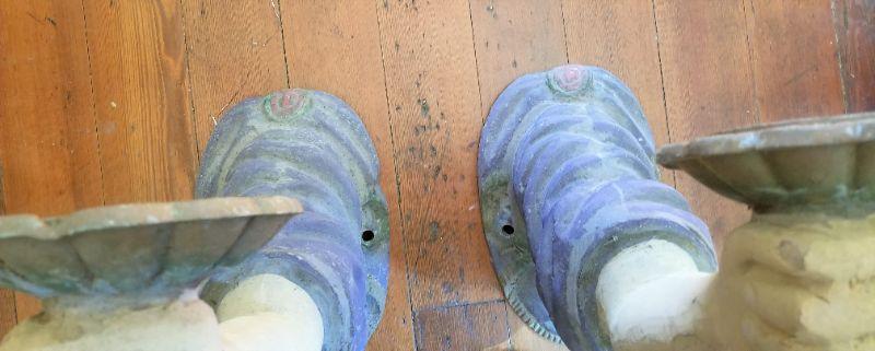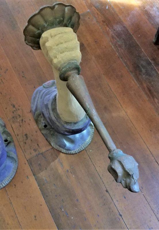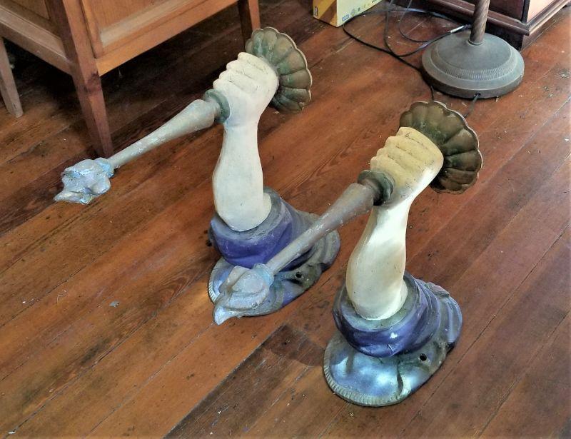Very interesting pair of antique painted metal Arm sconces - could be wired or use as candle holders. Attic find. 18.5" top to bottom, base is 13" tall, 20" deep. Bases have screw holes for mounting on wall.