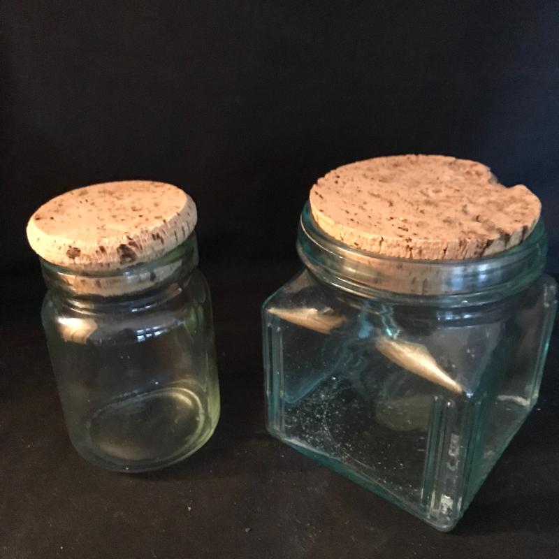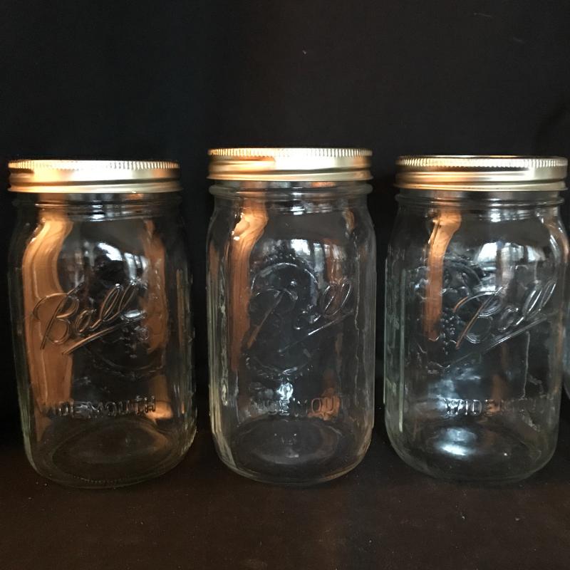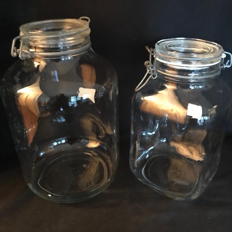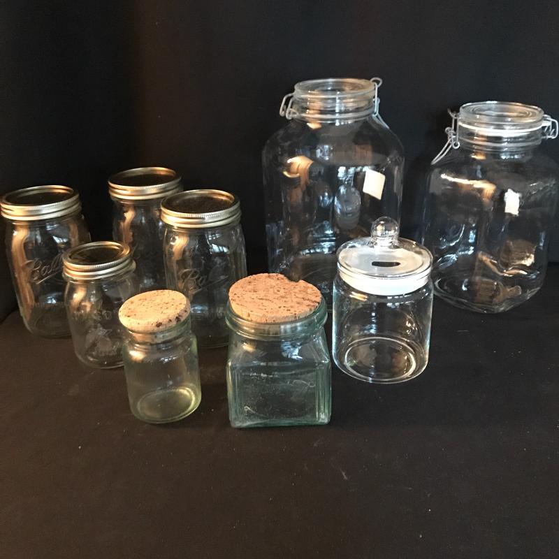 Nine miscellaneous glass storage containers. Three wide mouth Ball jars with lids. One small Mason jar. Two jars with cork lids. One jar with sealed lid. Two large containers from Italy (one is 3-liter and one is 5-liter). No shipping. Local pick up only in Flat Rock, NC.