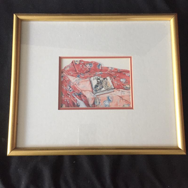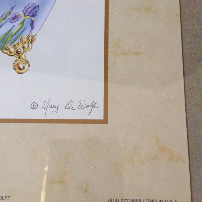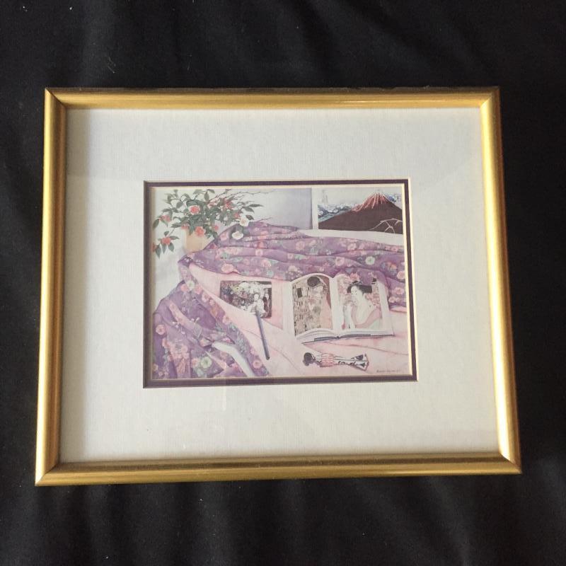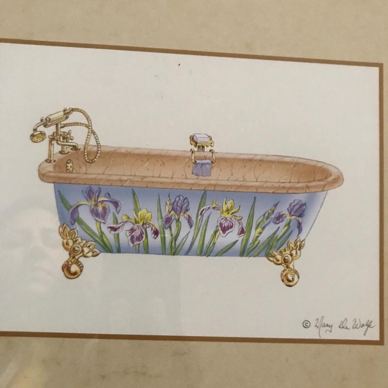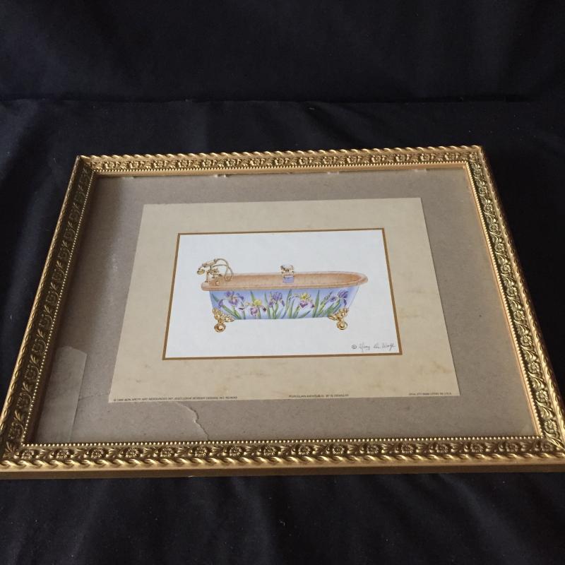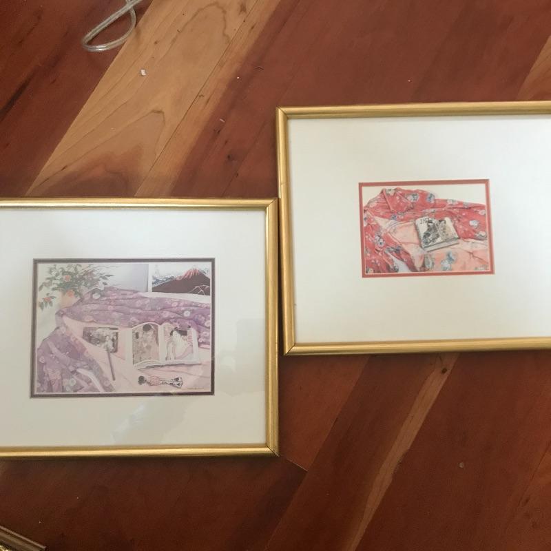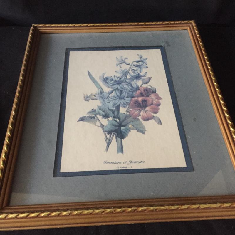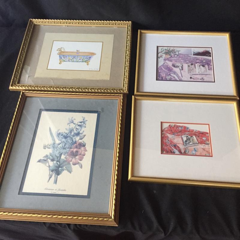 Four gold colored picture frames with artwork. Enhance your walls with these lovely pieces of art. Largest Frame measures 13.5” x 15.75”.