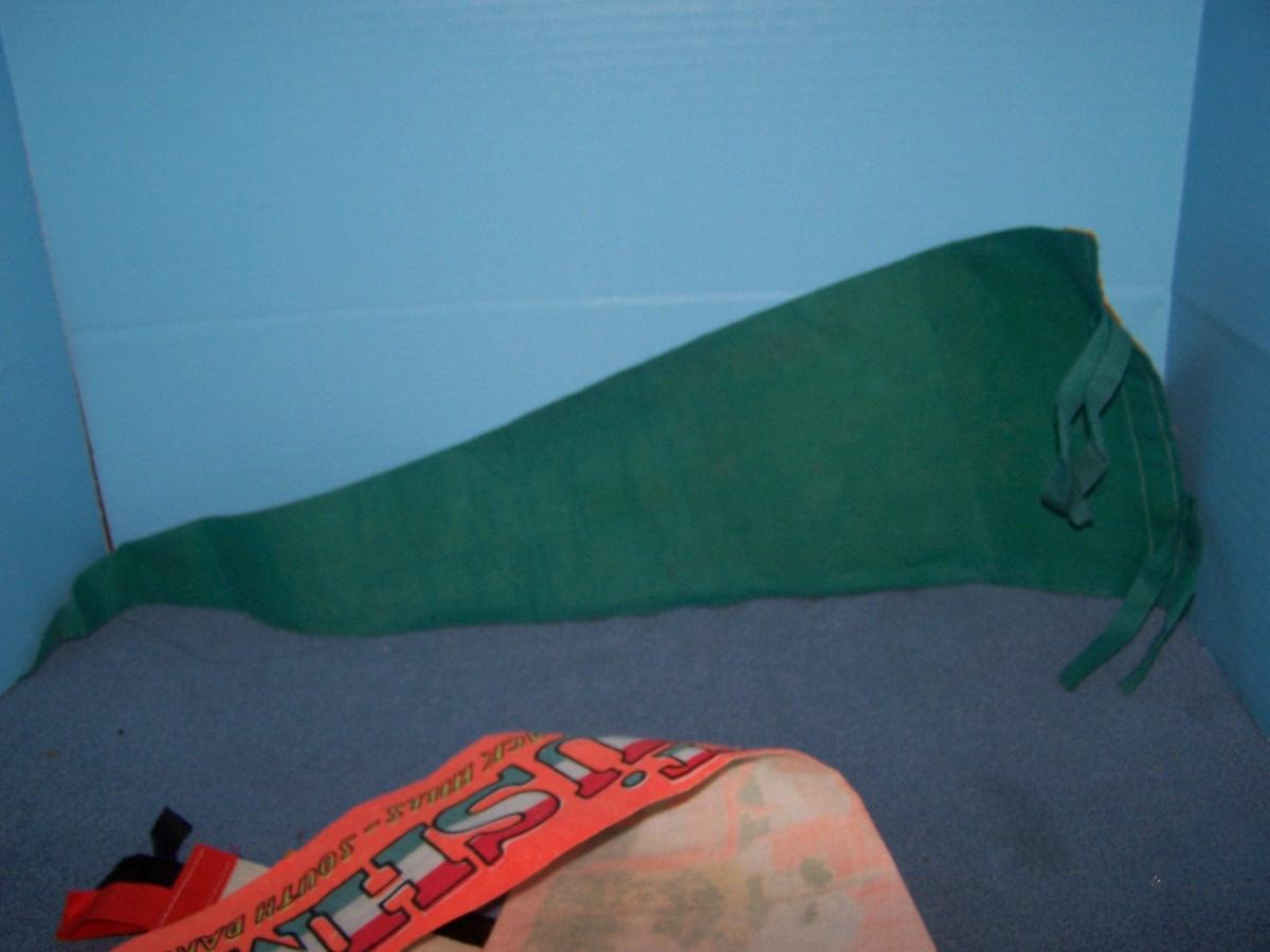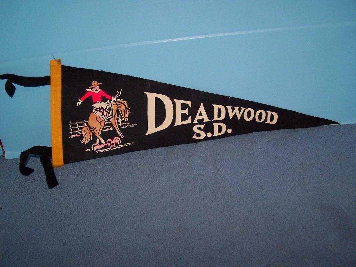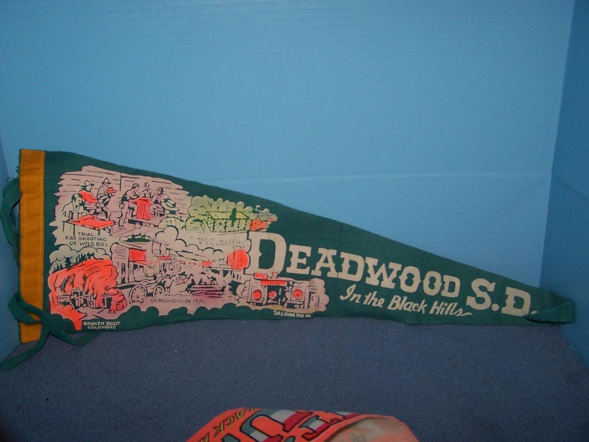 THESE ARE GREAT VINTAGE PENNANTS!!! BLACK DEADWOOD-21'', WITH FRINGE... SOME WEAR/WRINKLES AND MISSING TIP...
