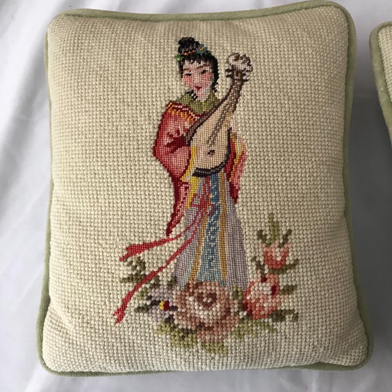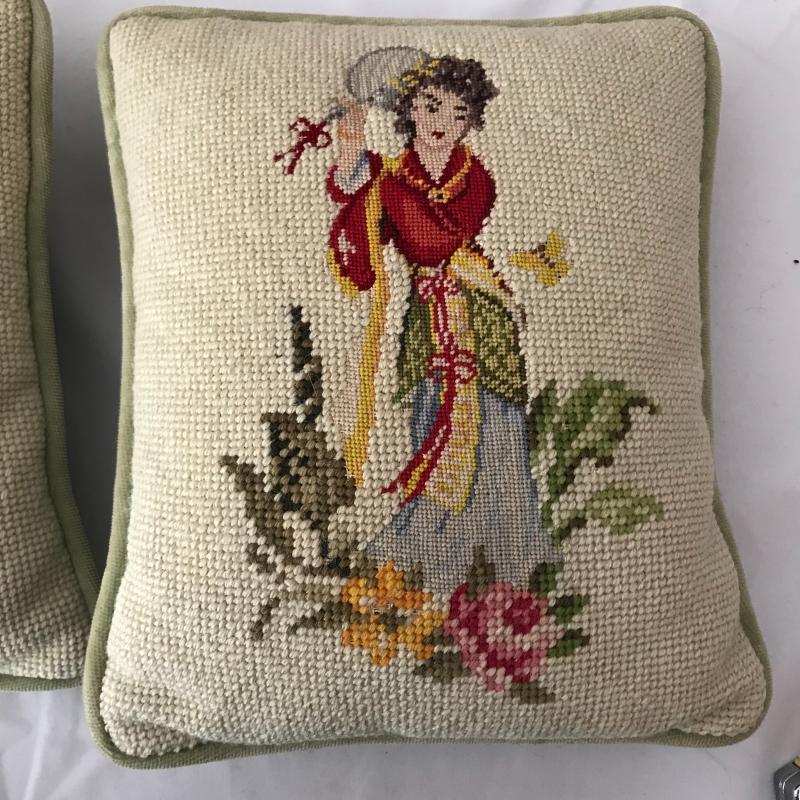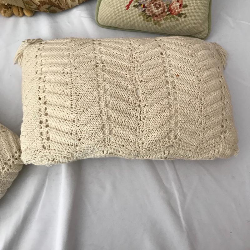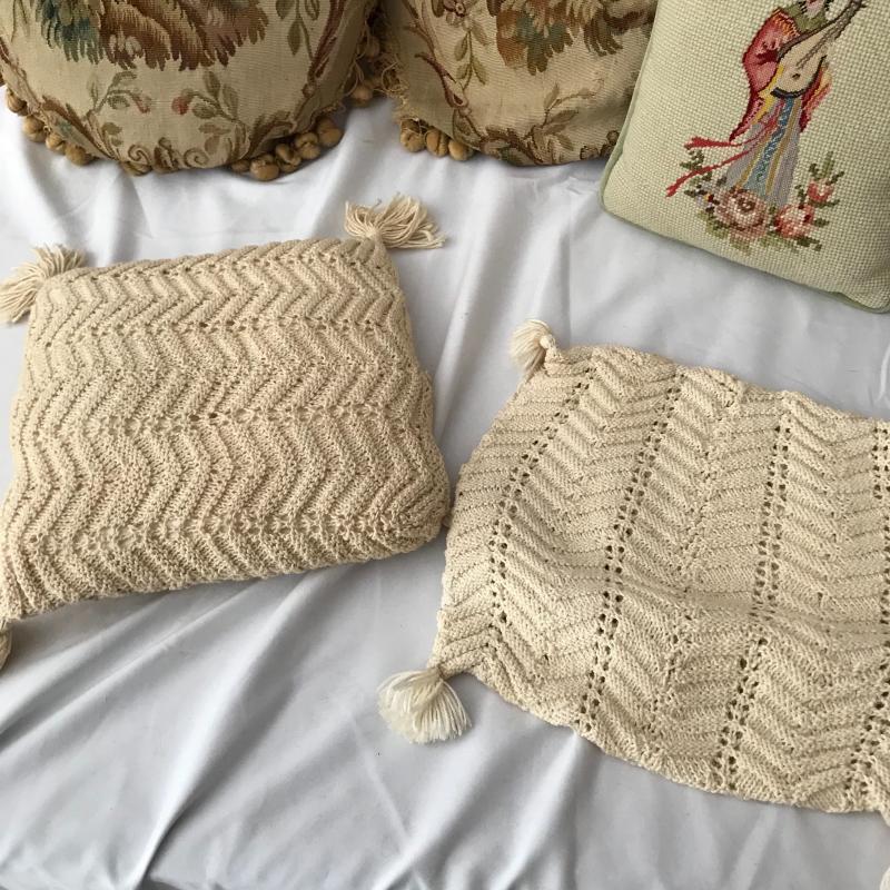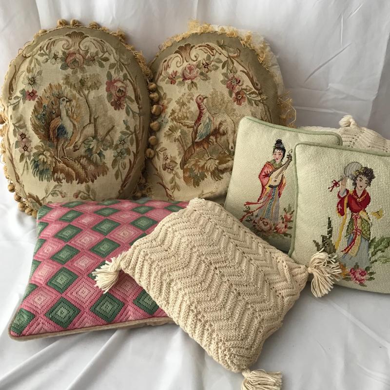 Lot contains 8 pillows and one pillowcase. Three of the pillows are needlepoint, four are crocheted (including pillowcase) and the two with birds are made from antique upholstery fabric. Largest (bird) pillows are approx. 17” tall and need some reinforcing. See pics. Shipping available or local pickup in Asheville, NC.