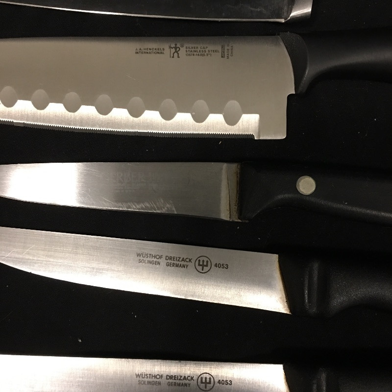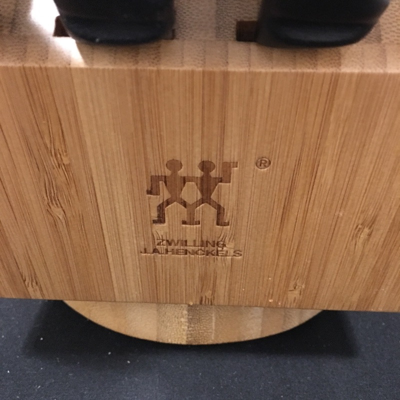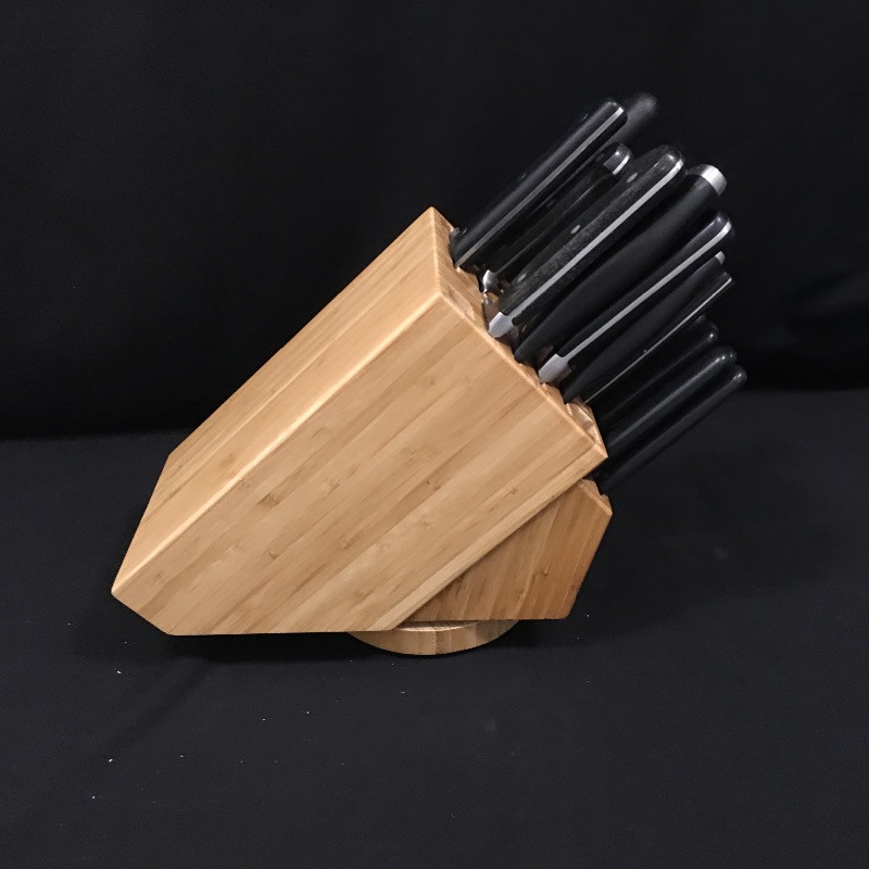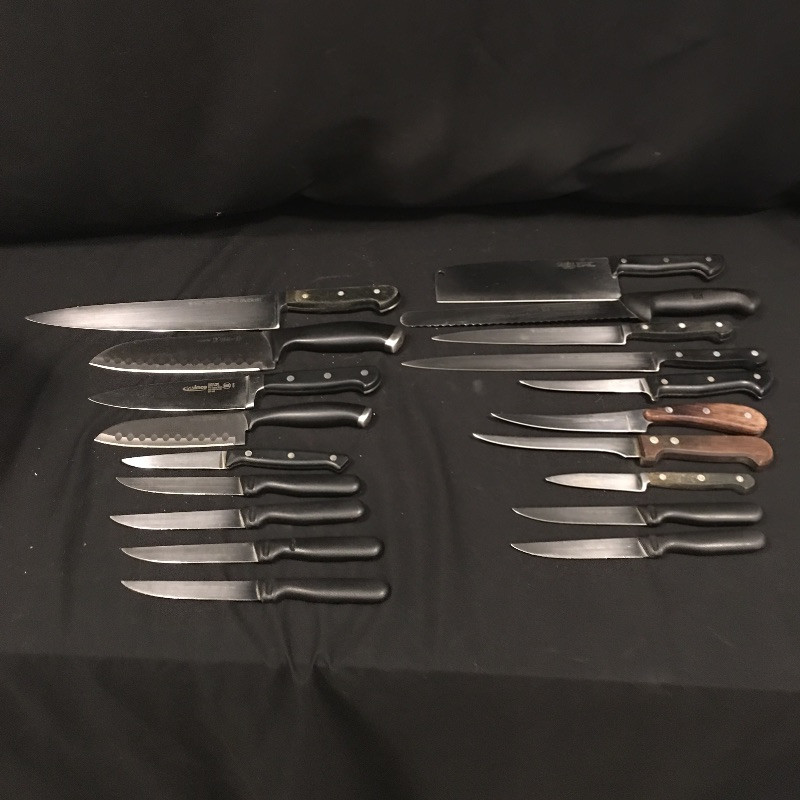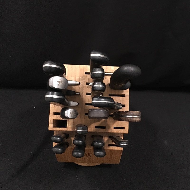 A knife for many tasks with this Henckels swiveling knife block with eighteen knives including Gerber, Henckels, Dreizack and Winco brands, see pictures. Largest knife measures 15.25” long.