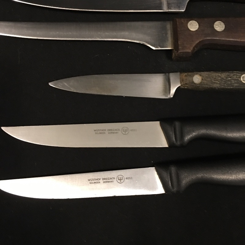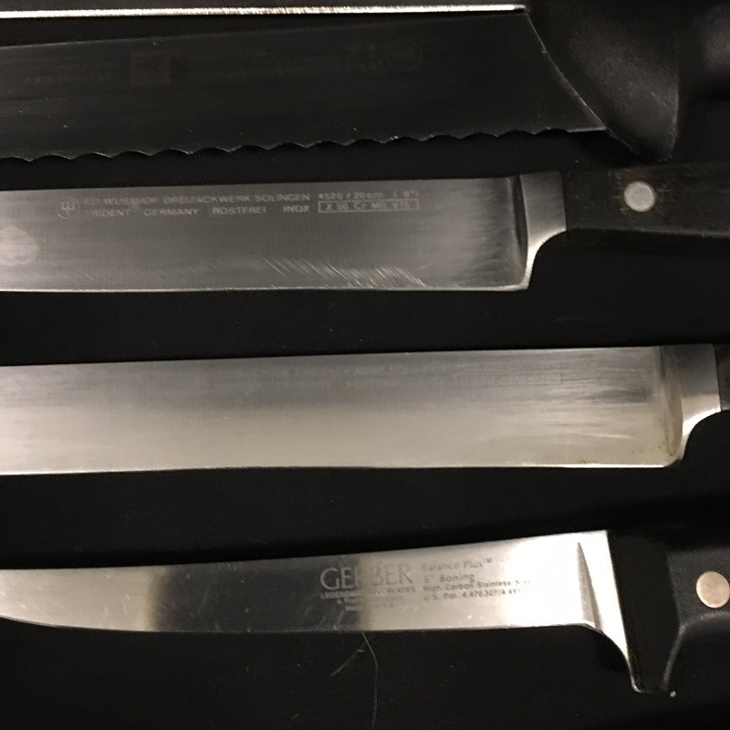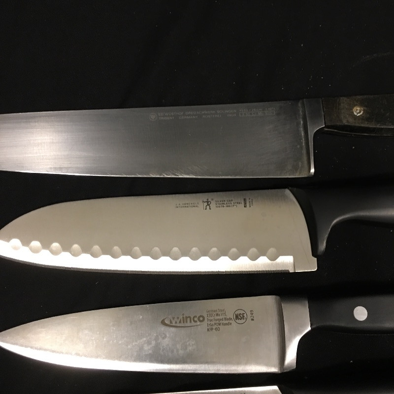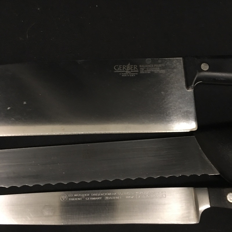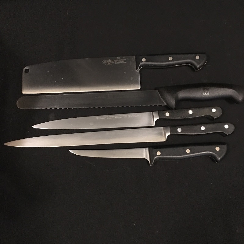 A knife for many tasks with this Henckels swiveling knife block with eighteen knives including Gerber, Henckels, Dreizack and Winco brands, see pictures. Largest knife measures 15.25” long.