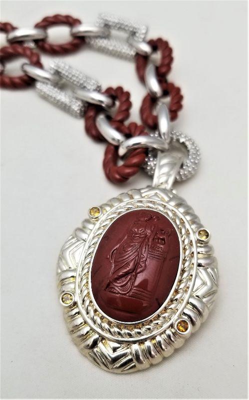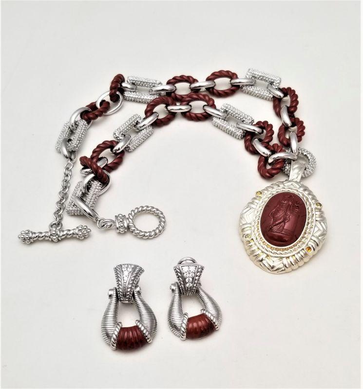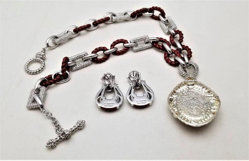 Another knock-out Judith Ripka Sterling Silver necklace with matching sterling earrings. Toggle Clasp. Has Brooch/Enhancer in cameo style attached. Earrings are pierced leverbacks. Gently used - no box.