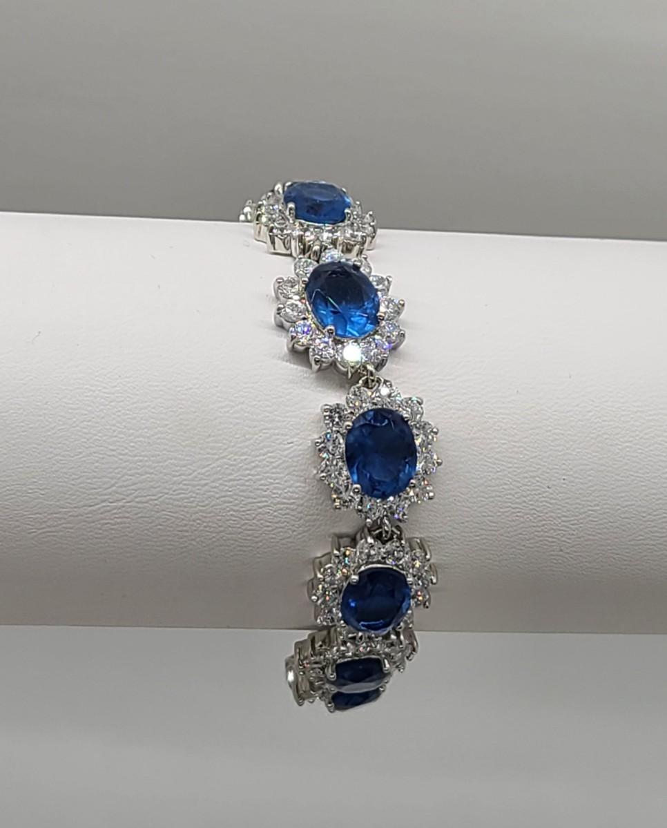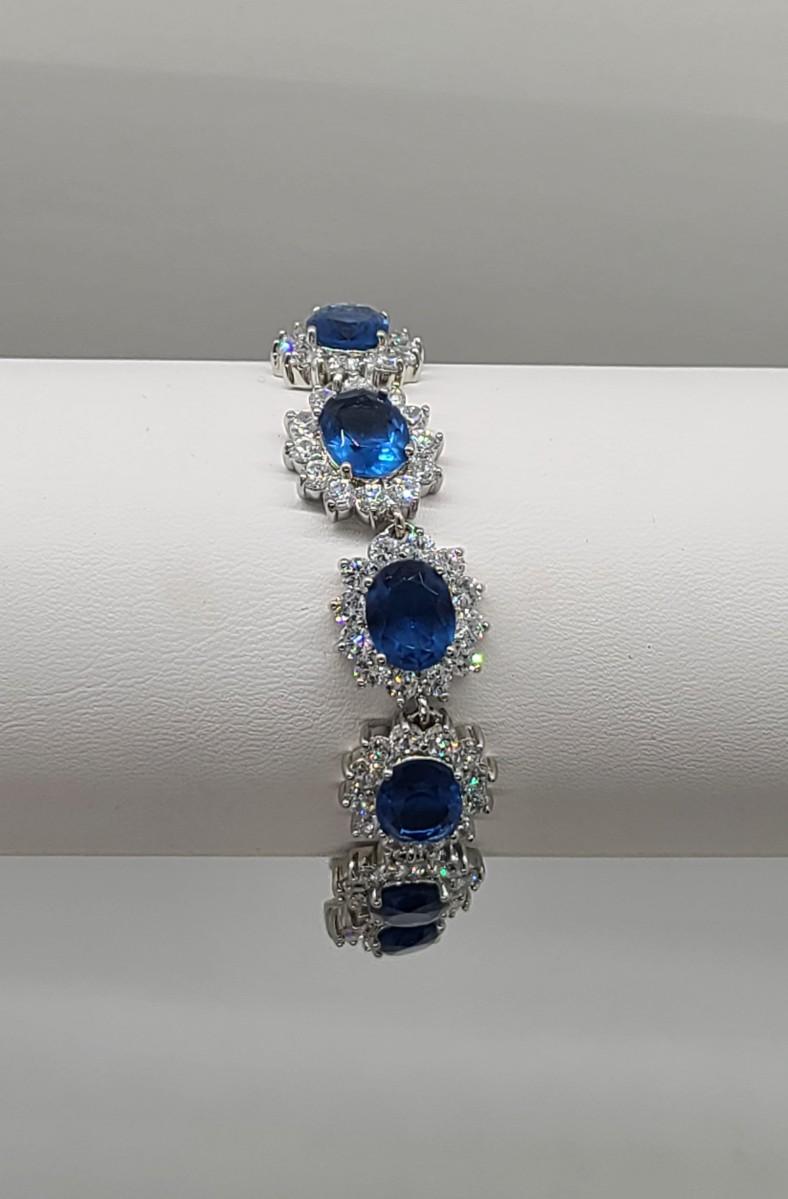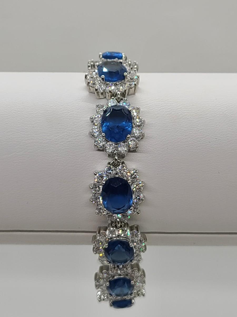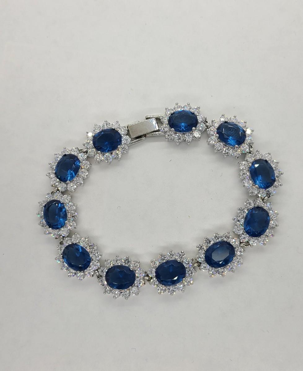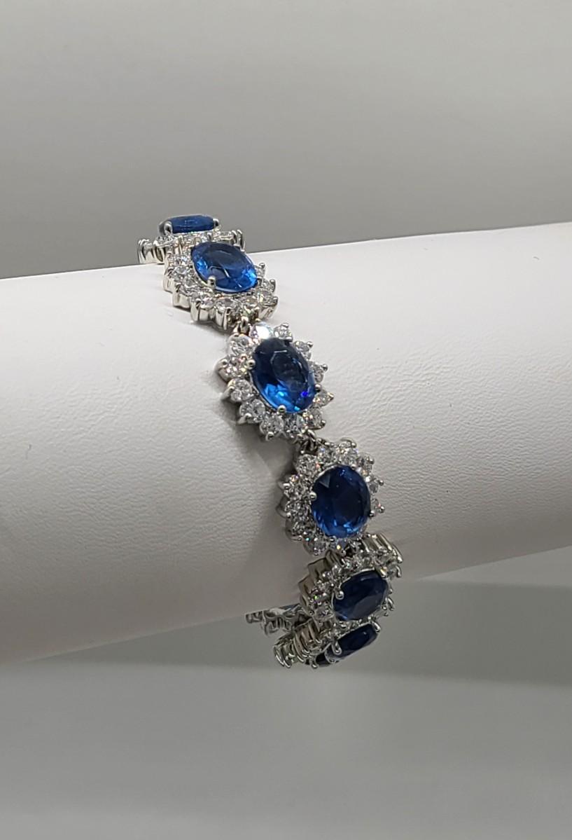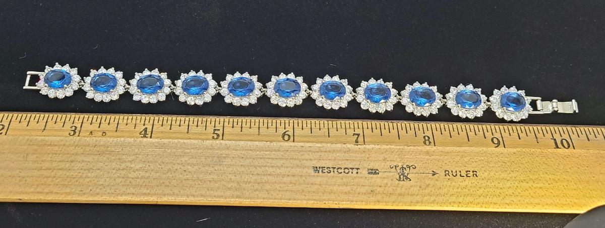 This piece is gorgeous! Lovely simulated oval sapphires encircled by cz's. This bracelet pops! This is high-end rhodium plated costume jewelry. The pictures show condition, measurements if taken, and what is included in the lot. Due to the large amount that we photograph and the time frame, we are not always able to take measurements. All items unless noted, are pre-owned and have been used, and are untested. Thank you