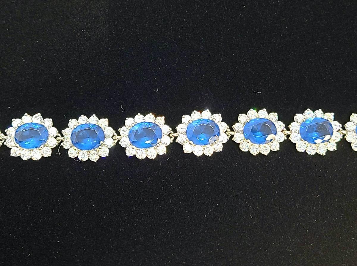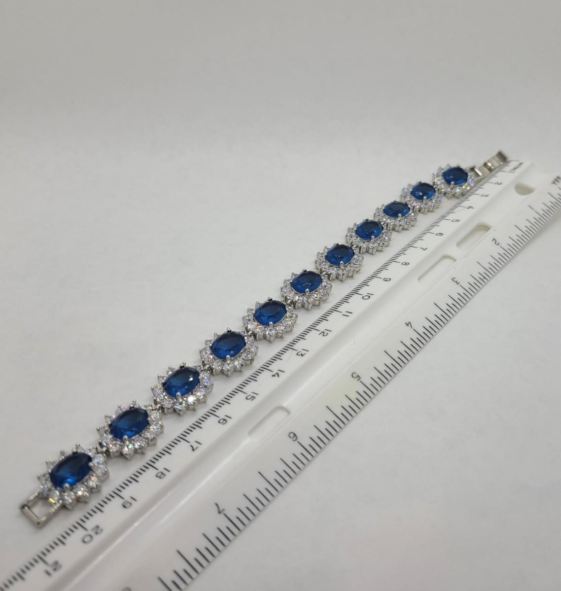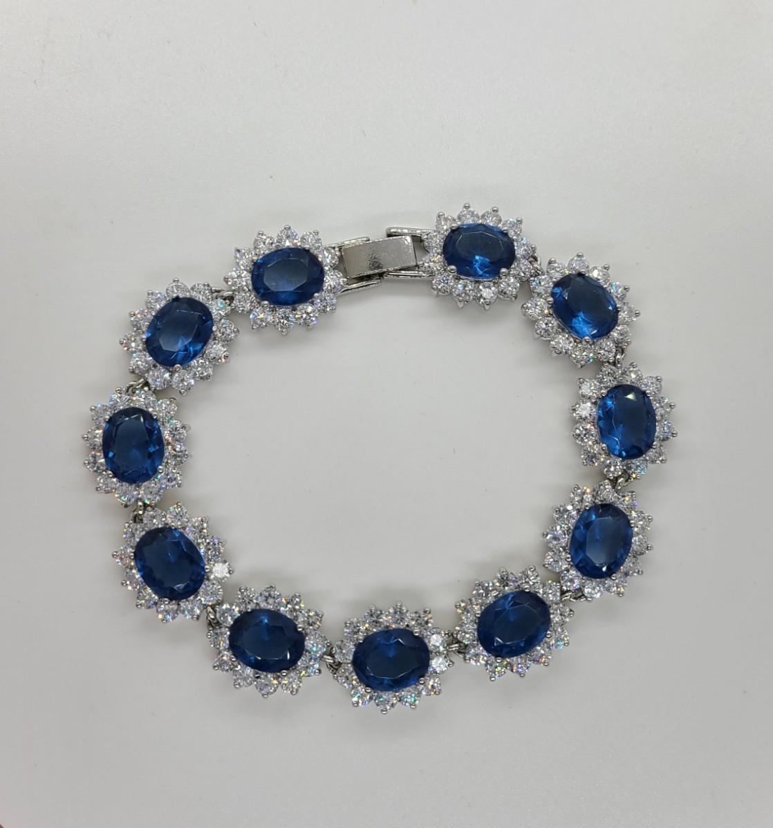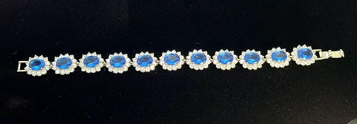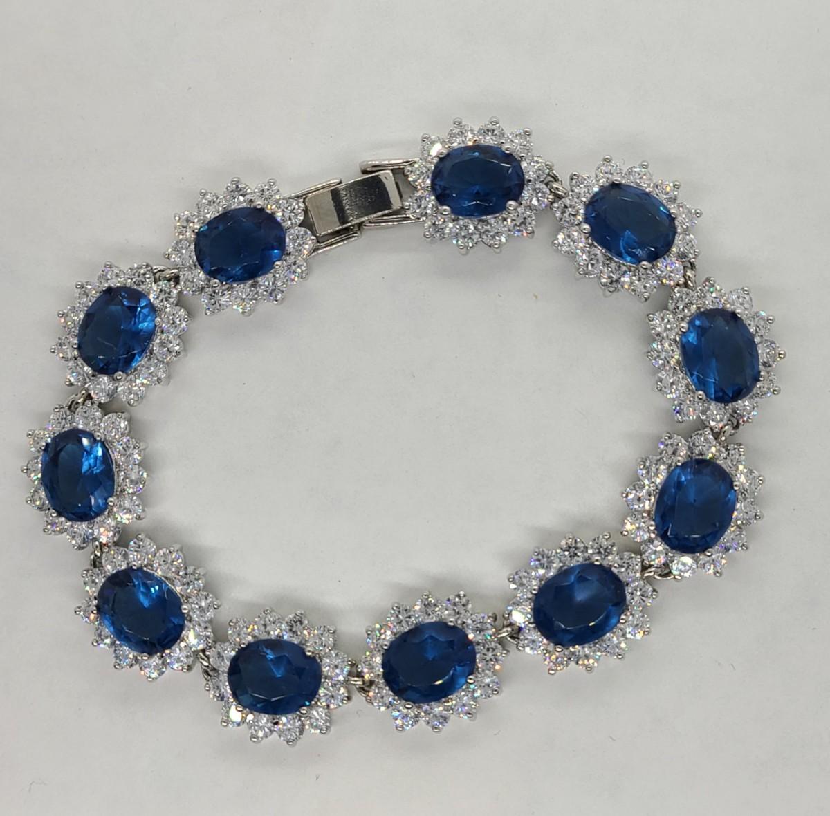 This piece is gorgeous! Lovely simulated oval sapphires encircled by cz's. This bracelet pops! This is high-end rhodium plated costume jewelry. The pictures show condition, measurements if taken, and what is included in the lot. Due to the large amount that we photograph and the time frame, we are not always able to take measurements. All items unless noted, are pre-owned and have been used, and are untested. Thank you
