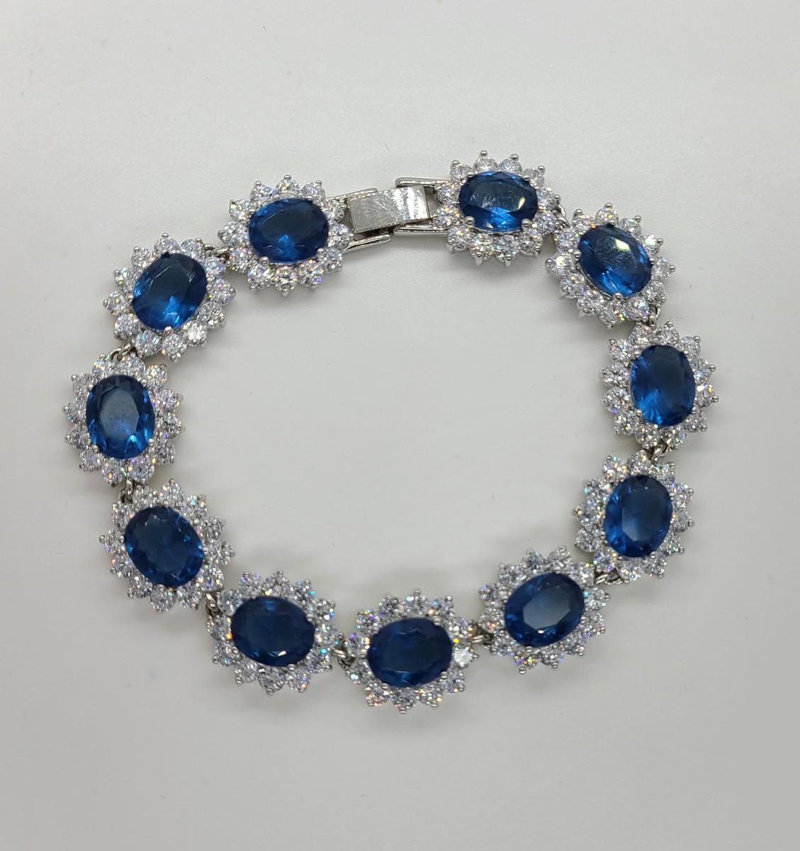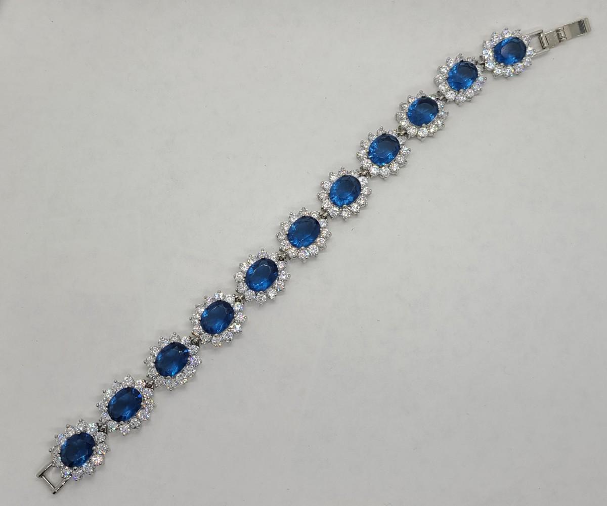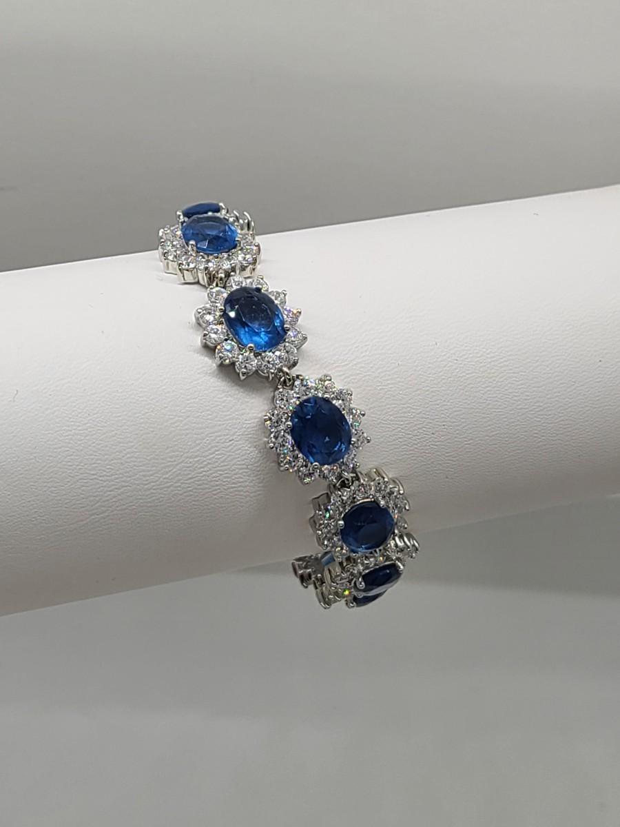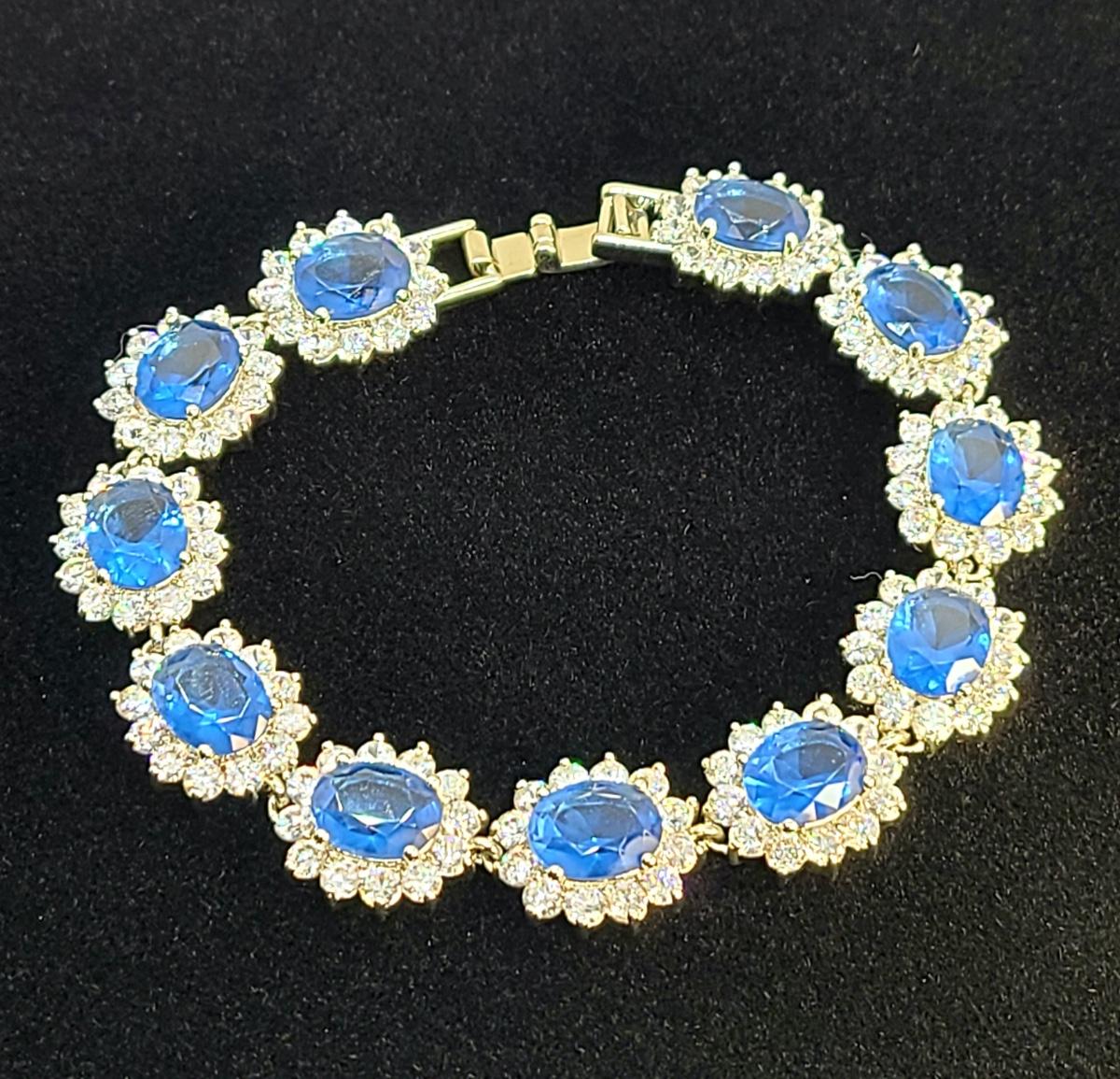 This piece is gorgeous! Lovely simulated oval sapphires encircled by cz's. This bracelet pops! This is high-end rhodium plated costume jewelry. The pictures show condition, measurements if taken, and what is included in the lot. Due to the large amount that we photograph and the time frame, we are not always able to take measurements. All items unless noted, are pre-owned and have been used, and are untested. Thank you