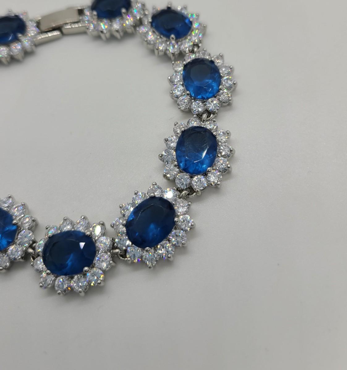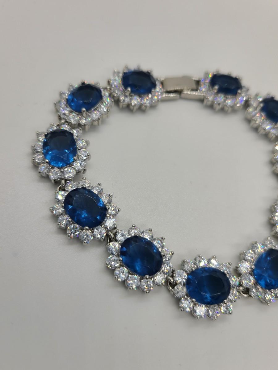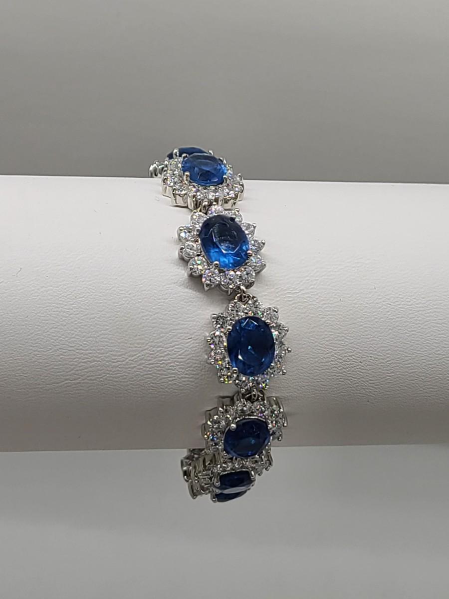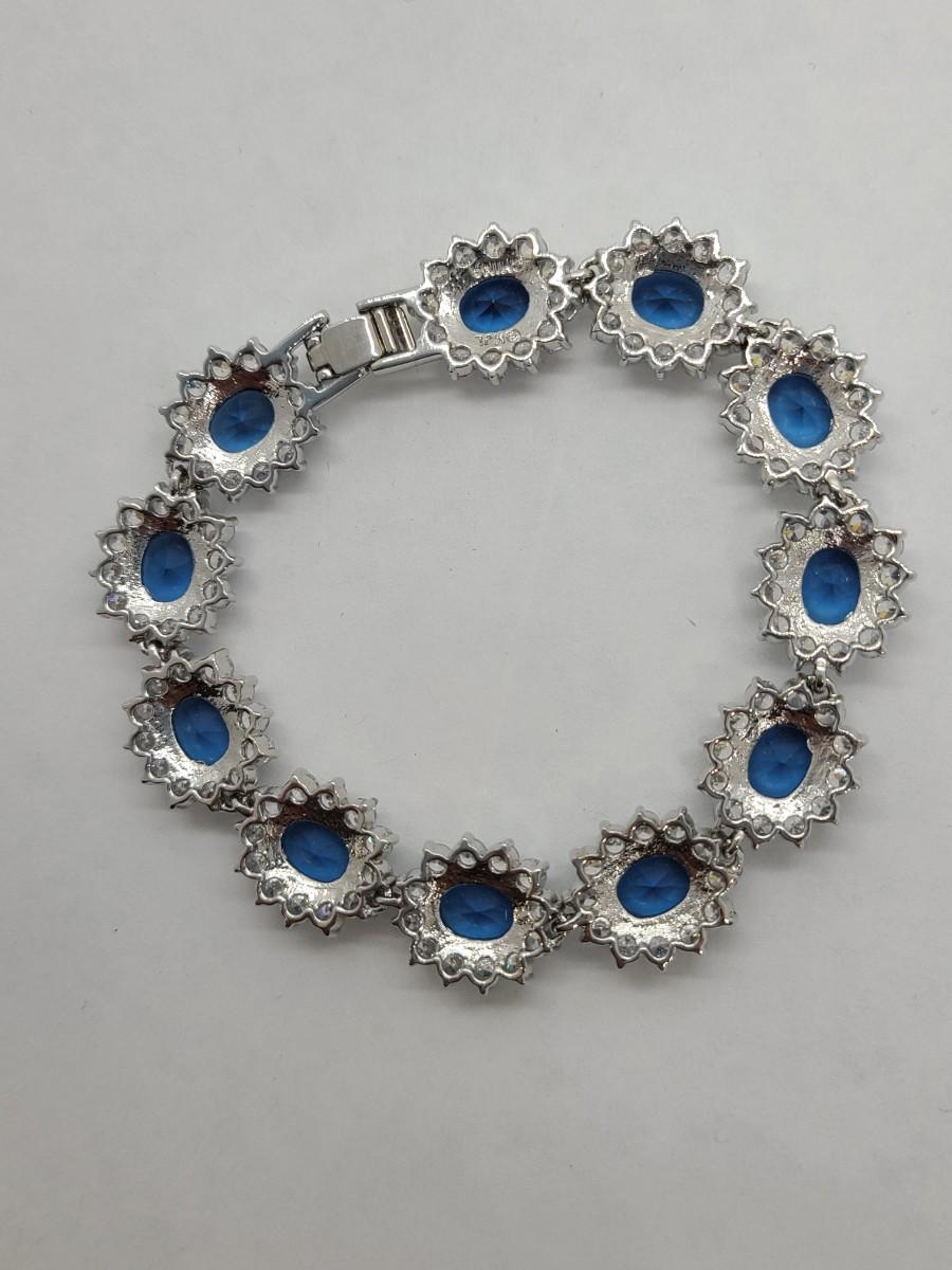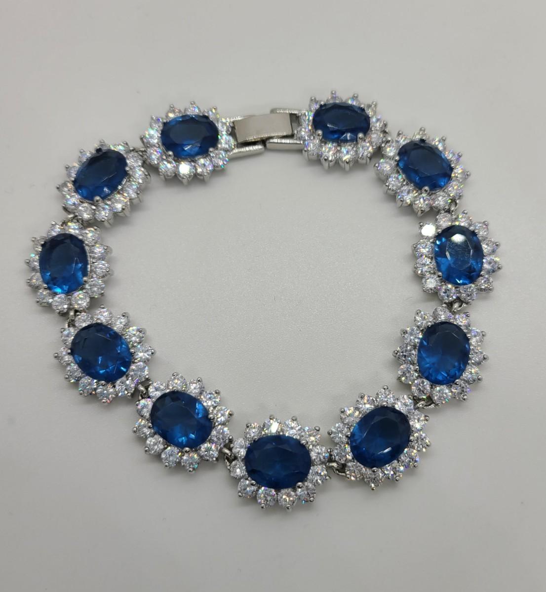 This piece is gorgeous! Lovely simulated oval sapphires encircled by cz's. This bracelet pops! This is high-end rhodium plated costume jewelry. The pictures show condition, measurements if taken, and what is included in the lot. Due to the large amount that we photograph and the time frame, we are not always able to take measurements. All items unless noted, are pre-owned and have been used, and are untested. Thank you