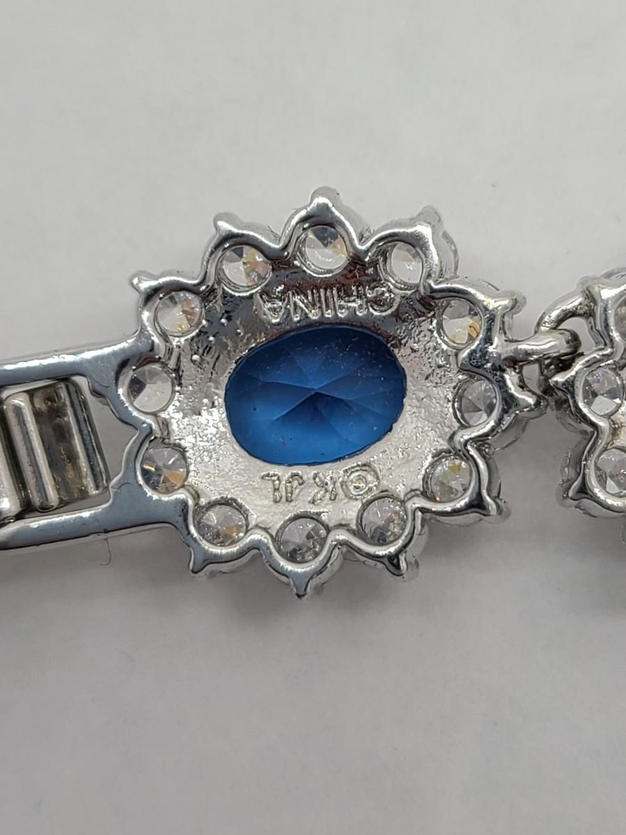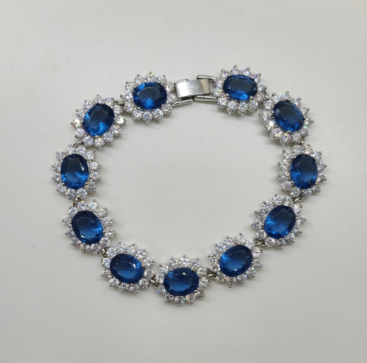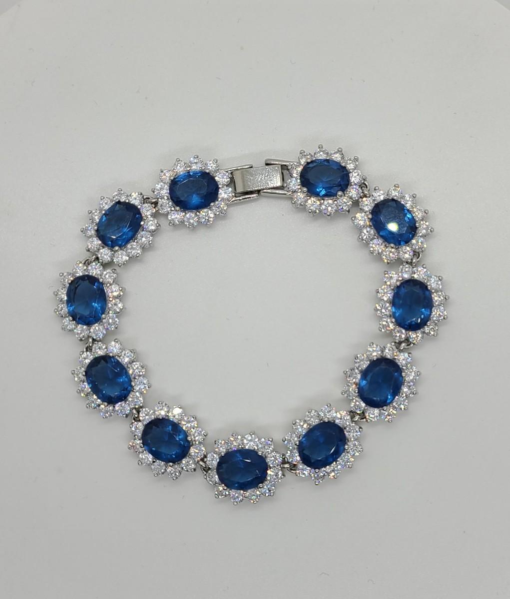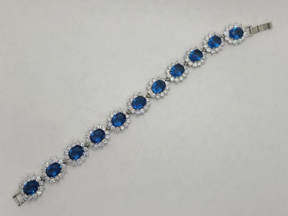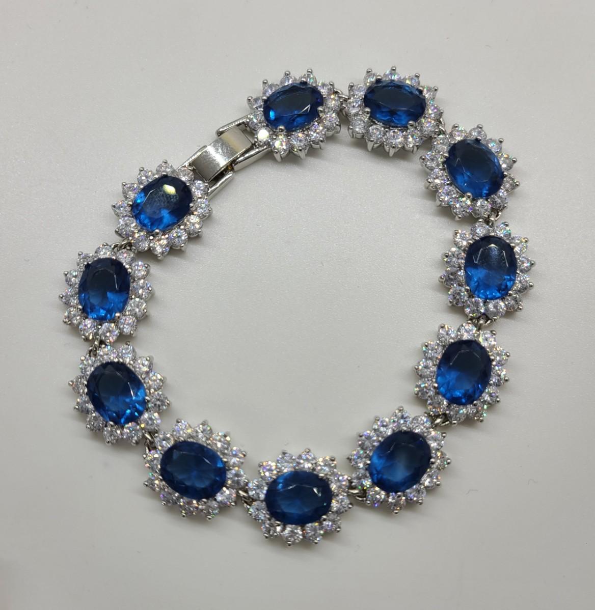 This piece is gorgeous! Lovely simulated oval sapphires encircled by cz's. This bracelet pops! This is high-end rhodium plated costume jewelry. The pictures show condition, measurements if taken, and what is included in the lot. Due to the large amount that we photograph and the time frame, we are not always able to take measurements. All items unless noted, are pre-owned and have been used, and are untested. Thank you