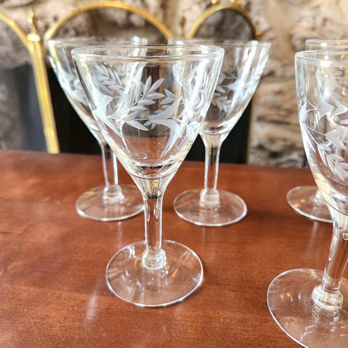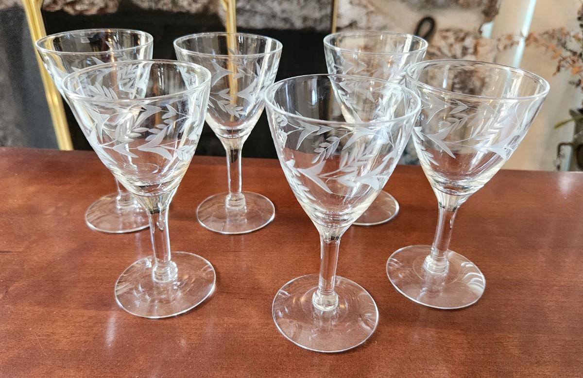 Pretty set of 6 Etched Vintage crystal cordial goblets, each 5" all - all in good condition.